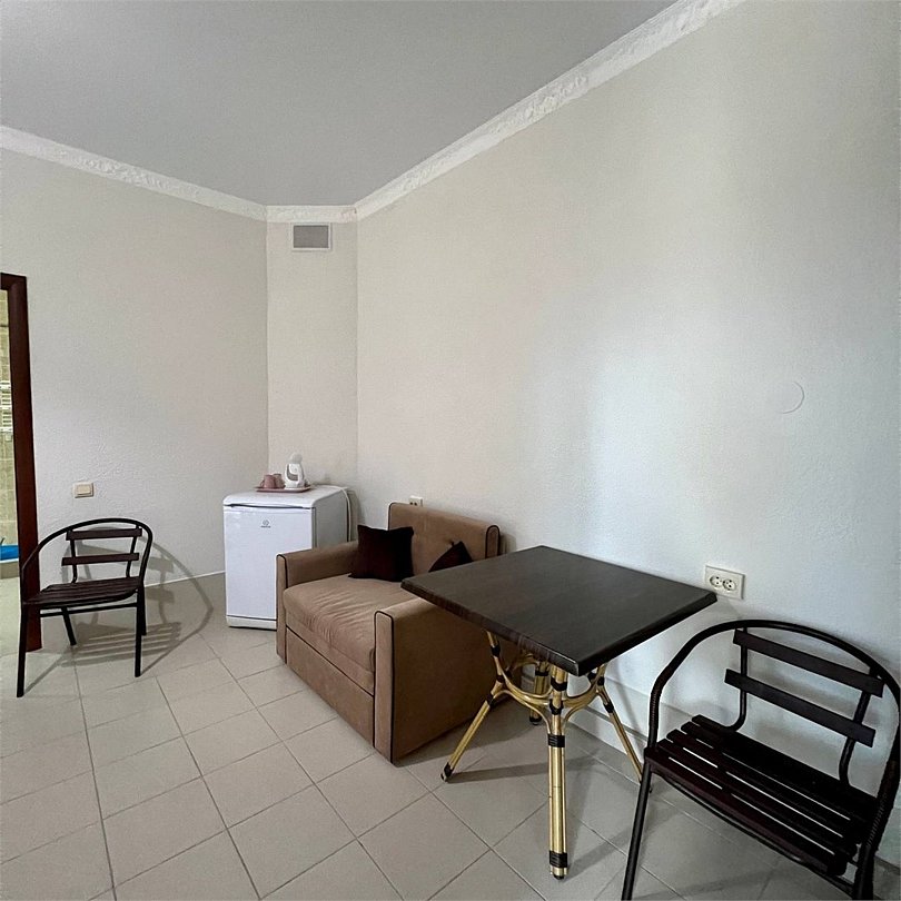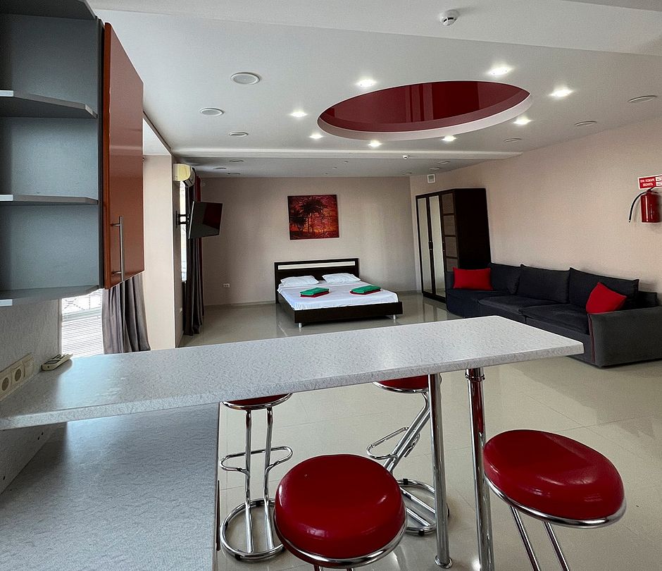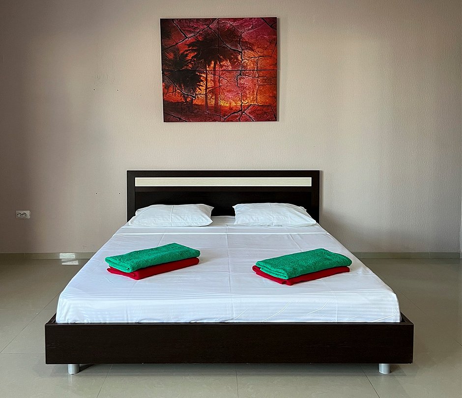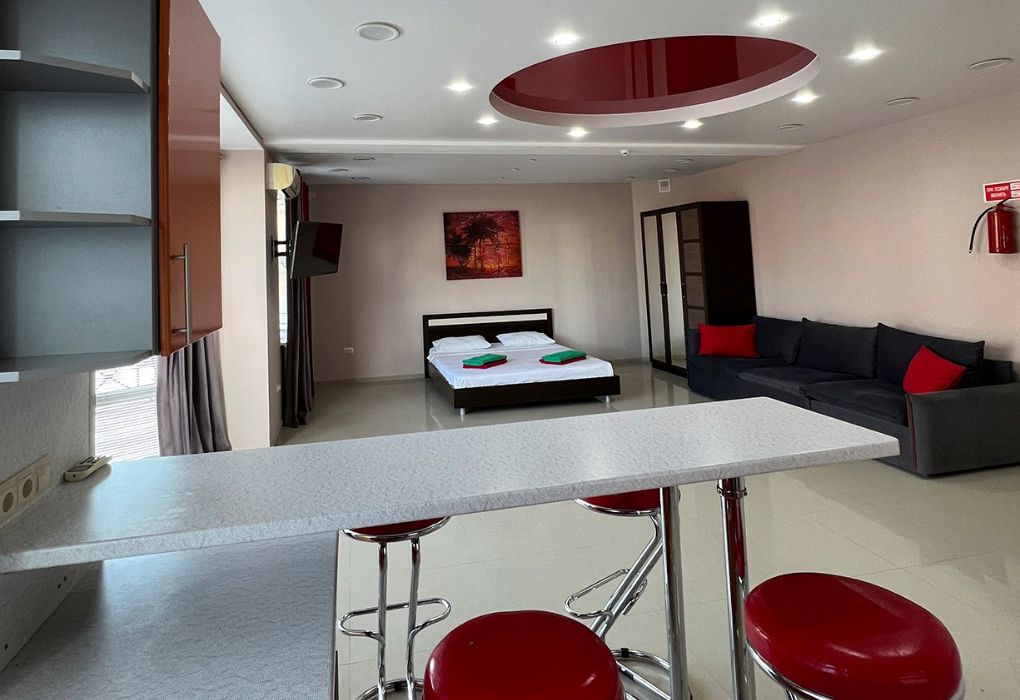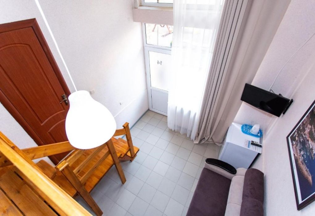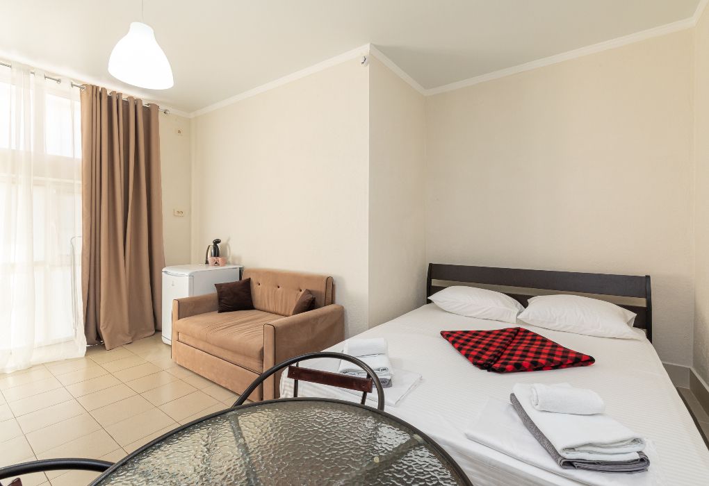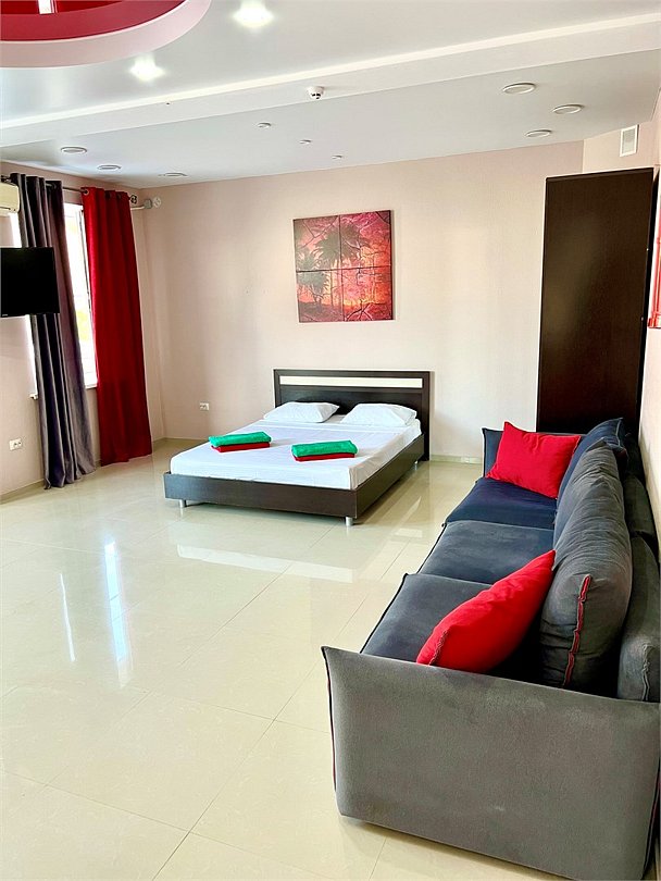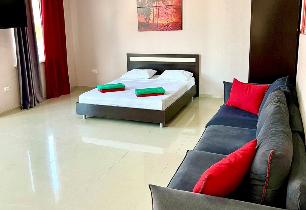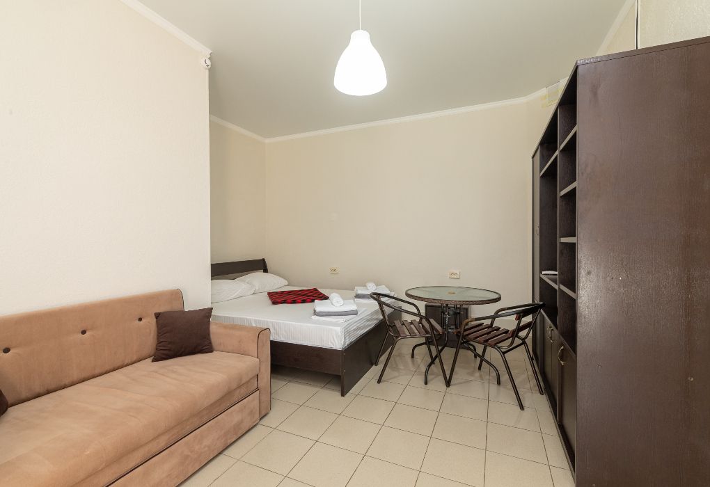 Просторная двухэтажная студия – идеальный вариант для тех, кто ценит комфорт, свободу и домашний уют даже на отдыхе. На первом этаже расположен санузел с душевой кабиной, туалетом и раковиной. Уже подготовлены фен, полотенца и базовые косметические принадлежности – вам не нужно беспокоиться о мелочах. На втором этаже студии – просторное открытое пространство с двуспальной кроватью, диваном и мини-кухней. Здесь есть всё необходимое для самостоятельного приготовления еды: плита, холодильник и удобный кухонный гарнитур. Электрический чайник с чашками также к вашим услугам. При необходимости в номере можно разместить до двух дополнительных гостей на раскладушках. В номере установлен кондиционер для поддержания комфортной температуры. А после пляжа удобно воспользоваться сушилкой для быстрой сушки вещей. Окна выходят во внутренний двор, где вас ждёт тишина и покой. Все гости нашего отеля могут пользоваться бассейнами, аквапарком и участвовать в анимационной программе. До песчаного пляжа Каспийского моря – всего несколько минут ходьбы.Услуги и удобства
