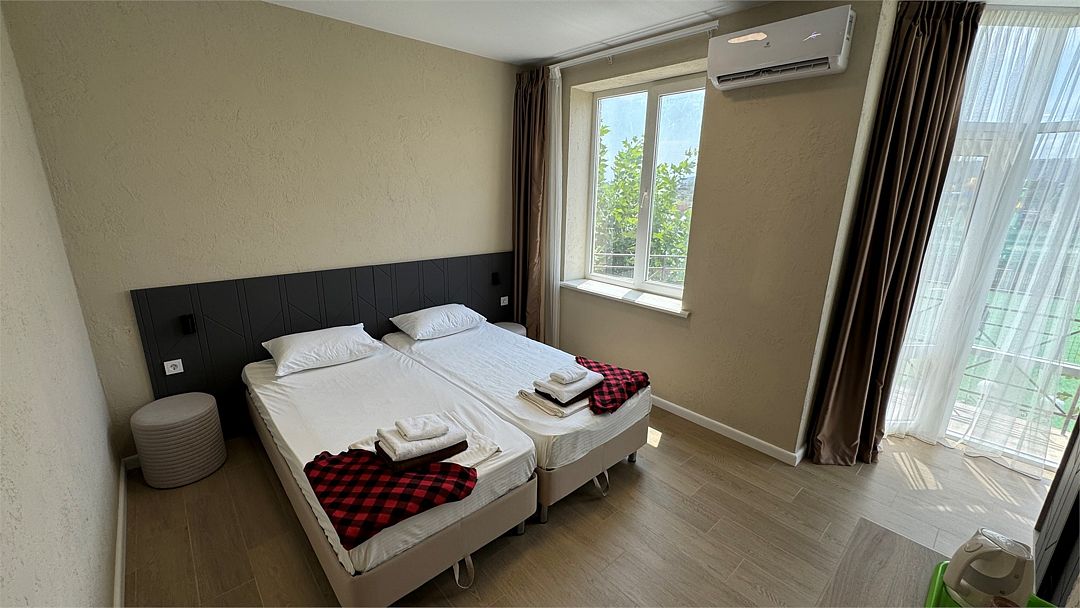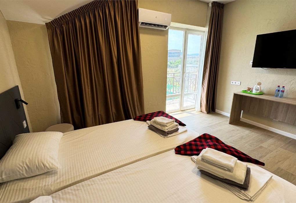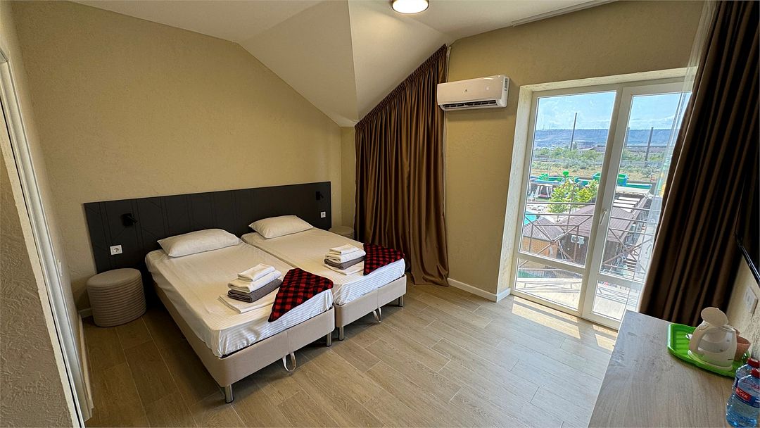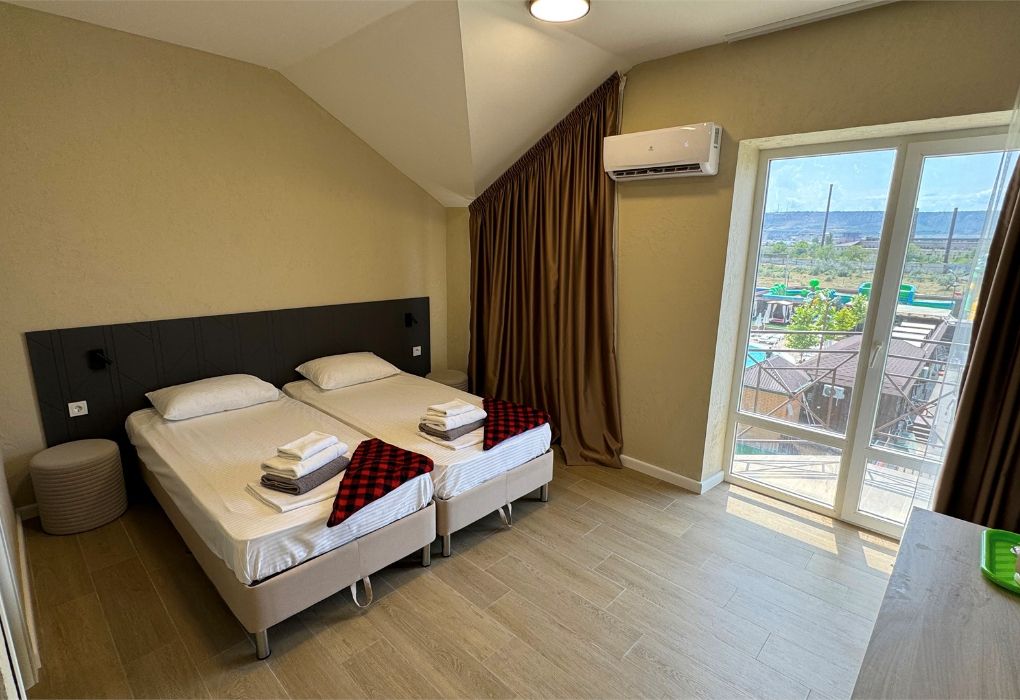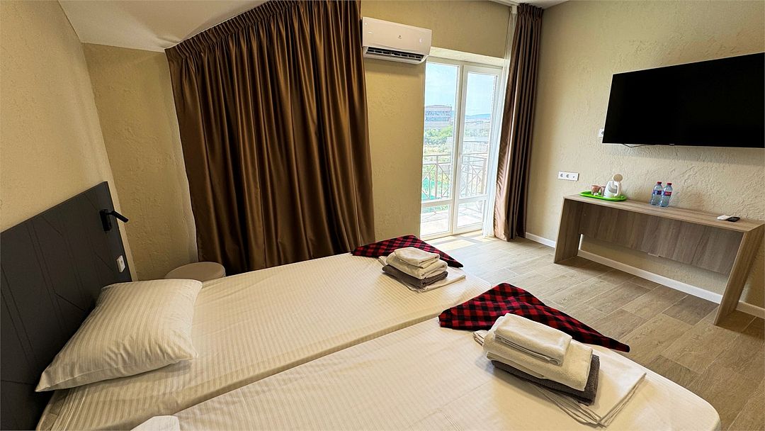 Современный и уютный номер для комфортного отдыха после недавней реновации. Светлый интерьер, новая мебель и продуманные детали делают пребывание здесь особенно приятным. В номере установлены две удобные односпальные кровати, которые при необходимости можно дополнить дополнительным спальным местом — отличный вариант для пары с ребёнком или небольшой компании. Собственный санузел с душевой кабиной, туалетом и раковиной обеспечит вам максимальный комфорт. Фен, полотенца и базовые косметические принадлежности уже включены. В вашем распоряжении кондиционер для поддержания комфортной температуры, мини-бар для хранения личных напитков и закусок, а также электрический чайник с чашками для уютных вечеров. Особую атмосферу создаёт балкон с видом на бассейн – идеальное место для утреннего кофе или отдыха после насыщенного дня. Гости могут свободно пользоваться бассейнами, аквапарком и участвовать в анимационной программе. Песчаный пляж Каспийского моря находится всего в нескольких минутах прогулки.Услуги и удобства