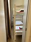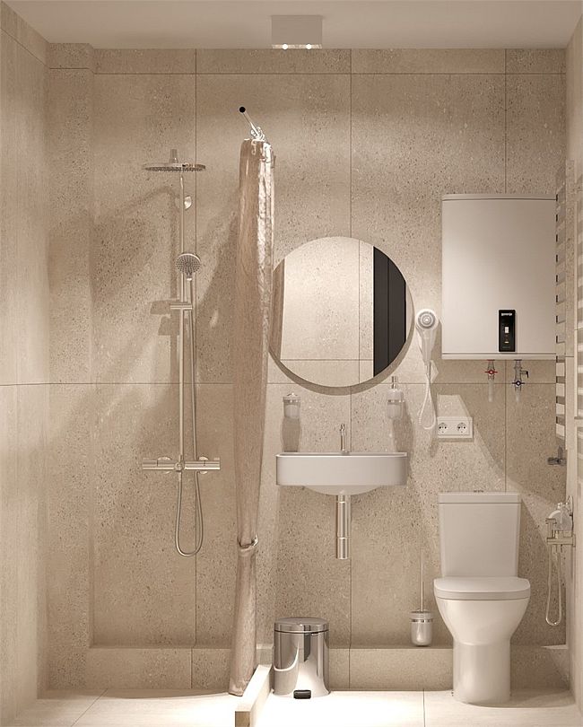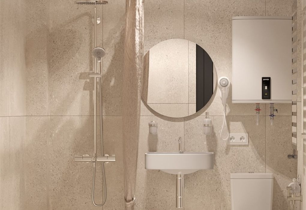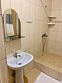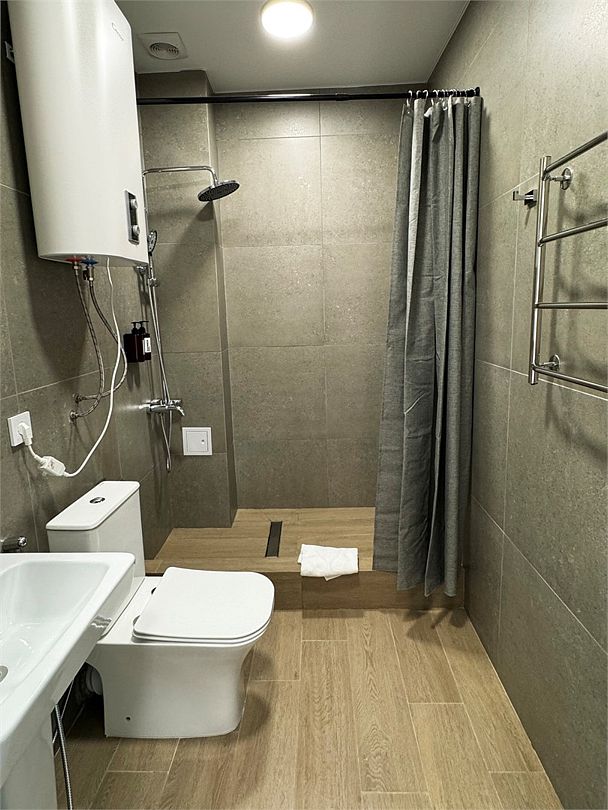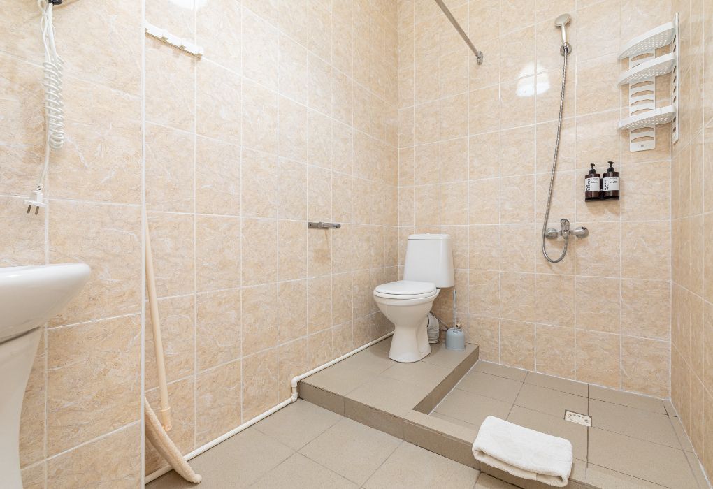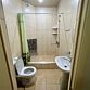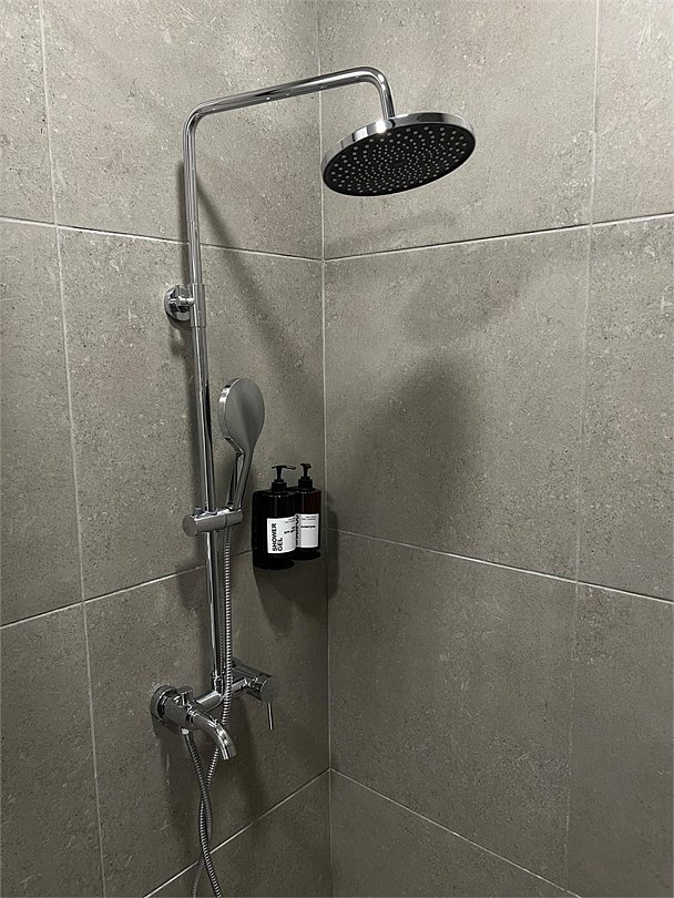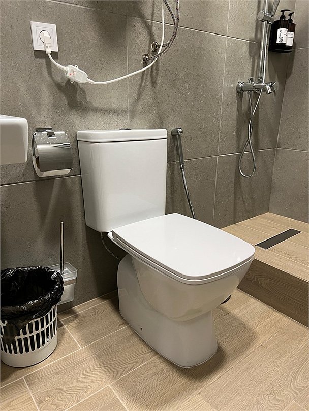 Номер оборудован санузлом, расположенном на лестничном пролете, с душевой системой, раковиной и туалетом.