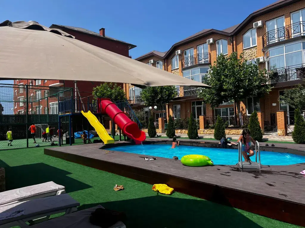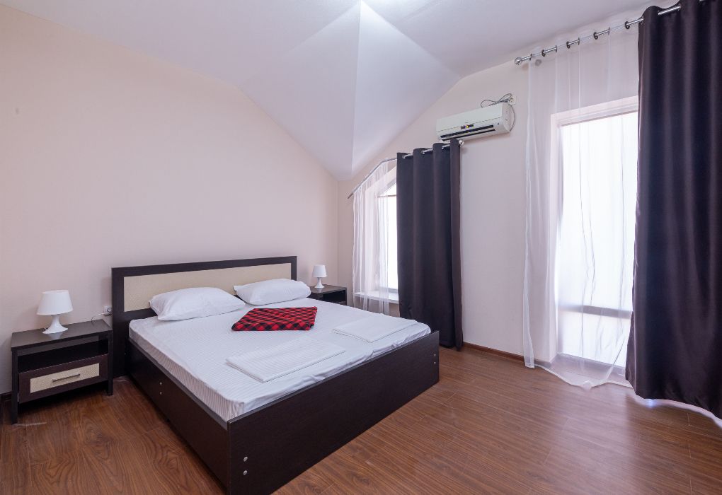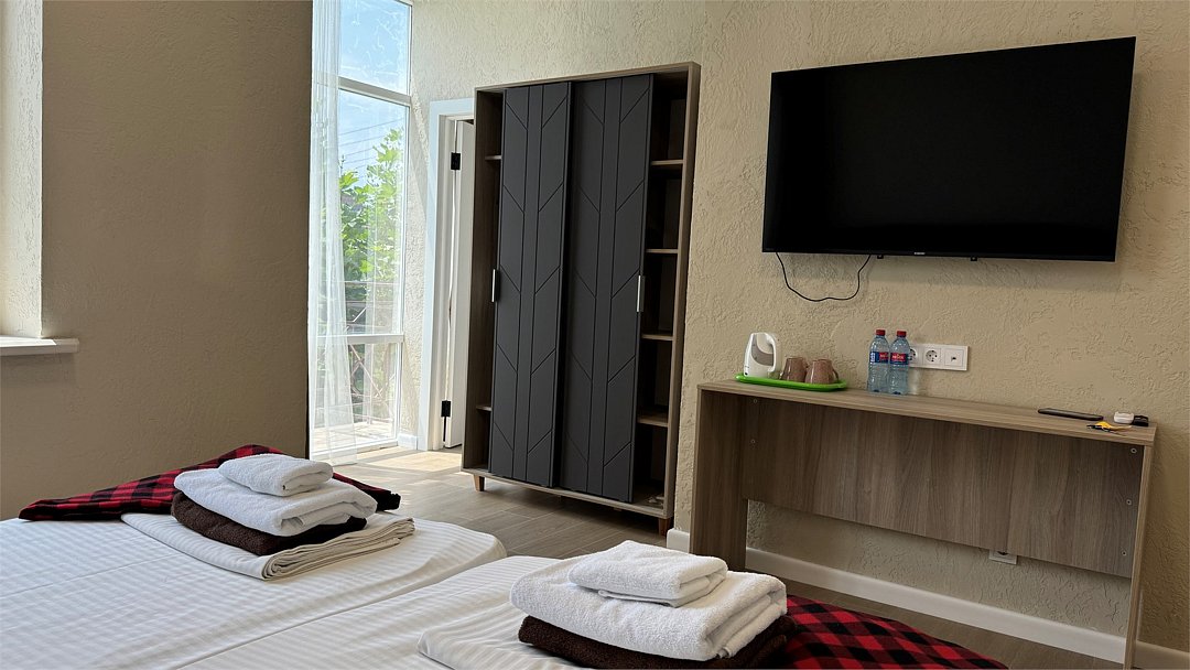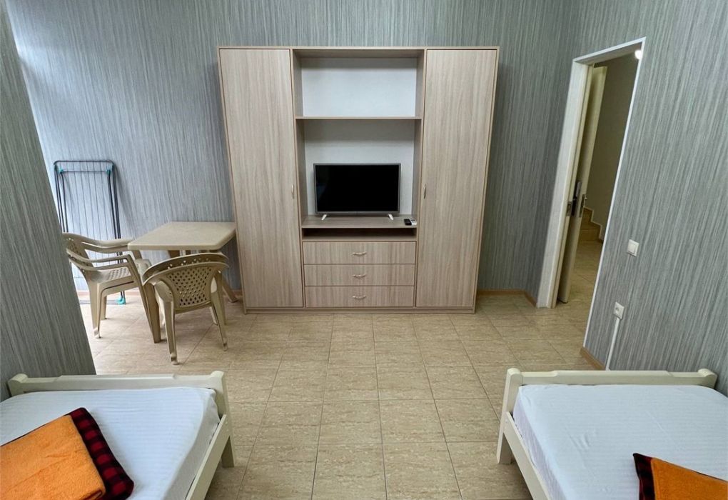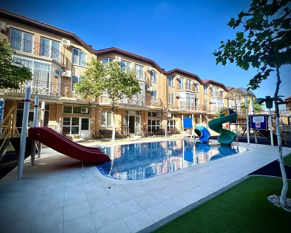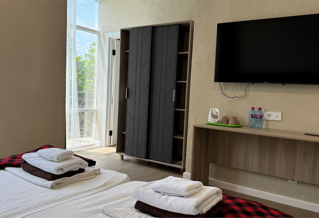 Просторные трёхэтажные апартаменты – идеальный выбор для семьи или компании друзей, которые ценят комфорт, личное пространство и домашний уют на отдыхе. На втором этаже находится светлая гостиная с раскладным диваном и полноценная кухня, оборудованная плитой, холодильником, кухонным гарнитуром и всей необходимой посудой – чтобы вы могли готовить в любое удобное время. На третьем этаже расположены две отдельные спальни: одна с двуспальной кроватью, другая – с двумя односпальными кроватями, что идеально подходит для семейного размещения, а также санузел с душевой кабиной, туалетом и раковиной. В апартаментах работает кондиционер, обеспечивая комфортную температуру на всех уровнях. Также предусмотрены фен, полотенца, базовые косметические принадлежности, электрический чайник с чашками и сушилка для вещей. Окна выходят во внутренний двор, создавая ощущение тишины и уюта. Все гости отеля могут пользоваться бассейнами, аквапарком и участвовать в анимационной программе. До песчаного пляжа Каспийского моря – всего несколько минут приятной прогулки.Услуги и удобства