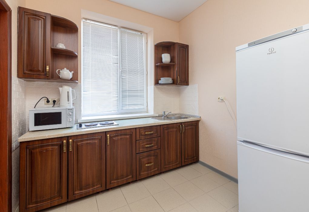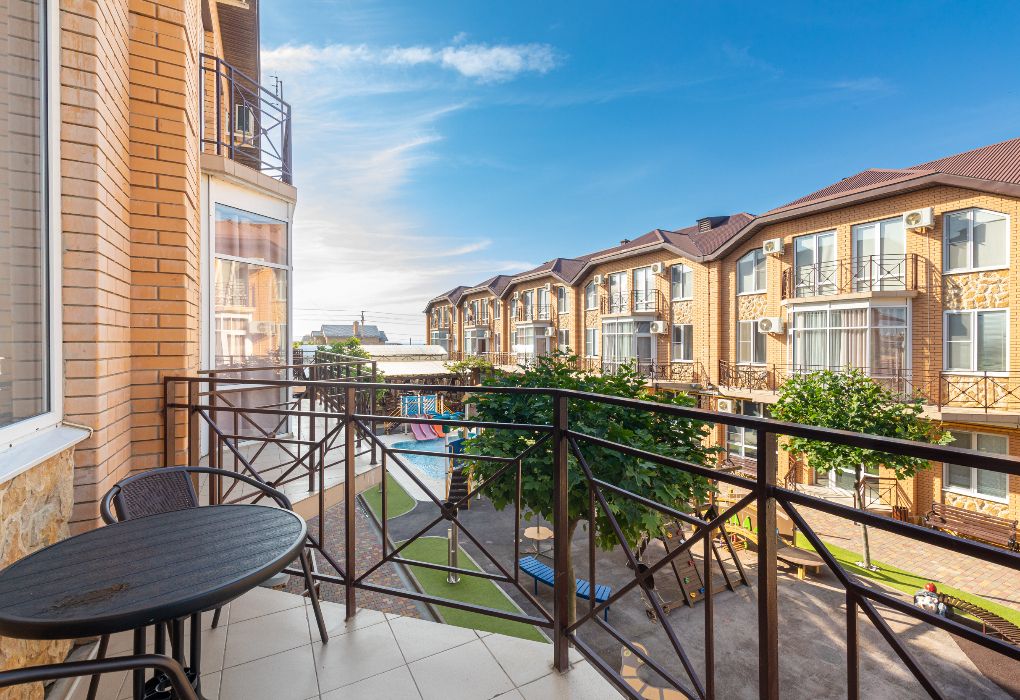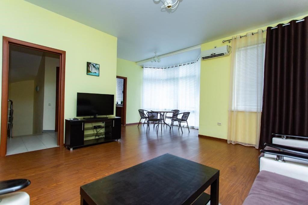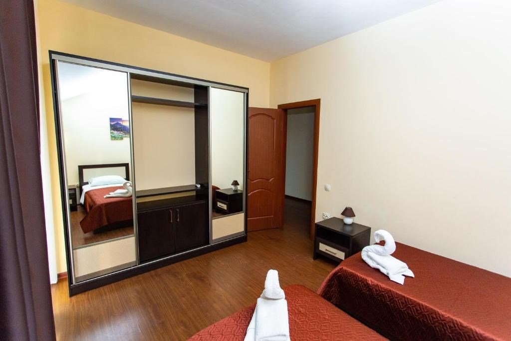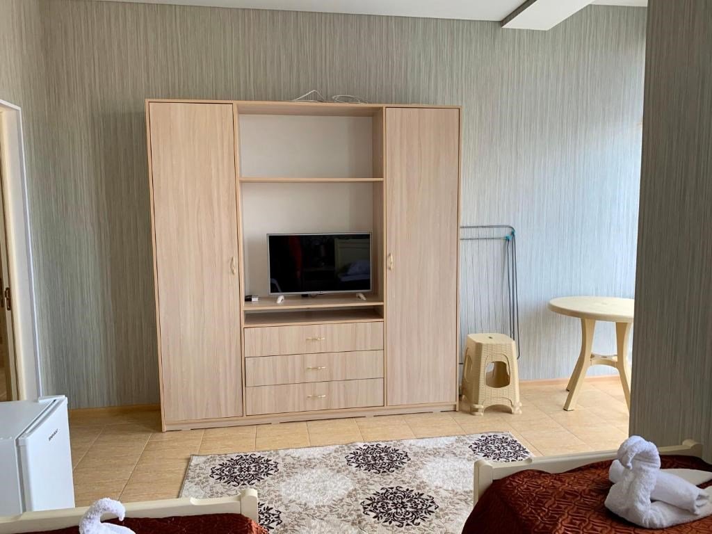 Просторные трёхэтажные апартаменты – идеальный выбор для семьи или компании друзей, которые ценят комфорт, личное пространство и домашний уют на отдыхе. На втором этаже находится светлая гостиная с раскладным диваном и полноценная кухня, оборудованная плитой, холодильником, кухонным гарнитуром и всей необходимой посудой – чтобы вы могли готовить в любое удобное время. На третьем этаже расположены две отдельные спальни: одна с двуспальной кроватью, другая – с двумя односпальными кроватями, что идеально подходит для семейного размещения, а также санузел с душевой кабиной, туалетом и раковиной. В апартаментах работает кондиционер, обеспечивая комфортную температуру на всех уровнях. Также предусмотрены фен, полотенца, базовые косметические принадлежности, электрический чайник с чашками и сушилка для вещей. Окна выходят во внутренний двор, создавая ощущение тишины и уюта. Все гости отеля могут пользоваться бассейнами, аквапарком и участвовать в анимационной программе. До песчаного пляжа Каспийского моря – всего несколько минут приятной прогулки.Услуги и удобства