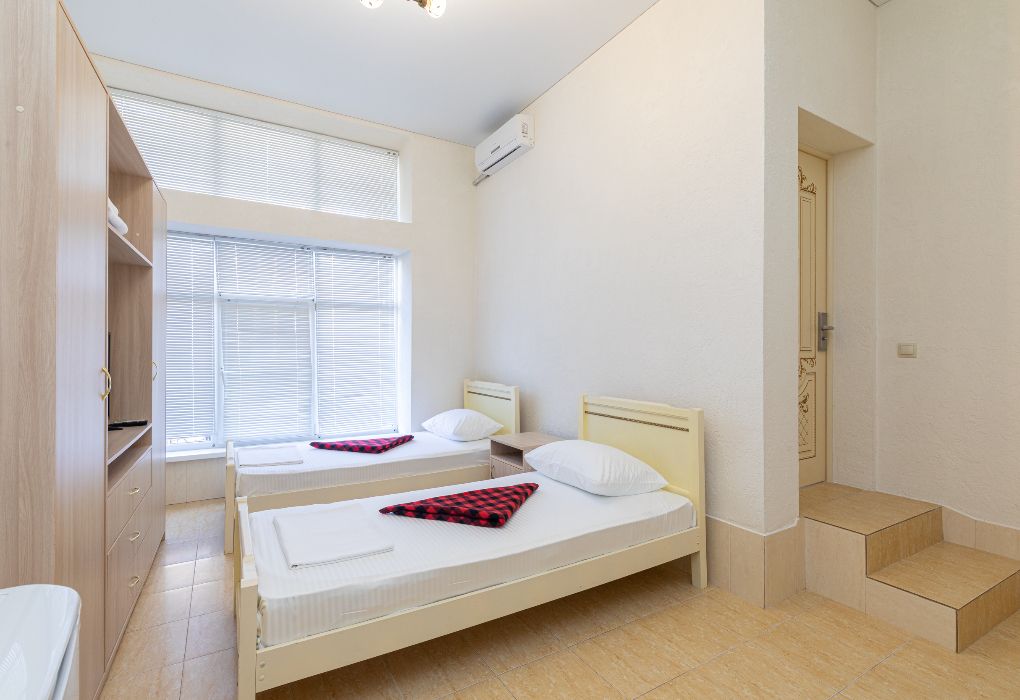 телевизор, Wi-Fi, интернет, холодильник, кондиционер, фен, две односпальные кровати, стулья, чайник, душ, вид во двор, стаканы, стол, туалет, сушилка для белья, номер для некурящих, без питомцевВ гостиничном номере