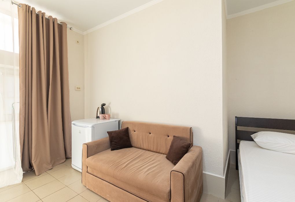 Этот уютный номер создан для комфортного отдыха вдвоём или небольшой семьёй. Просторная двуспальная кровать подарит полноценный сон после активного дня на пляже или прогулок по живописным местам Дагестана. Для дополнительного размещения предусмотрен раскладной диван – отличный вариант для ребёнка или третьего взрослого. В вашем распоряжении будет собственный санузел прямо в номере – с душевой кабиной, туалетом и раковиной. Мы предусмотрели всё необходимое для удобства: фен, полотенца и базовые косметические принадлежности уже ждут вас. Комфортную температуру поможет поддерживать кондиционер. Для вечернего отдыха предусмотрены электрический чайник с чашками и холодильник для хранения напитков и лёгких закусок. Пляжные вещи можно быстро высушить на специальной сушилке. Окна номера выходят во внутренний двор, что обеспечивает тишину и спокойную атмосферу. Все гости отеля могут пользоваться бассейнами, аквапарком и участвовать в анимационной программе. До песчаного берега Каспийского моря – всего несколько минут пешком.Услуги и удобства