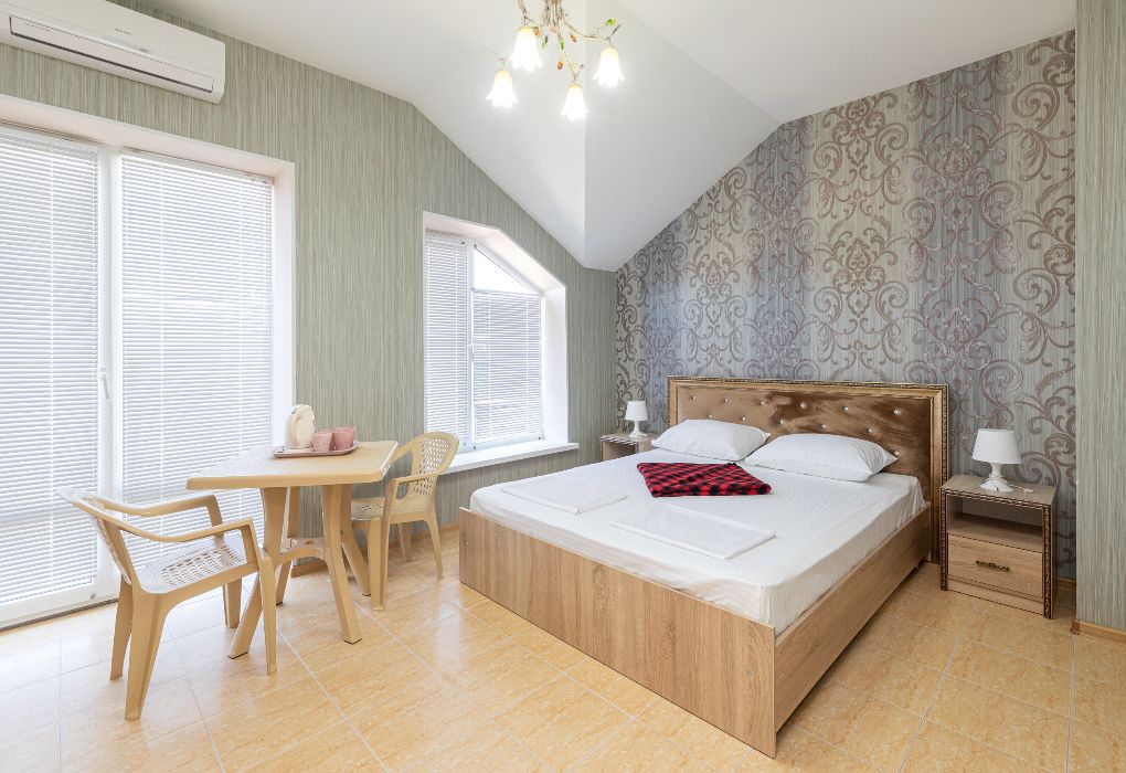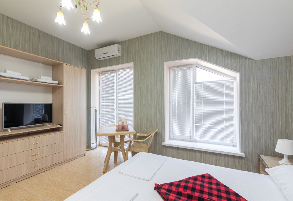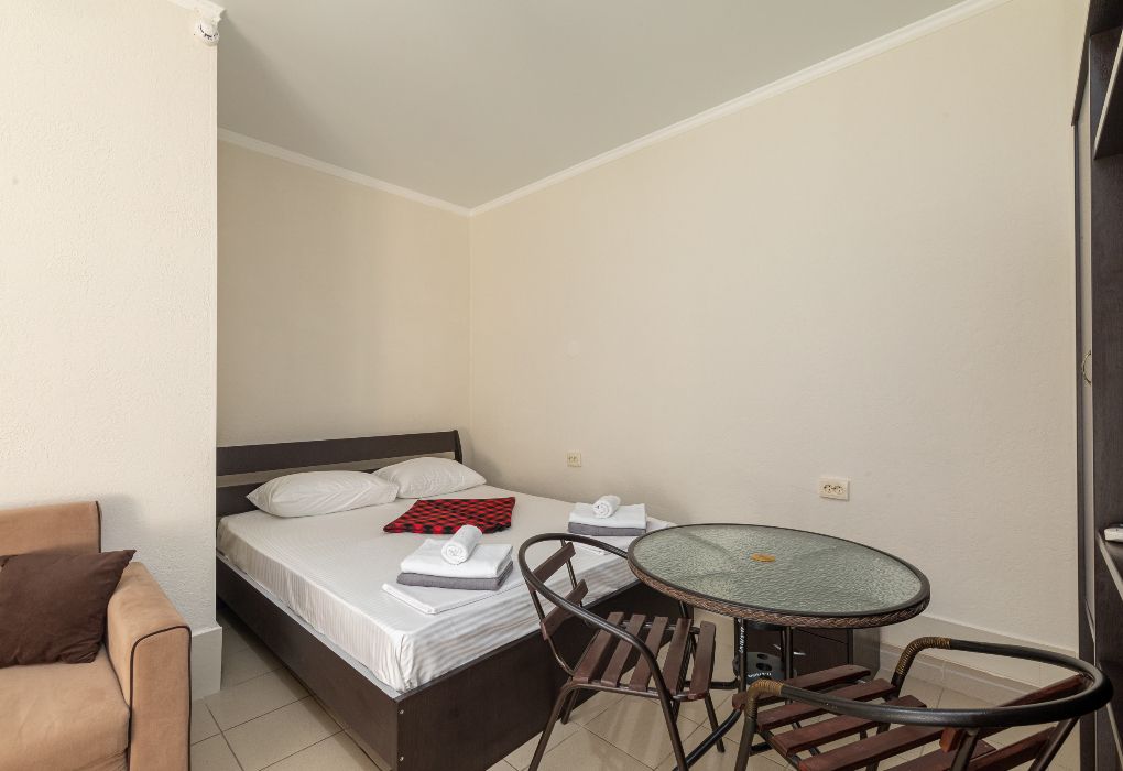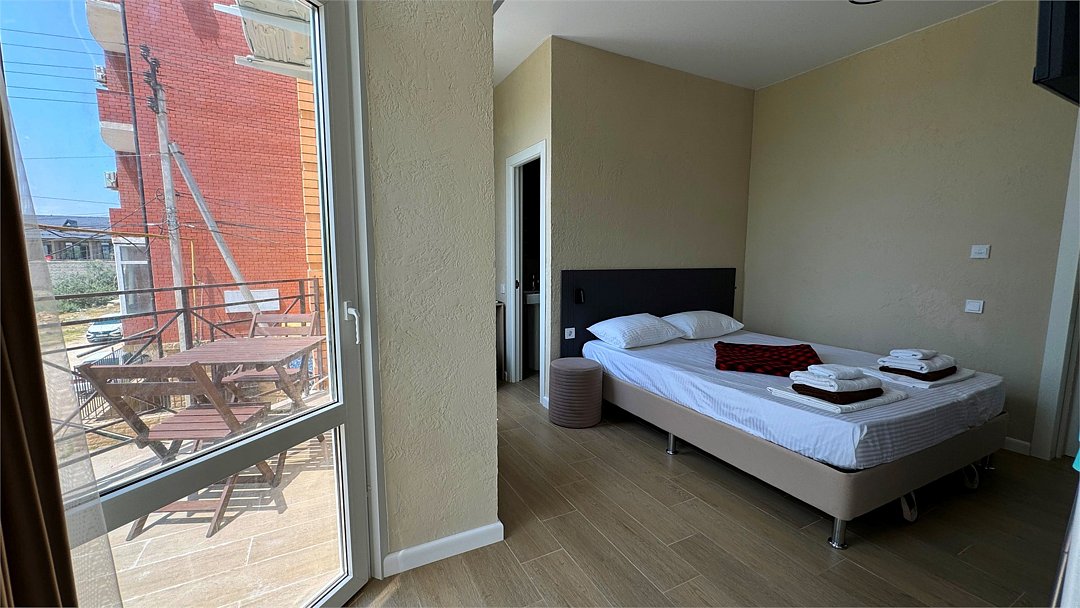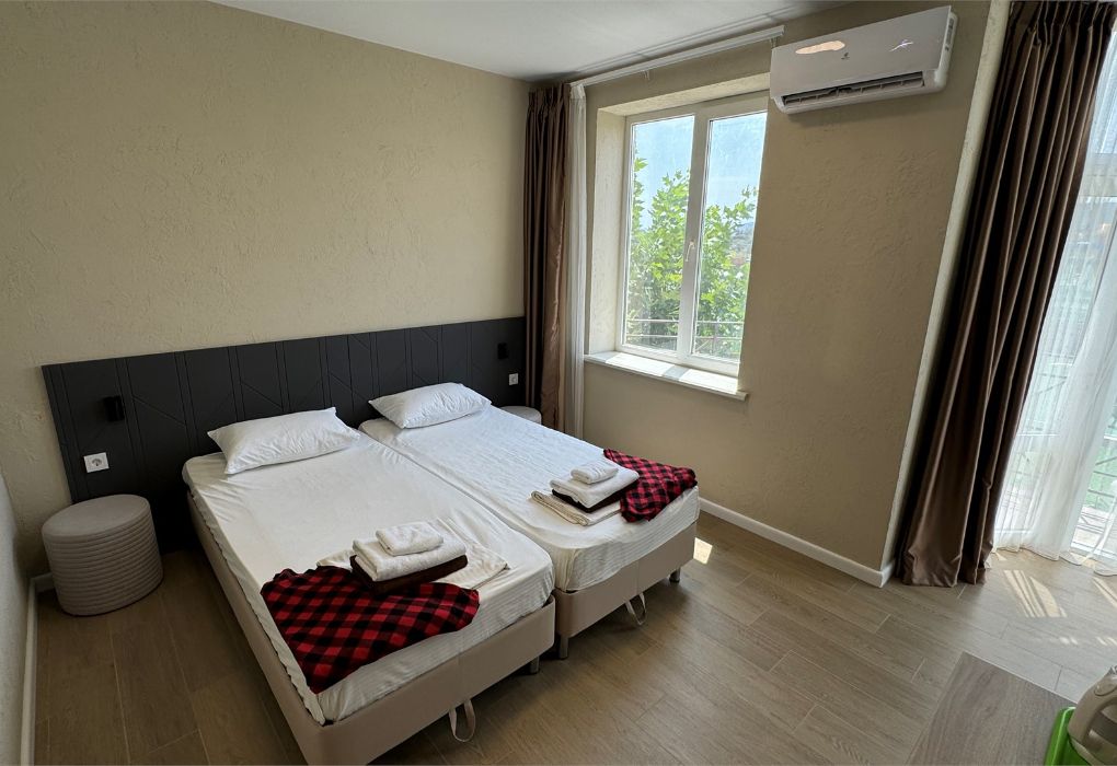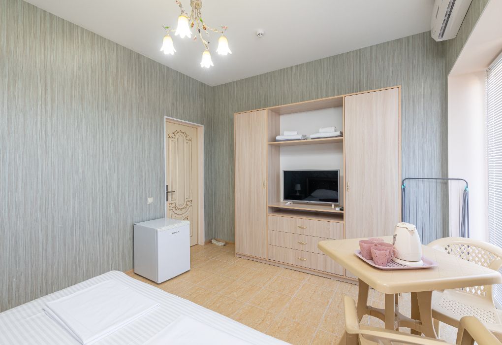 Уютный и современный номер для тех, кто ценит комфорт и стильный отдых. После недавней реновации здесь появилась новая мебель, светлый интерьер и приятная атмосфера, в которой легко расслабиться. В комнате установлена удобная двуспальная кровать, обеспечивающая полноценный отдых после дня, проведённого на пляже или экскурсиях. Номер оснащён собственным санузлом с душевой кабиной, туалетом и раковиной. Мы предусмотрели всё необходимое: фен, полотенца и базовые косметические принадлежности уже ждут вас. Для вашего удобства в номере установлен кондиционер. Мини-бар предназначен для хранения личных напитков и закусок. Также к вашим услугам электрический чайник с чашками для уютных вечеров. А балкон станет приятным местом для отдыха на свежем воздухе. Окна номера выходят во внутренний двор, обеспечивая тишину и спокойствие. Все гости отеля могут пользоваться бассейнами, аквапарком и анимационной программой. До песчаного пляжа Каспийского моря – всего несколько минут пешком.Услуги и удобства