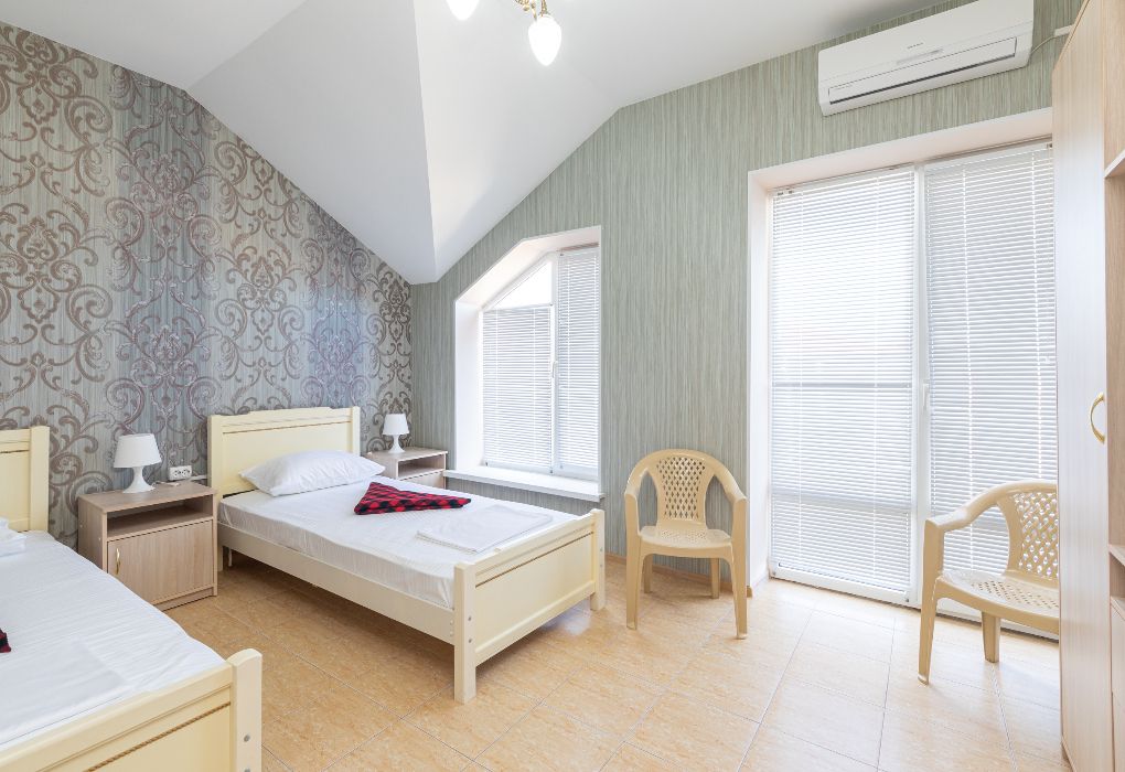 телевизор, Wi-Fi, холодильник, кондиционер, фен, банные полотенца, пляжные полотенца, стулья, вешалки, обеденный стол, багажная тумба, зеркало, мебельный гарнитур, чайник, унитаз, душ, вид во двор, четыре односпальные кровати, стаканы, стол, туалет, сушилка для белья, номер для некурящих, без питомцевВ гостиничном номере