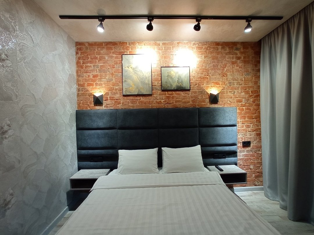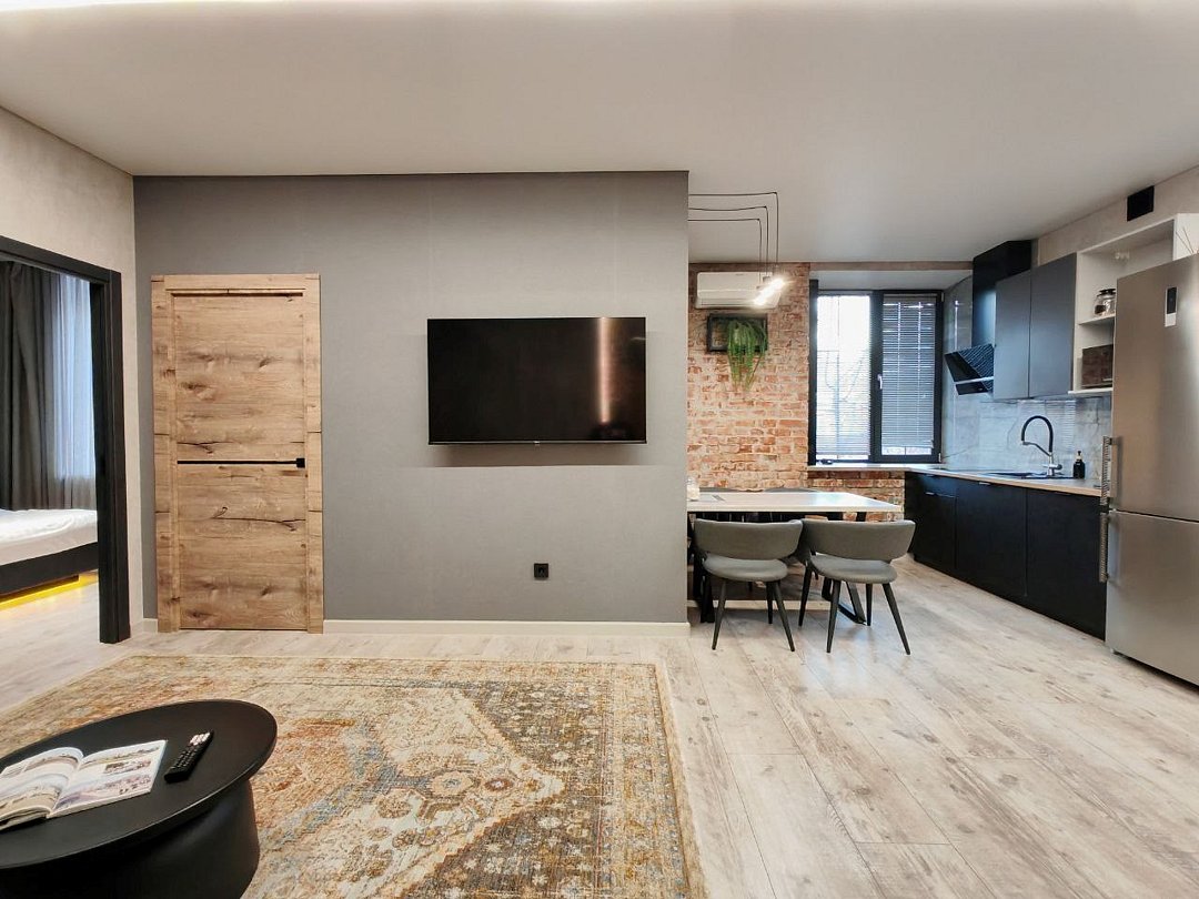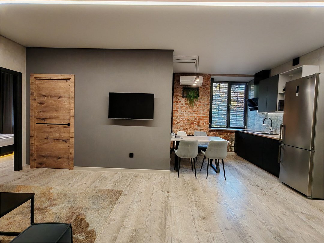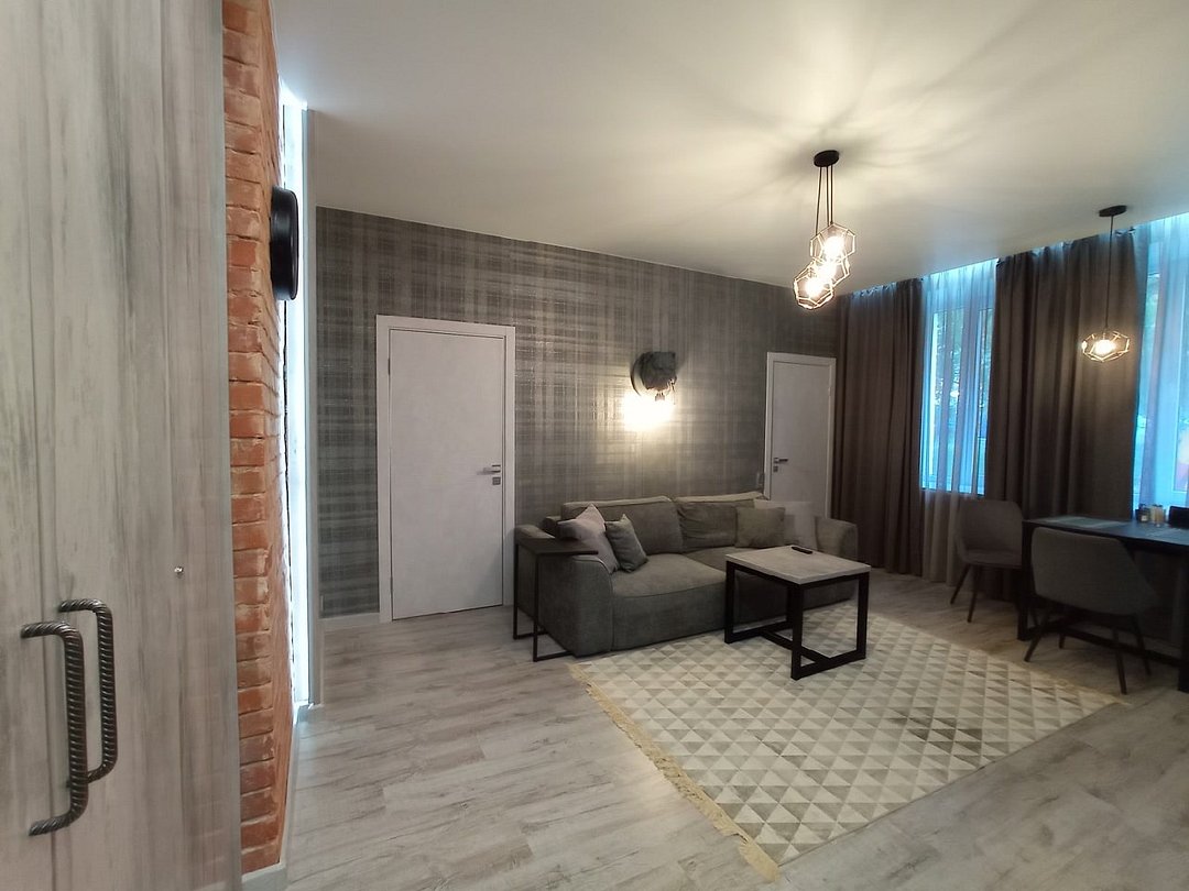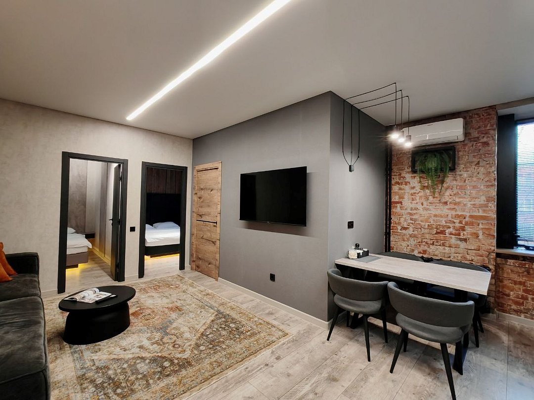 Апартаменты Лофт 1 - это 3 ком. квартира с современным, модным дизайном. Апартаменты имеют 2 спальные комнаты и кухню-гостинную. Кухня оборудована всей необходимой бытовой техников ( электроплита, вытяжка, холодильник, чайник, микроволновая печь и автоматическая кофе машина с зерновым кофе). Фильтр с питьевой водой. В одной спальной комнате - двуспальная кровать 160*200 с матрасом мемори форм. Диваны во второй спальной и гостинной расправляются до размеров 2х спальных кроватей. В сан. узле теплый пол, фен и все необходимые гигиенические средства. Удаленное заселение позволит Вам заселиться в любое удобное для Вас время.Услуги и удобства