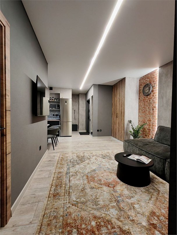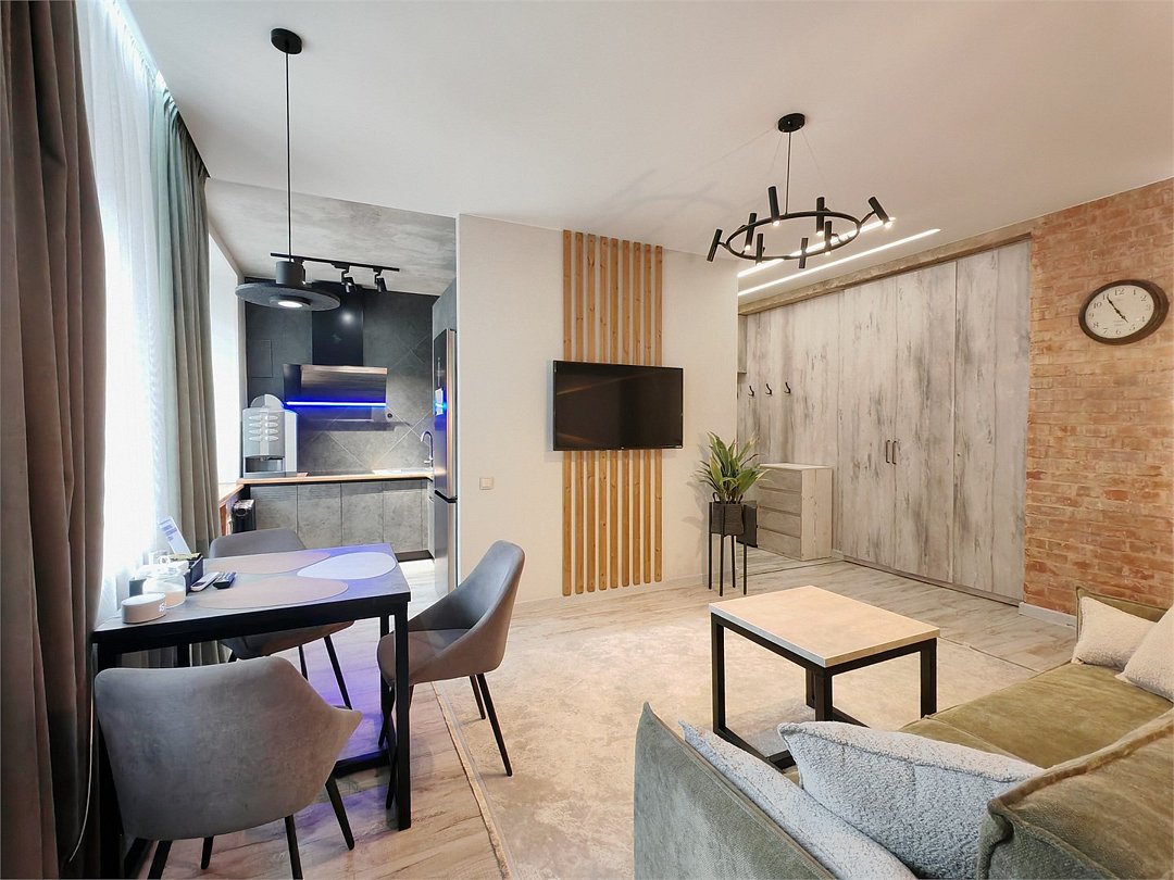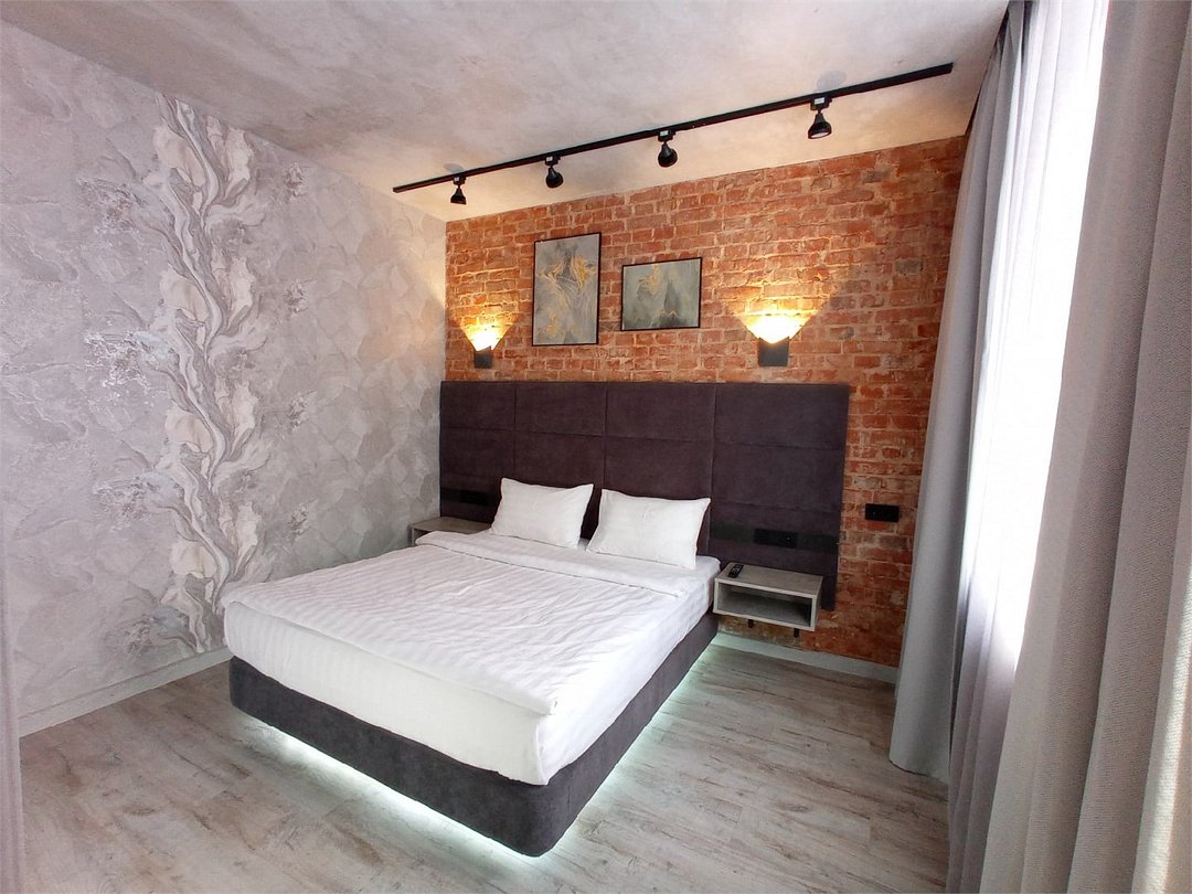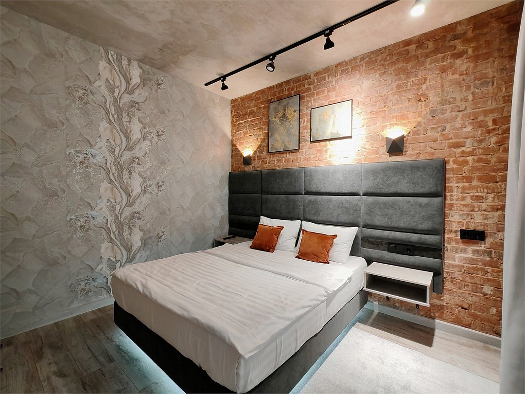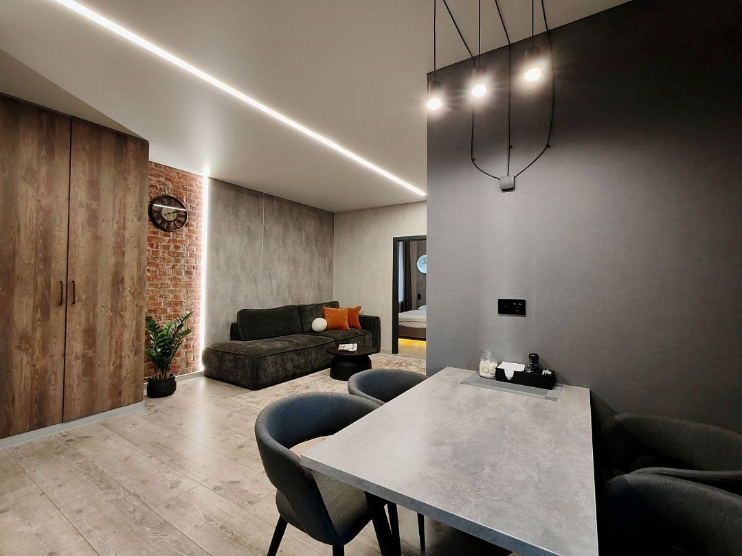Апартаменты Лофт 1 - это 3 ком. квартира с современным, модным дизайном. Апартаменты имеют 2 спальные комнаты и кухню-гостинную. Кухня оборудована всей необходимой бытовой техников ( электроплита, вытяжка, холодильник, чайник, микроволновая печь и автоматическая кофе машина с зерновым кофе). Фильтр с питьевой водой. В одной спальной комнате - двуспальная кровать 160*200 с матрасом мемори форм. Диваны во второй спальной и гостинной расправляются до размеров 2х спальных кроватей. В сан. узле теплый пол, фен и все необходимые гигиенические средства. Удаленное заселение позволит Вам заселиться в любое удобное для Вас время.Услуги и удобства