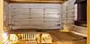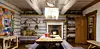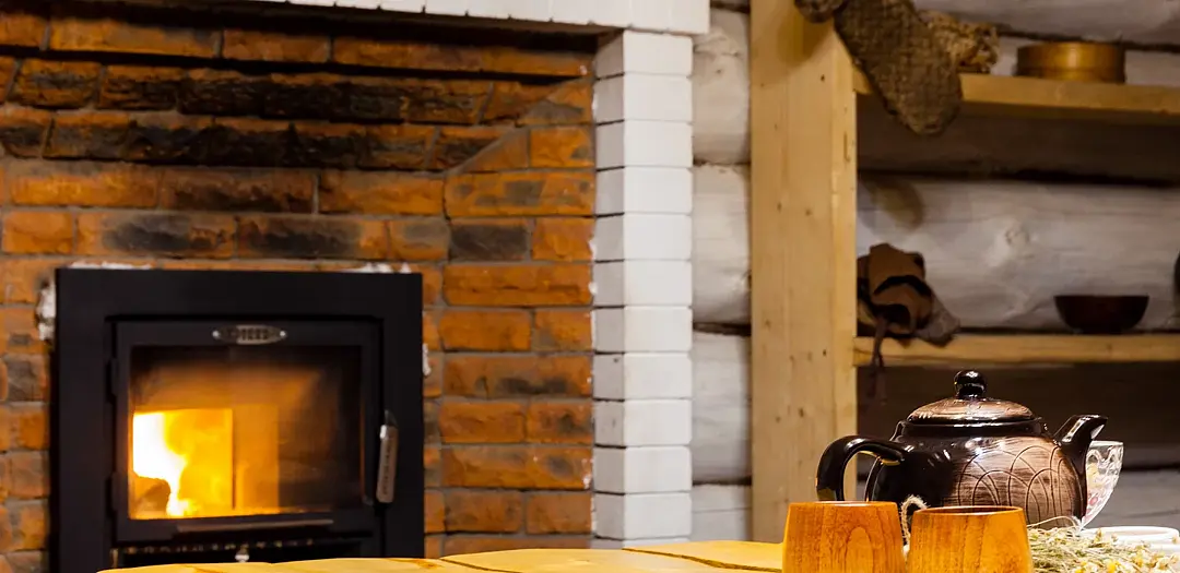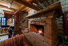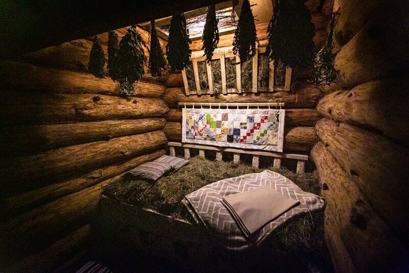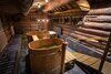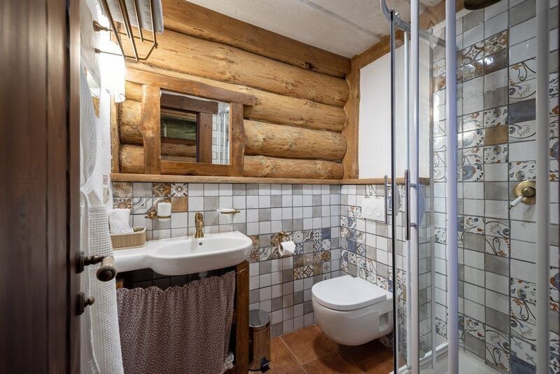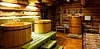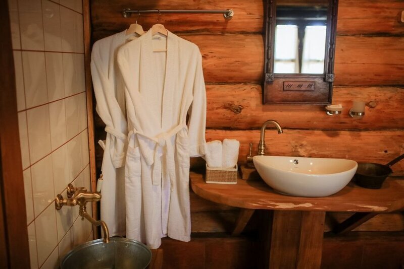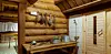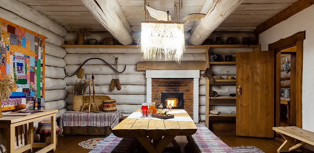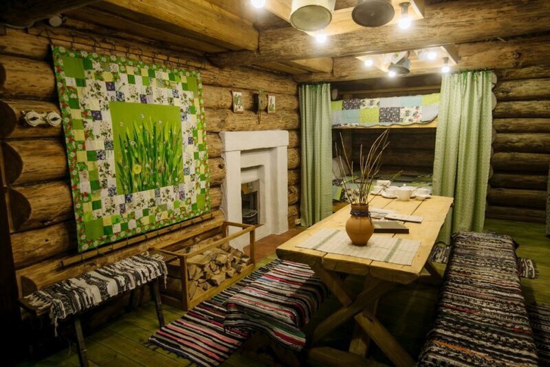 Внутри соответствующий интерьер: много дерева, предметов интерьера "из деревни", стол с банками с соленьями, рукомойник.