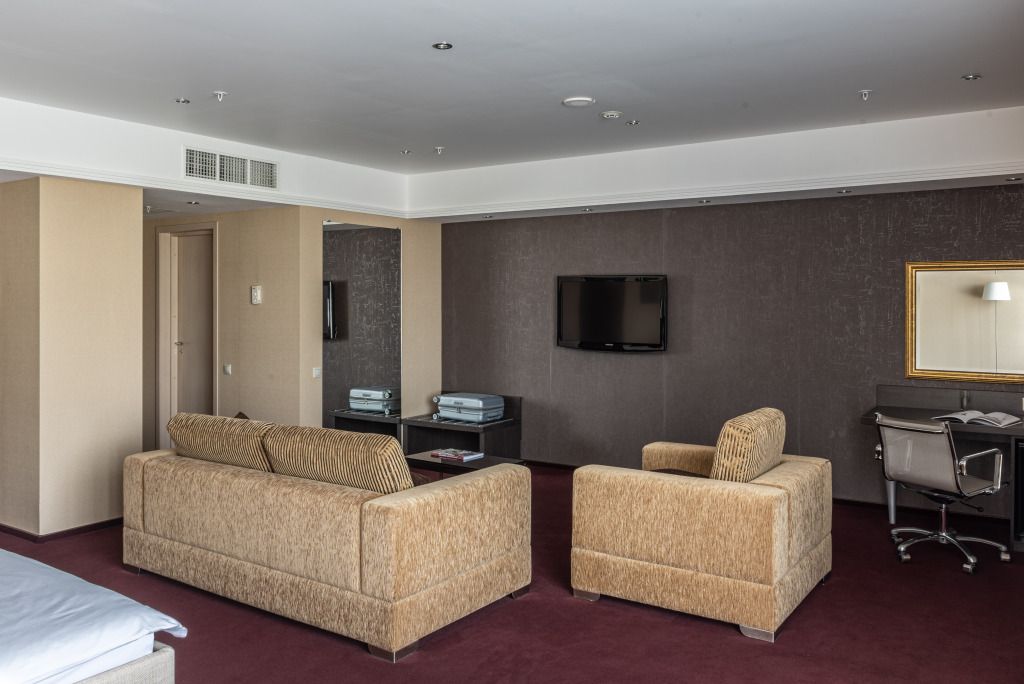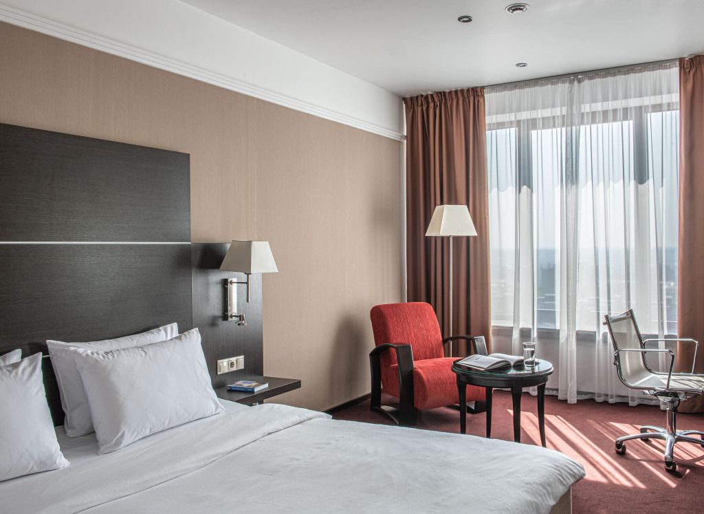 Девятиэтажное здание отеля, оснащенное лифтом, располагается на закрытой охраняемой территории. Гостей ожидают двухместные номера категории Стандарт, Полулюкс, Люкс и Бизнес. В номерах современная меблировка стильный интерьер, выдержанный в теплой цветовой гамме с использованием красных акцентных оттенков. Все комнаты укомплектованы бытовой техникой — есть телевизор ЖК, мини-холодильник, электрочайник, фен, установлена сплит-система.