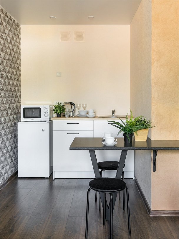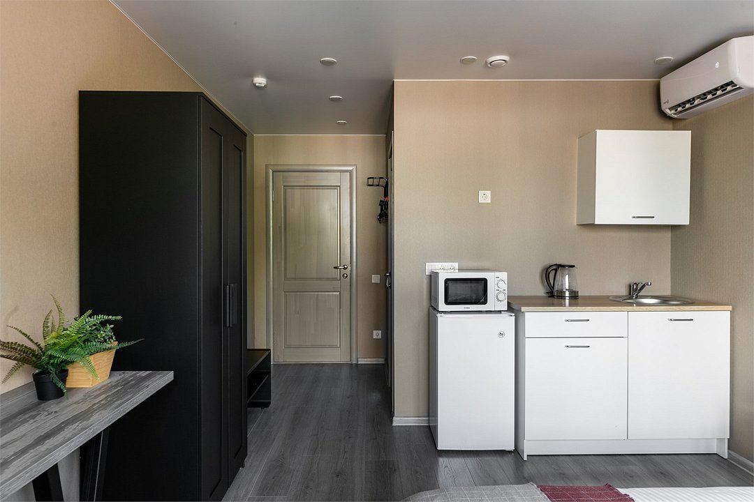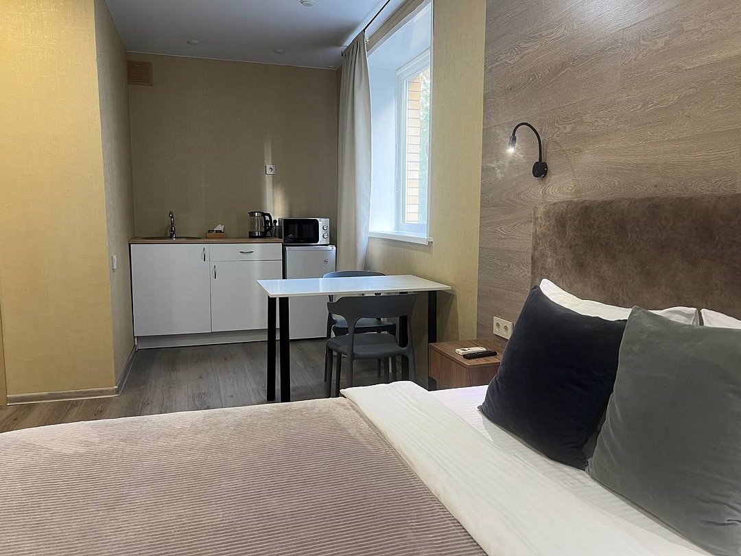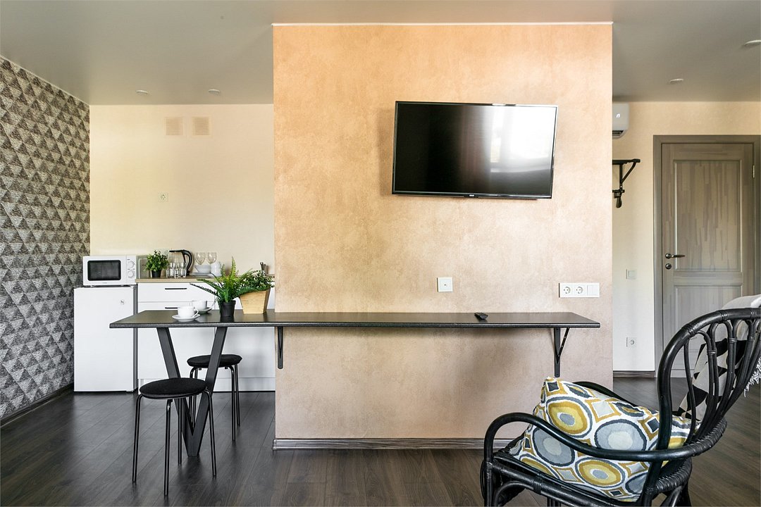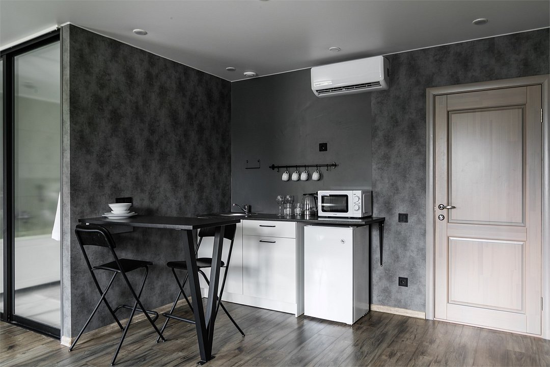 Комфортабельный номер идеально подходит для отдыха и работы. В номере двуспальная кровать, мини-кухня, все необходимое для приготовления пищи, ванная комната с душевой кабиной, принадлежностями. Для удобства гостей предусмотрена рабочая зона с столом и креслами.Услуги и удобства