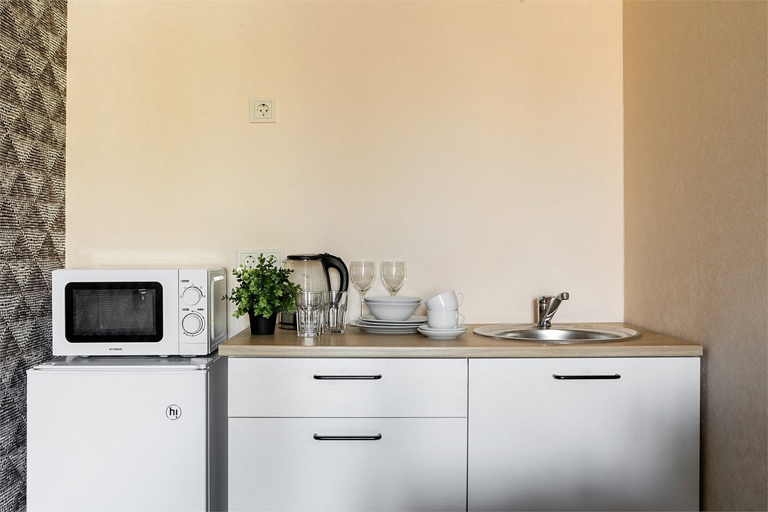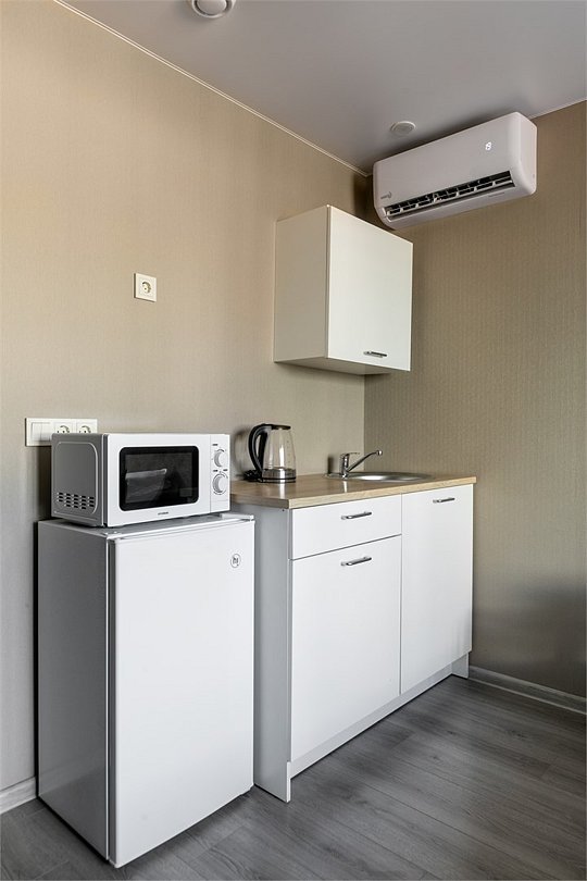 Комфортабельный номер для отдыха и работы. В номере две односпальные кровати, мини-кухня и вся необходимая посуда для приготовления пищи. Собственная ванная комната оборудована душевой кабиной, санузлом. Номер подходит для длительного проживания.Услуги и удобства