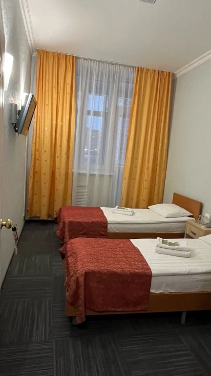 телевизор, кабельное телевидение, Wi-Fi, телефон, душевая кабина, банные полотенца, гигиенические средства, две односпальные кровати, шкаф для одежды, зеркало, обслуживание номеров, информационная карта, меню, унитаз, раковина, ковровое покрытие, отопление, вид на город, кулер на этаже, общая ванная комната, вид во дворВ гостиничном номере