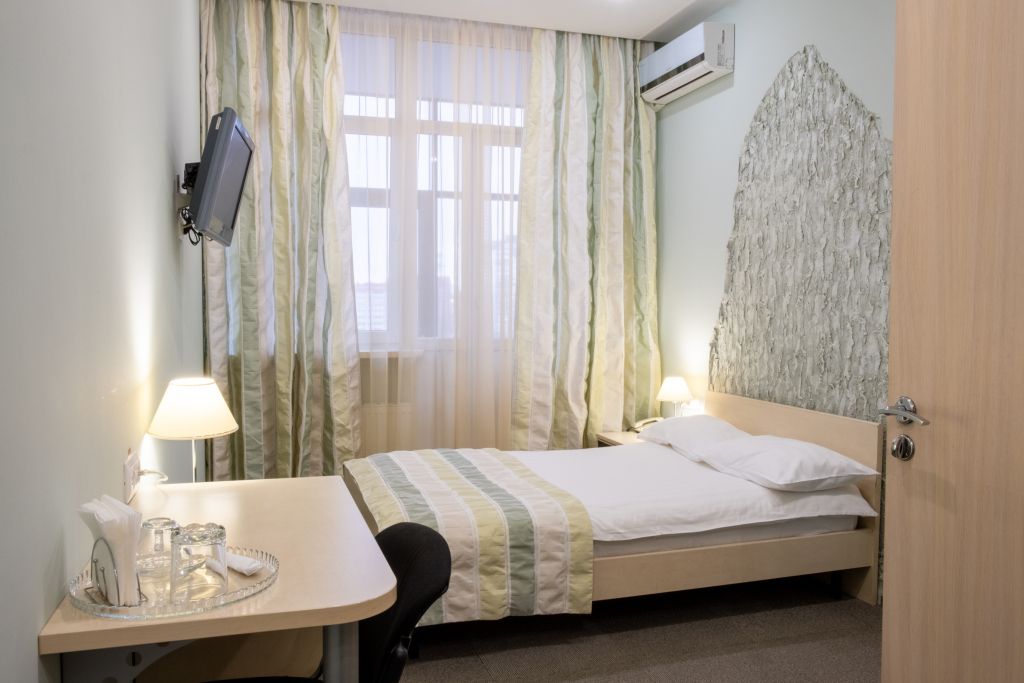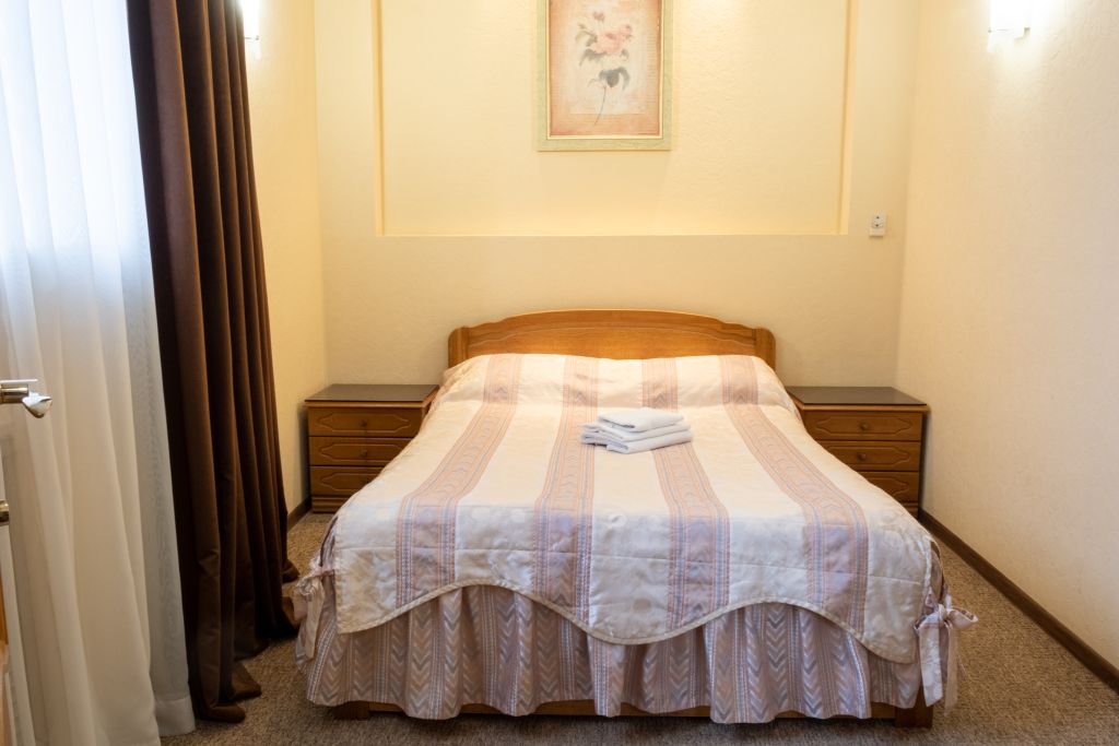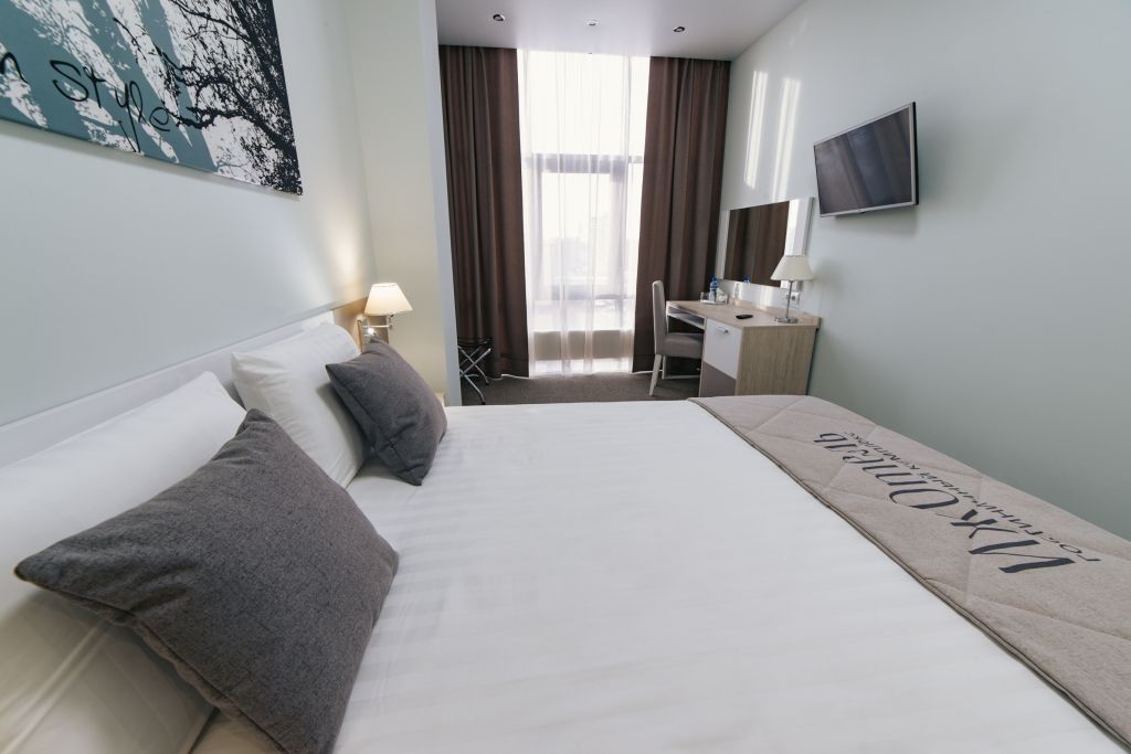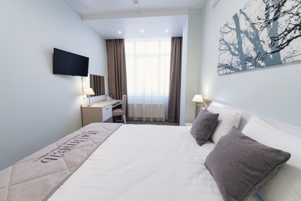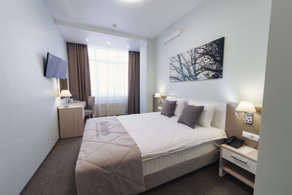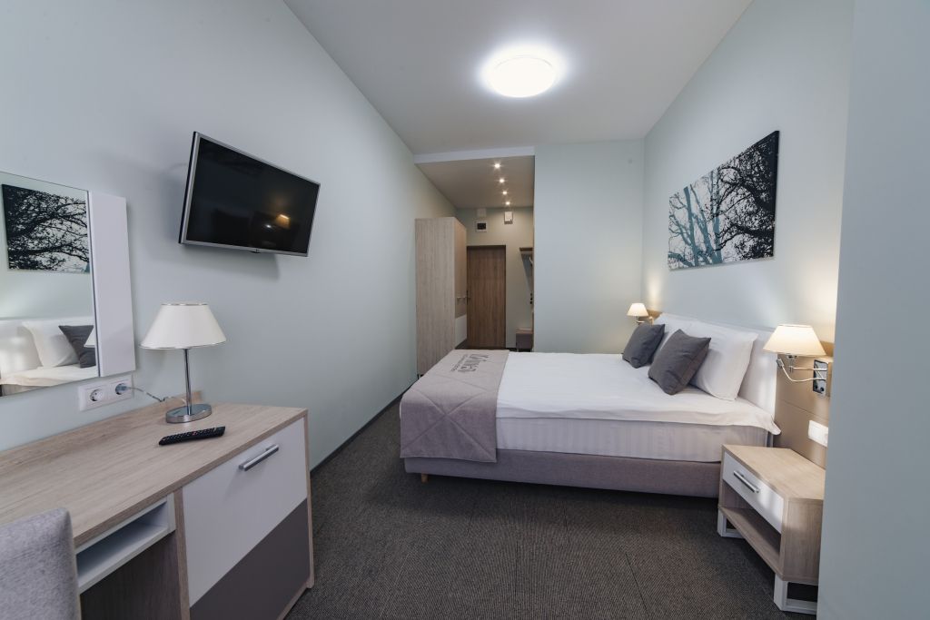Уютный номер (площадью 19 кв.м.), удобная двуспальная кровать 1,6*2,0м с ортопедическим матрасом, которая может трансформироваться в две односпальные 0,8*2,0м, прикроватные тумбы и бра, рабочий стол, телевизор с плоским экраном, кондиционер, санузел с душевой кабиной, гигиенический душ, раковина. В номере шкаф-гардеробная. Панорамные окна. Количество комнат – 1. Двуспальная или две односпальные кровати. ЖК TV, телефон, кондиционер, холодильник Санузел: душевая кабина, унитаз, умывальник, гигиенический душ.Услуги и удобства