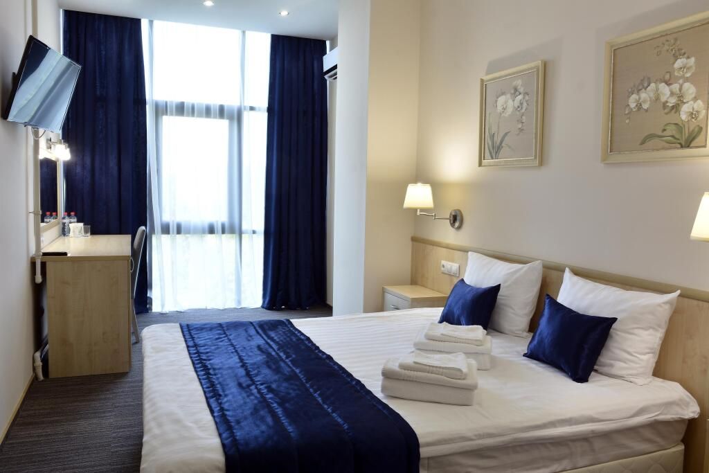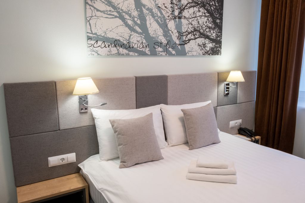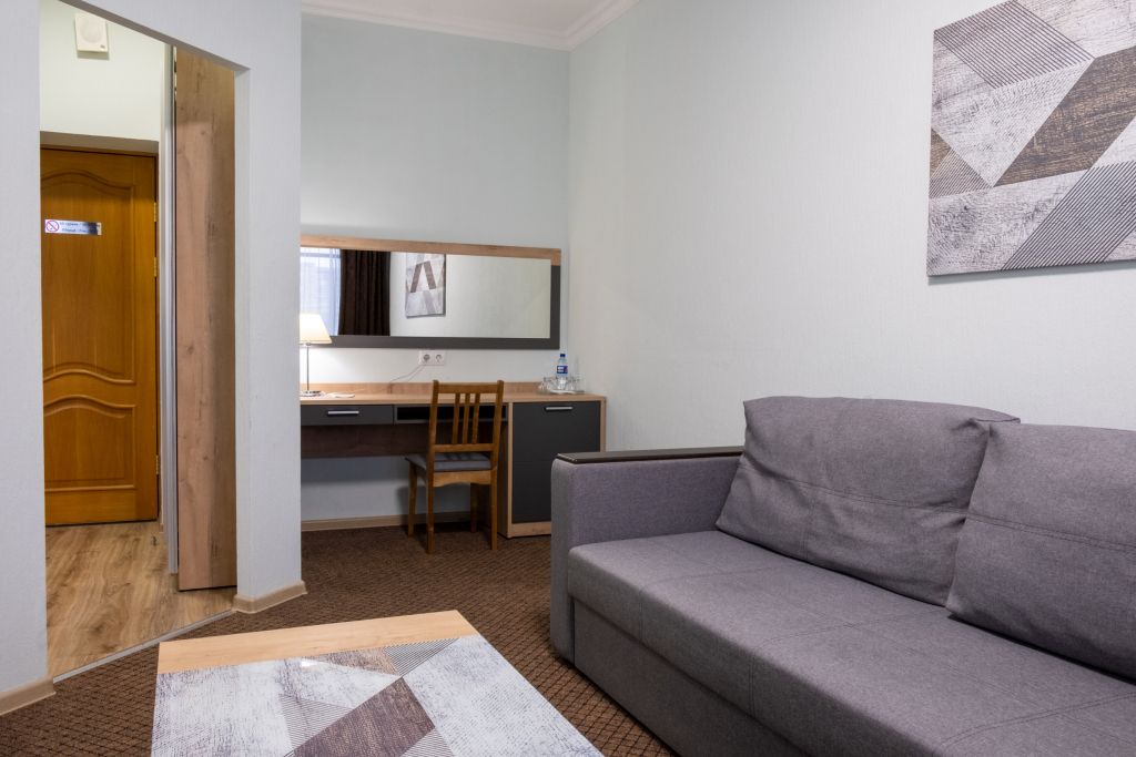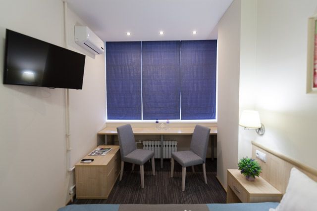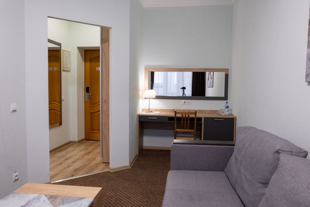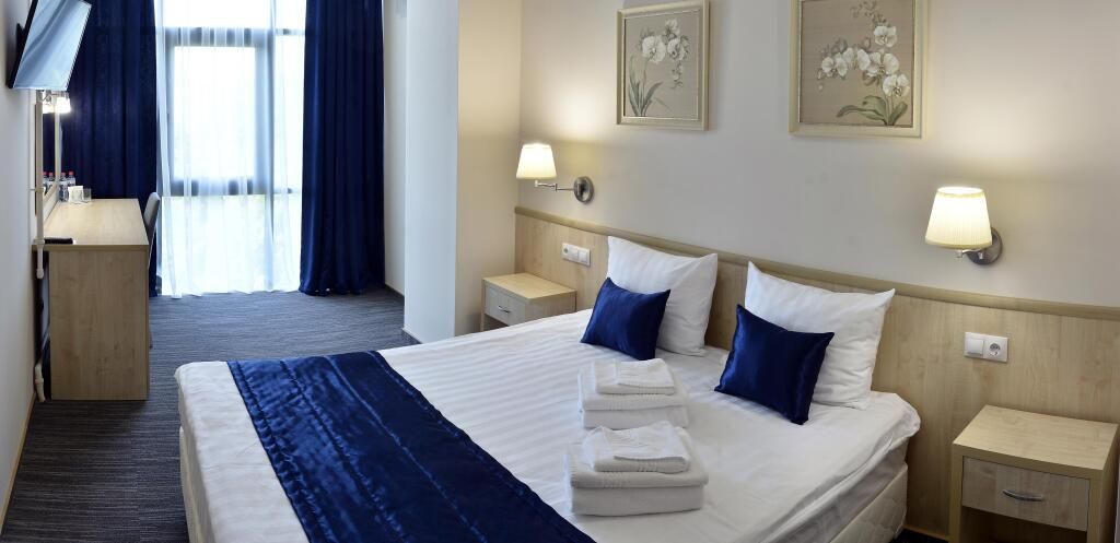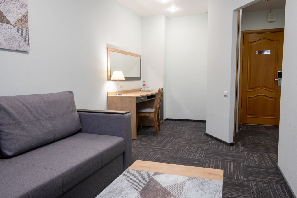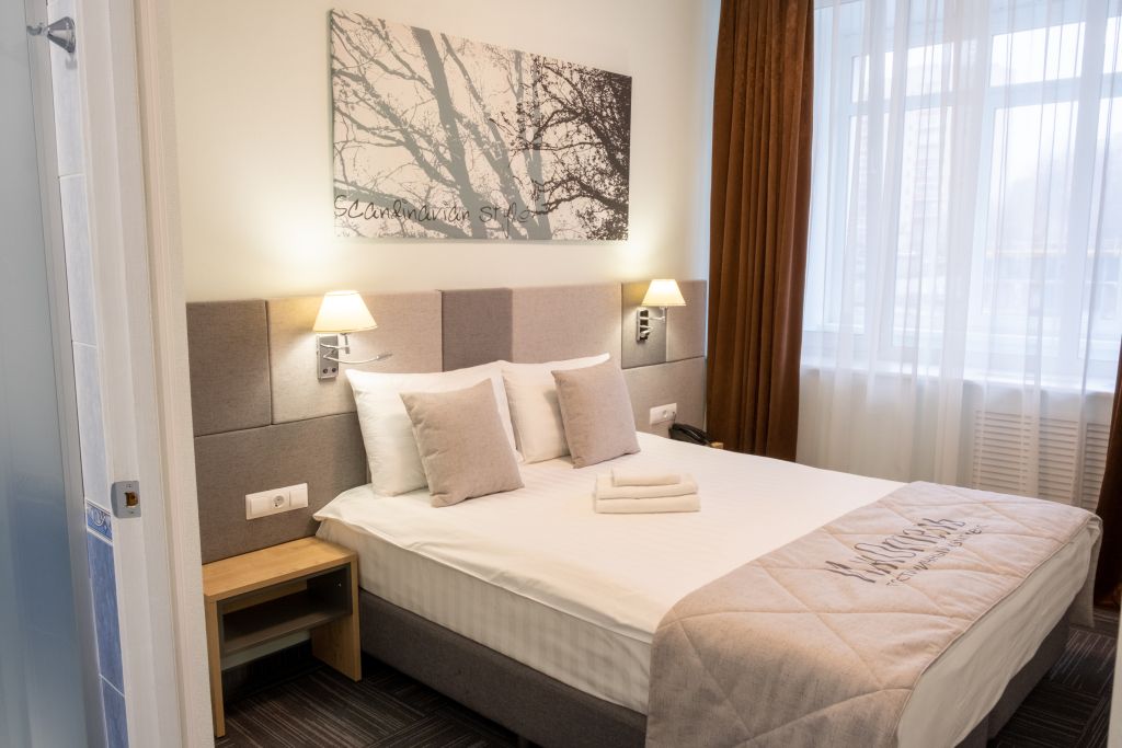 Уютный номер (площадью 19 кв.м.), удобная двуспальная кровать 1,6*2,0м с ортопедическим матрасом, которая может трансформироваться в две односпальные 0,8*2,0м, прикроватные тумбы и бра, рабочий стол, телевизор с плоским экраном, кондиционер, санузел с душевой кабиной, гигиенический душ, раковина. В номере шкаф-гардеробная. Панорамные окна. Количество комнат – 1. Двуспальная или две односпальные кровати. ЖК TV, телефон, кондиционер, холодильник Санузел: душевая кабина, унитаз, умывальник, гигиенический душ.Услуги и удобства