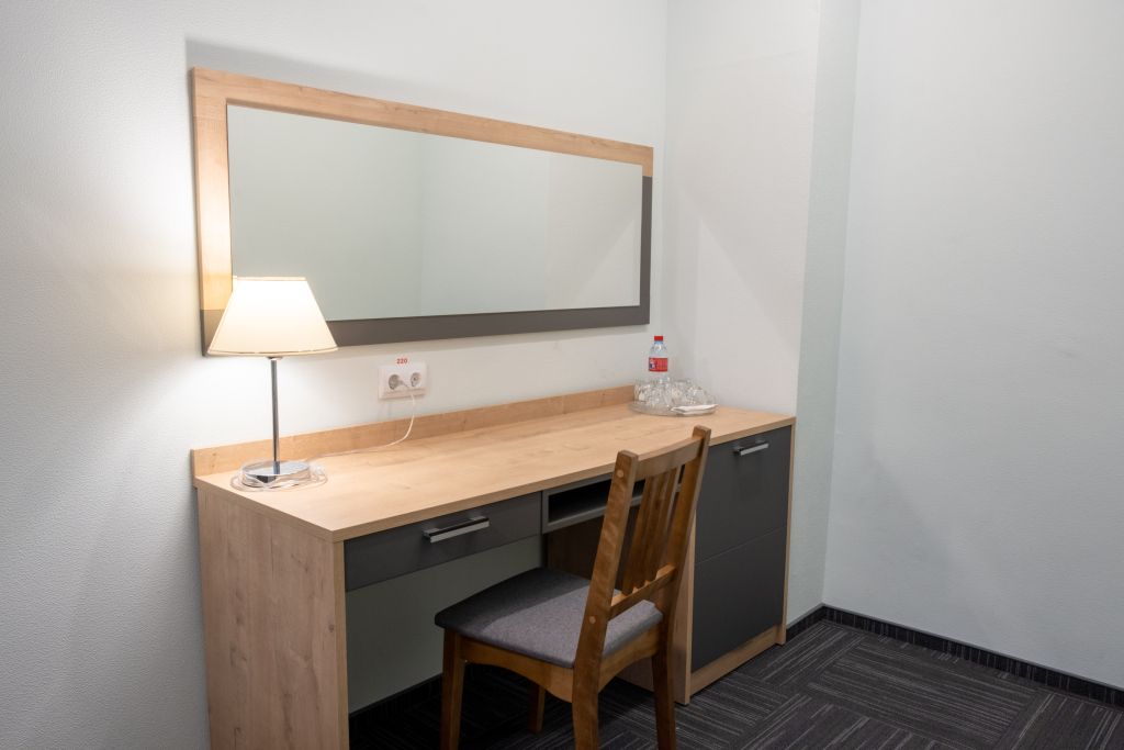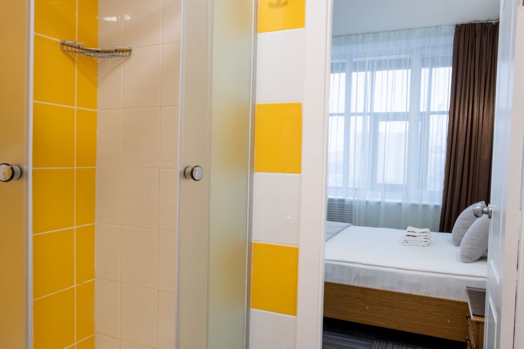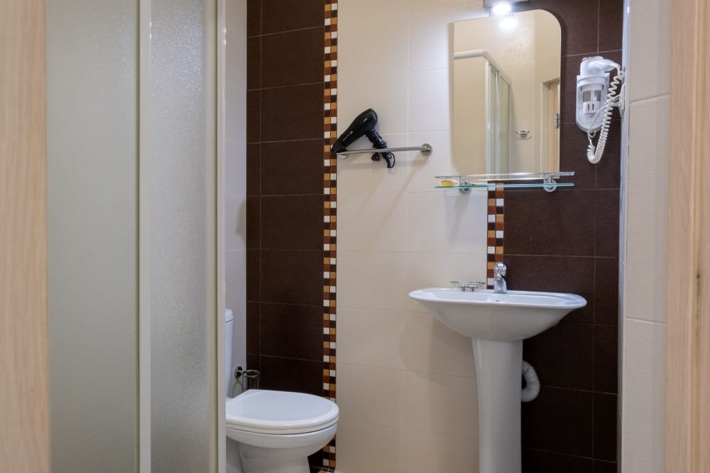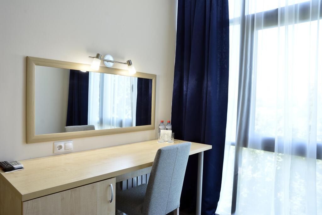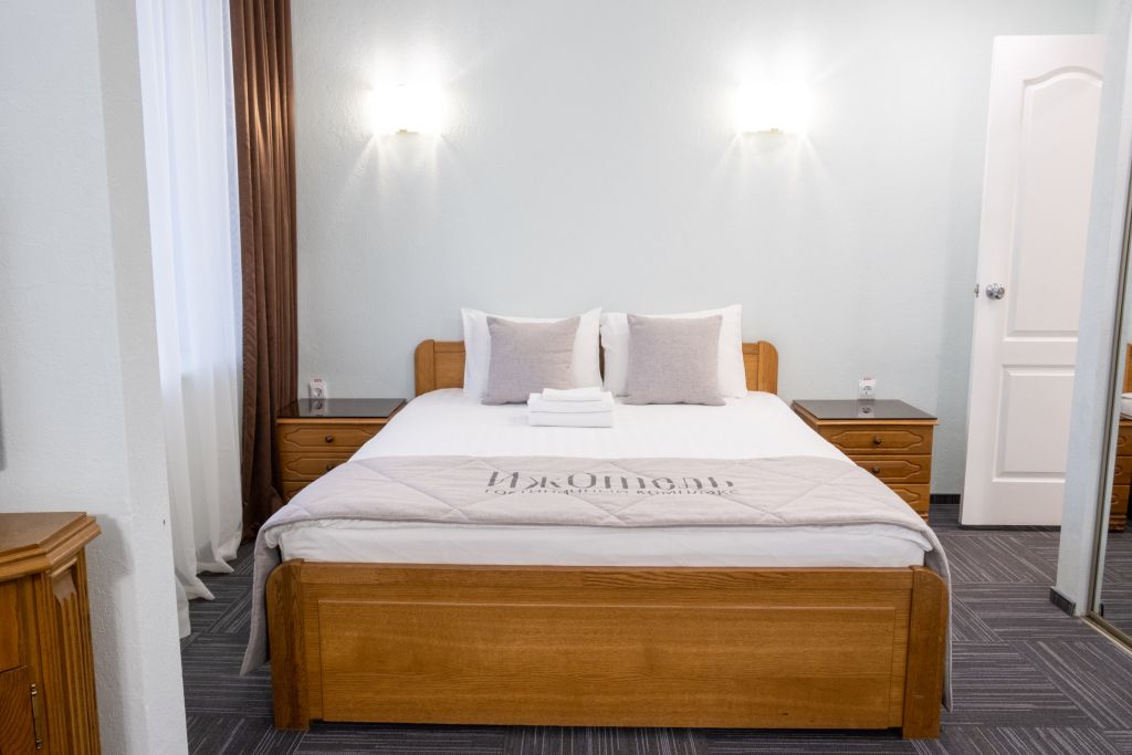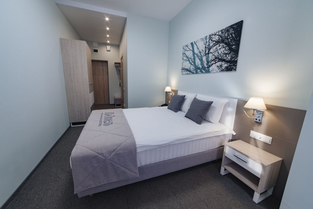 Уютный номер (площадью 19 кв.м.), удобная двуспальная кровать 1,6*2,0м с ортопедическим матрасом, которая может трансформироваться в две односпальные 0,8*2,0м, прикроватные тумбы и бра, рабочий стол, телевизор с плоским экраном, кондиционер, санузел с душевой кабиной, гигиенический душ, раковина. В номере шкаф-гардеробная. Панорамные окна. Количество комнат – 1. Двуспальная или две односпальные кровати. ЖК TV, телефон, кондиционер, холодильник Санузел: душевая кабина, унитаз, умывальник, гигиенический душ.Услуги и удобства