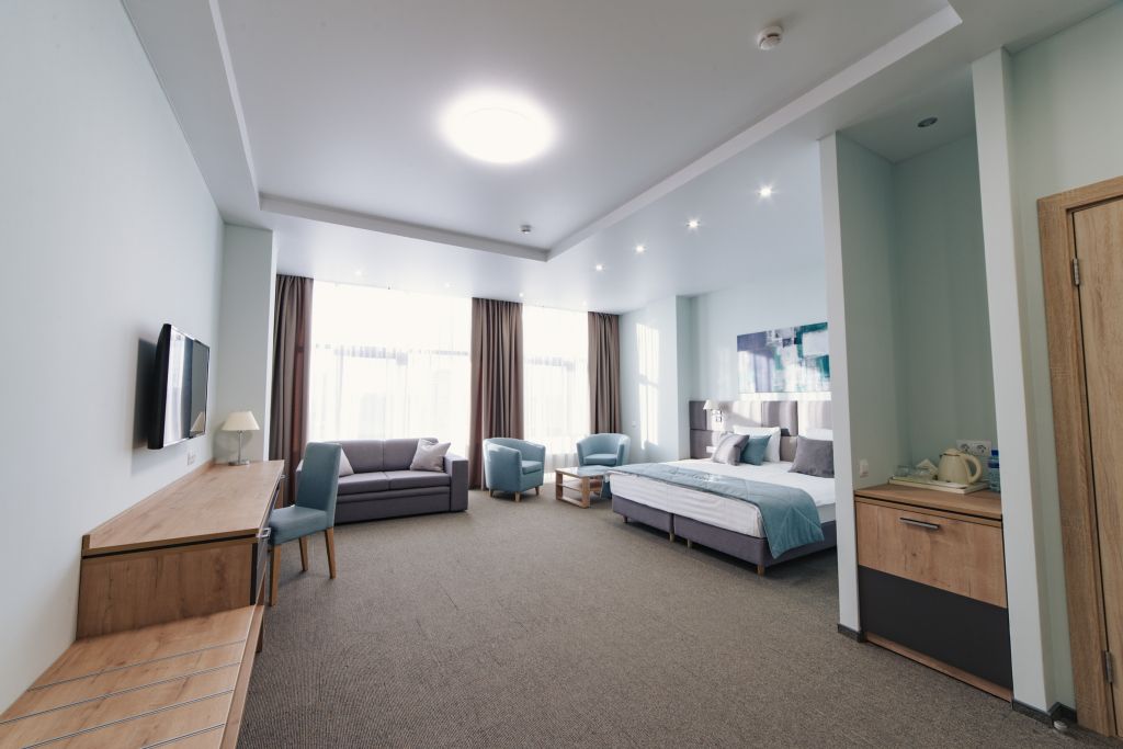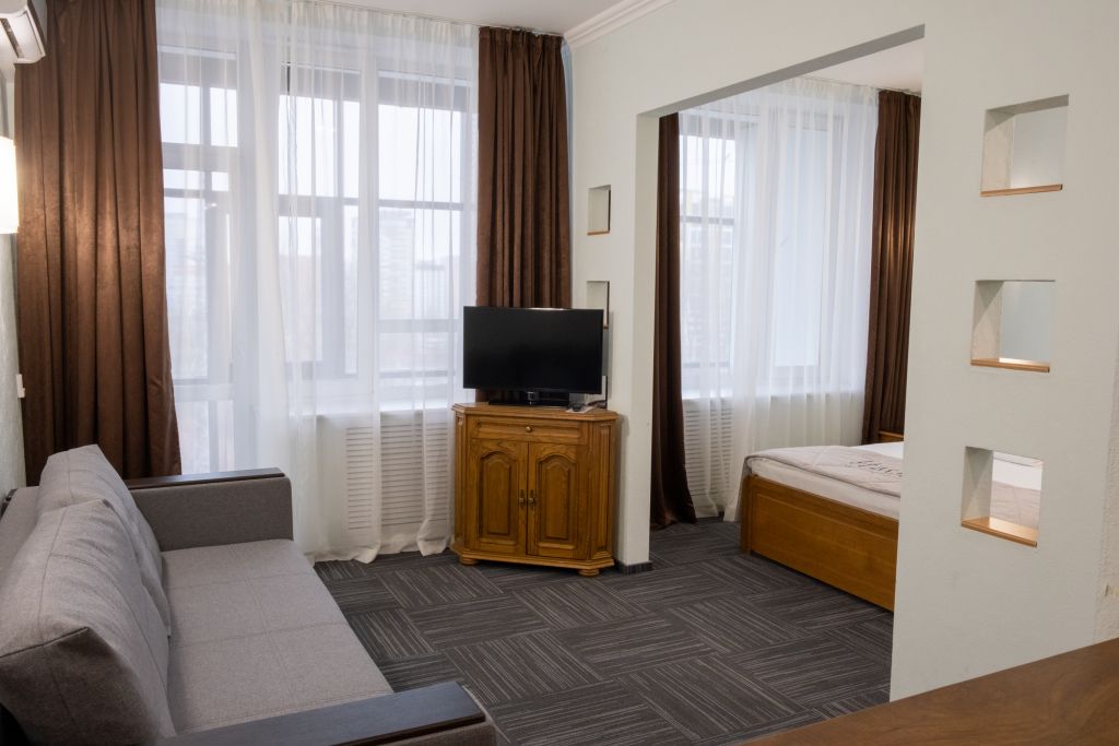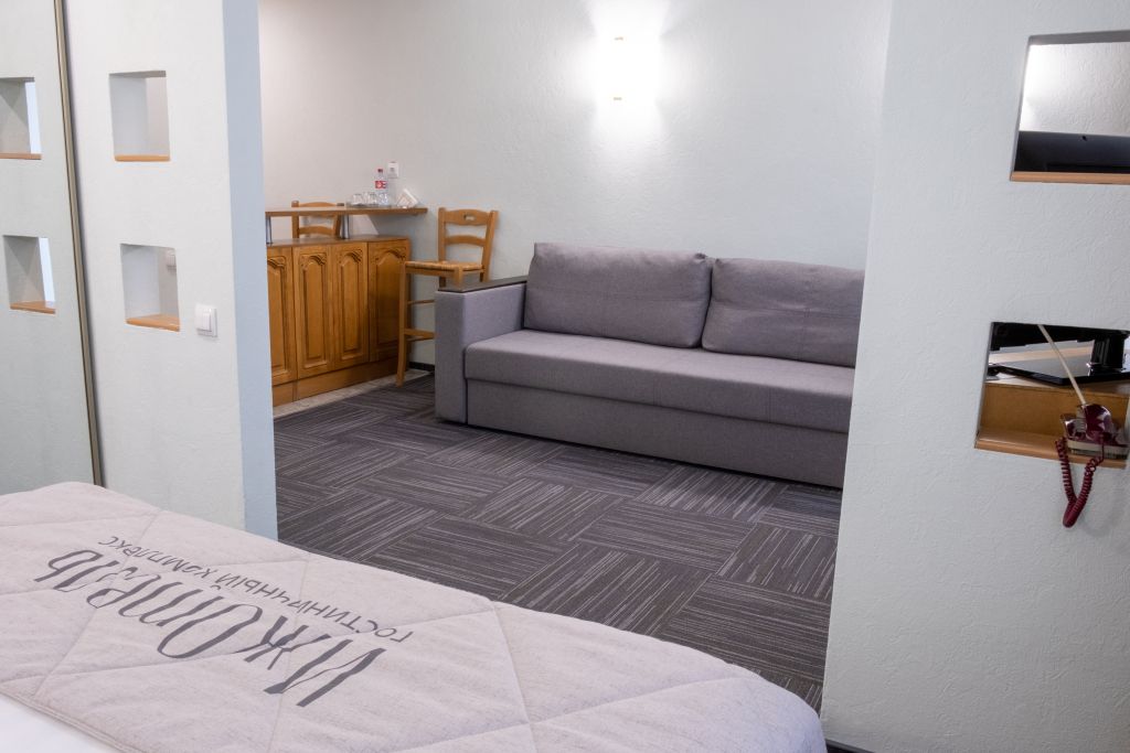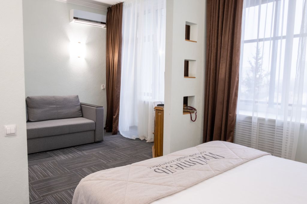 телевизор, кабельное телевидение, Wi-Fi, телефон, холодильник, кондиционер, светильник, фен, система безопасности, электронные замки, душевая кабина, биде, банные принадлежности, халаты, банные полотенца, тапочки, гигиенические средства, косметические средства, балкон, двуспальная кровать, диван, кресла, тумбы, стулья, гардеробная, вешалки, журнальный столик, багажная тумба, зеркало, пуфики, мебельный гарнитур, набор посуды, обслуживание номеров, информационная карта, меню, сейф, минеральная вода, унитаз, раковина, мягкая мебель, обеденная зона, гостиная зона, ковровое покрытие, отопление, вид на город, вид во двор, двуспальный раскладной диван-кроватьВ гостиничном номере