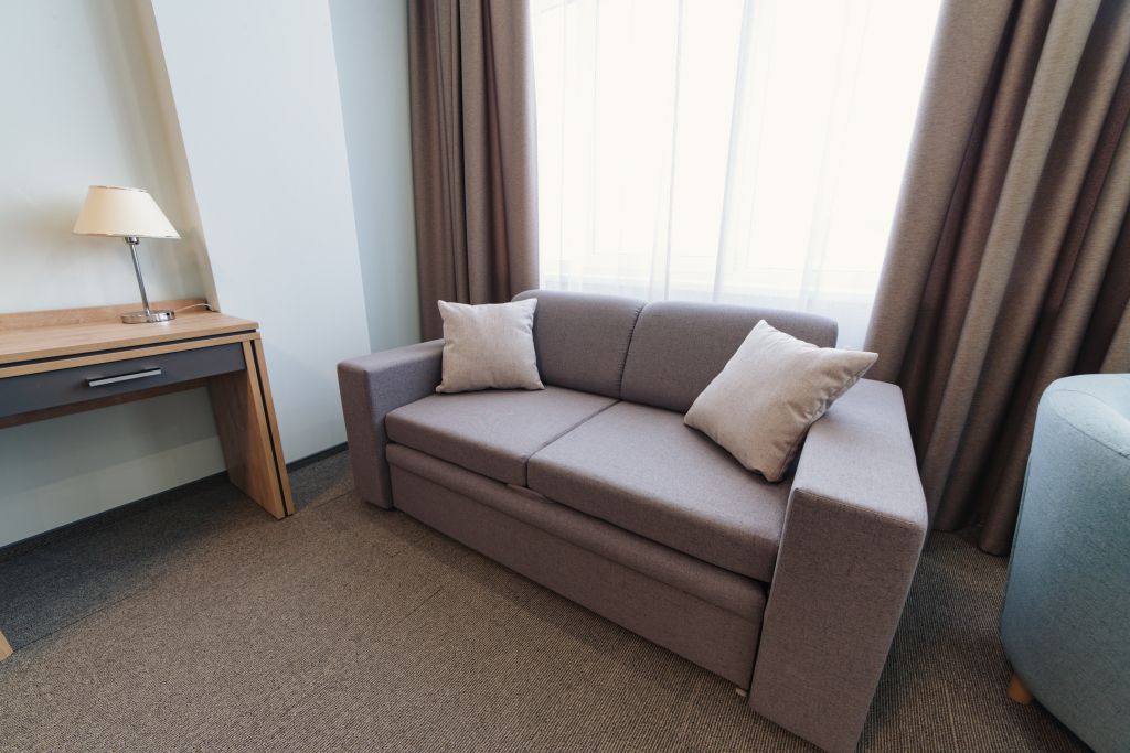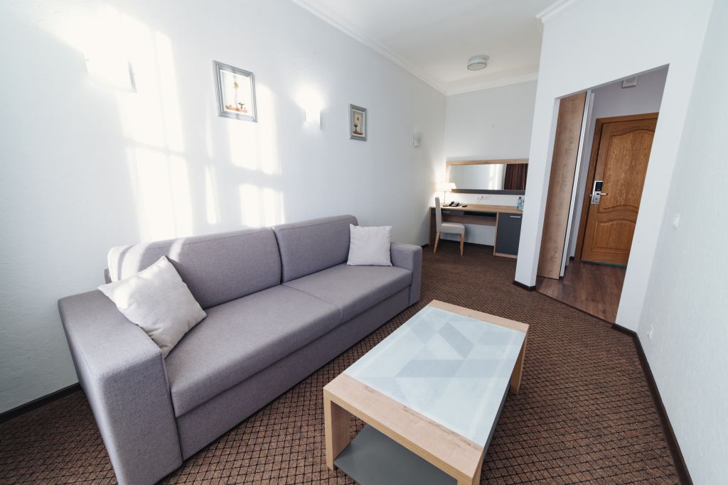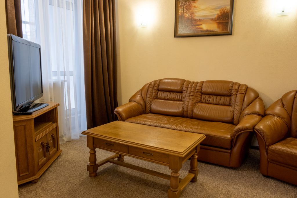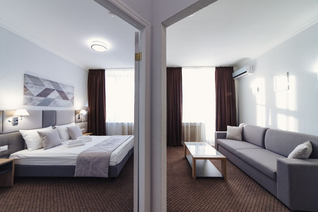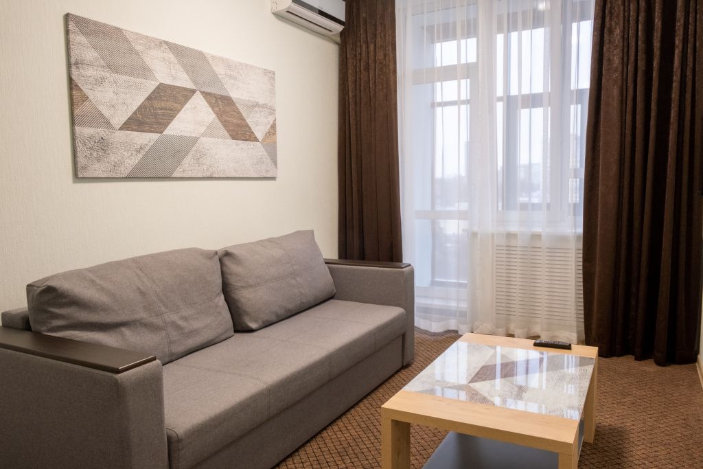 телевизор, кабельное телевидение, Wi-Fi, телефон, холодильник, кондиционер, светильник, фен, система безопасности, электронные замки, душевая кабина, биде, банные принадлежности, халаты, банные полотенца, тапочки, гигиенические средства, косметические средства, балкон, двуспальная кровать, диван, кресла, тумбы, стулья, гардеробная, вешалки, журнальный столик, багажная тумба, зеркало, пуфики, мебельный гарнитур, набор посуды, обслуживание номеров, информационная карта, меню, сейф, минеральная вода, унитаз, раковина, мягкая мебель, обеденная зона, гостиная зона, ковровое покрытие, отопление, вид на город, вид во двор, двуспальный раскладной диван-кроватьВ гостиничном номере