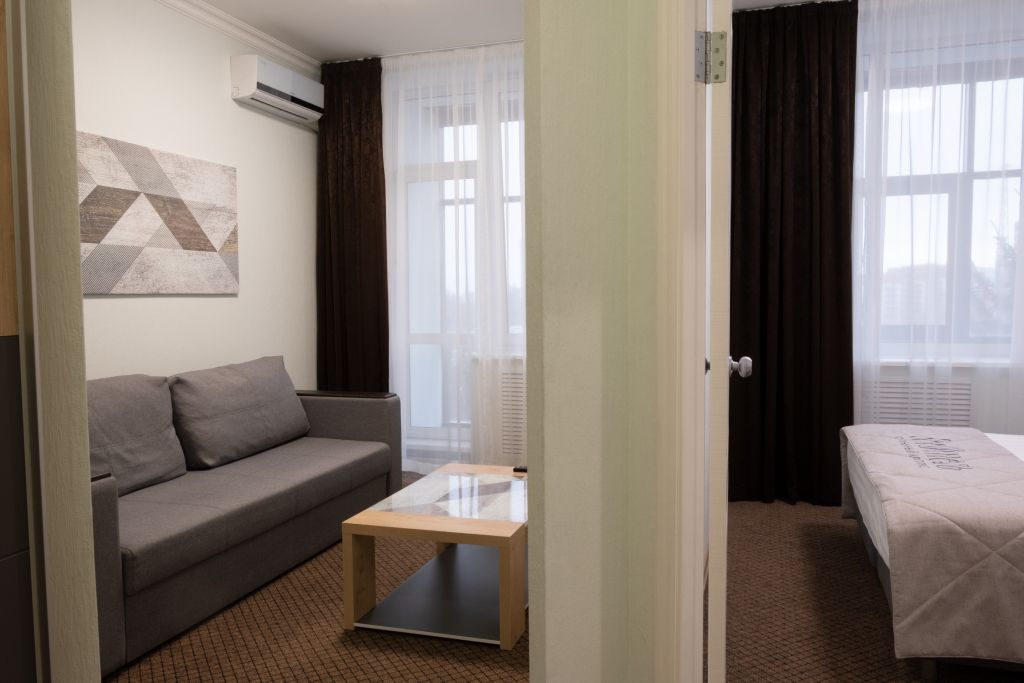 Количество комнат: 2 (изолированные) Спальная - двуспальная кровать (трансформация в две односпальные) Гостиная - раскладной двуспальный диван, рабочий стол Санузел - душевая кабина, раковина, унитаз, биде. Комфортное размещение до 4-х человек.Услуги и удобства