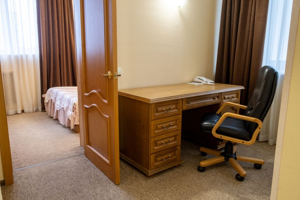 телевизор, кабельное телевидение, Wi-Fi, телефон, холодильник, кондиционер, светильник, фен, система безопасности, электронные замки, микроволновая печь, обогреватель, душевая кабина, ванная с джакузи, гидромассажный душ, дополнительный санузел, биде, банные принадлежности, халаты, банные полотенца, тапочки, гигиенические средства, косметические средства, балкон, двуспальная кровать, диван, кресла, тумбы, стулья, гардеробная, вешалки, журнальный столик, письменный стол, обеденный стол, багажная тумба, барная стойка, зеркало, комод, мебельный гарнитур, набор посуды, обслуживание номеров, информационная карта, меню, сейф, минеральная вода, чайник, унитаз, раковина, мягкая мебель, косметическое зеркало, обеденная зона, гостиная зона, ковровое покрытие, отопление, вид на город, три комнаты, кабинет, кулер на этаже, вид во дворВ гостиничном номере
