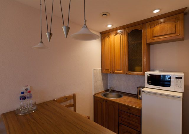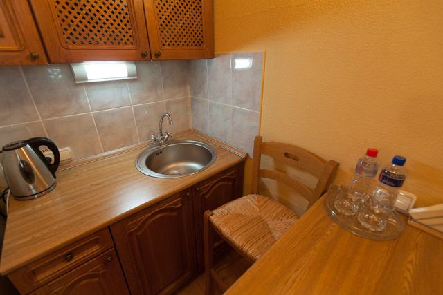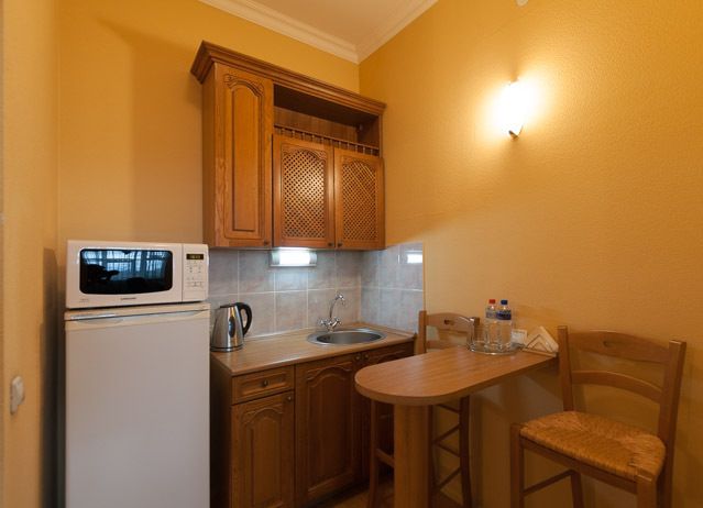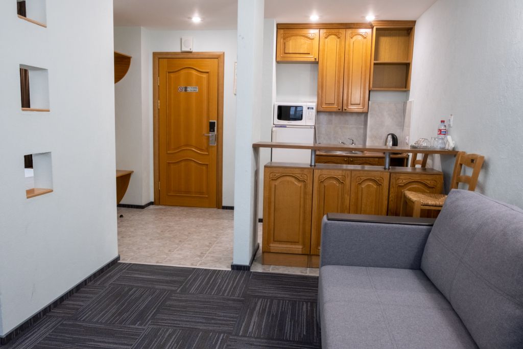 Количество комнат: 1 (зона спальни, гостиной, кухня-бар); Санузел - душевая кабина, раковина, унитаз, биде. Двуспальная кровать, Двуспальный раскладной диван. Телевизор, телефон, холодильник, кондиционер.Услуги и удобства