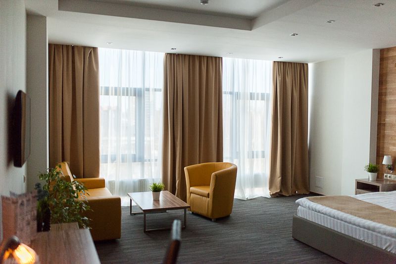 телевизор, кабельное телевидение, Wi-Fi, телефон, холодильник, кондиционер, светильник, настольные лампы, фен, электронные замки, душевая кабина, ванна, ванна или душевая кабина, санузел, биде, халаты, банные полотенца, тапочки, гигиенические средства, косметические средства, кровать «King size», ортопедический матрас, диван, кресла, тумбы, стулья, шкаф для одежды, гардеробная, вешалки, журнальный столик, письменный стол, багажная тумба, зеркало, комод, мебельный гарнитур, набор посуды, обслуживание номеров, информационная карта, меню, сейф, минеральная вода, чайник, унитаз, раковина, мягкая мебель, косметическое зеркало, обеденная зона, гостиная зона, ковровое покрытие, отопление, вид на город, кресло, вид во дворВ гостиничном номере