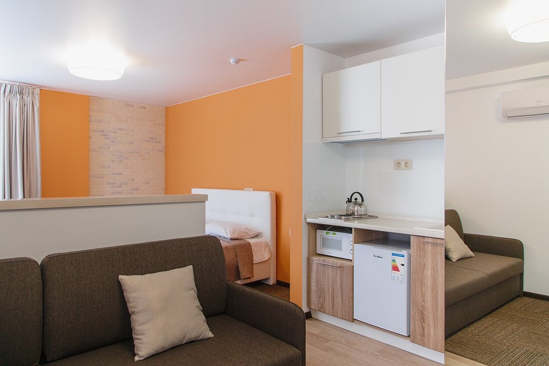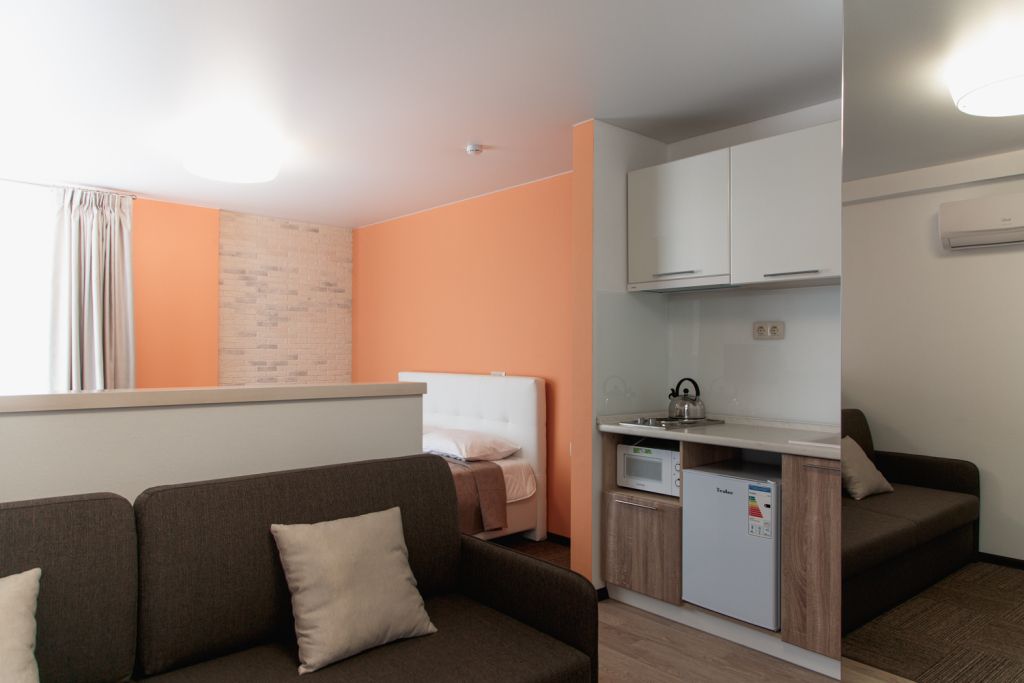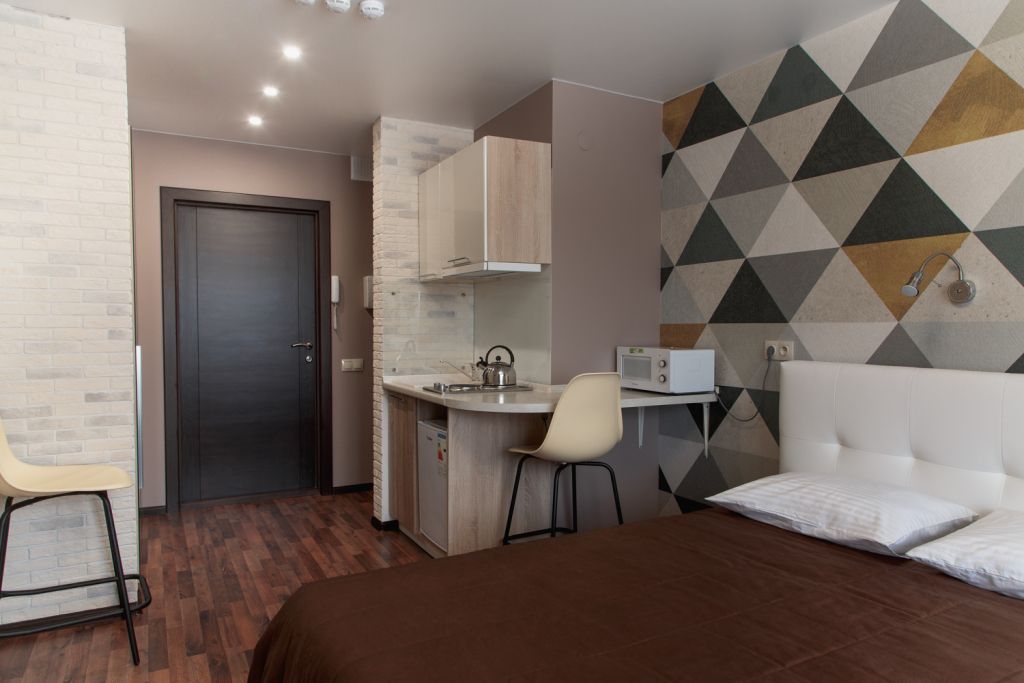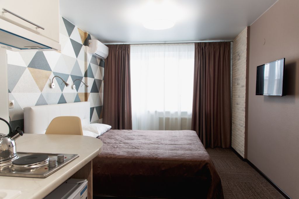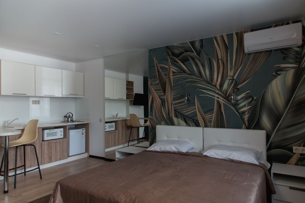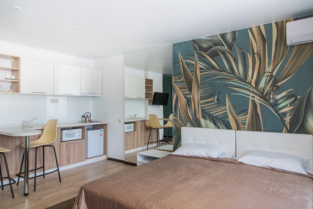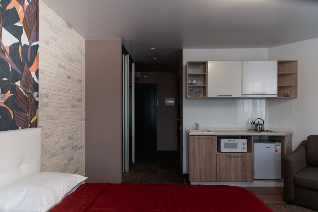 Небольшой, но очень уютный номер. Большая кровать, и миникухня, делают номер функциональным. Оснащен всем необходимым для длительного проживания.Услуги и удобства