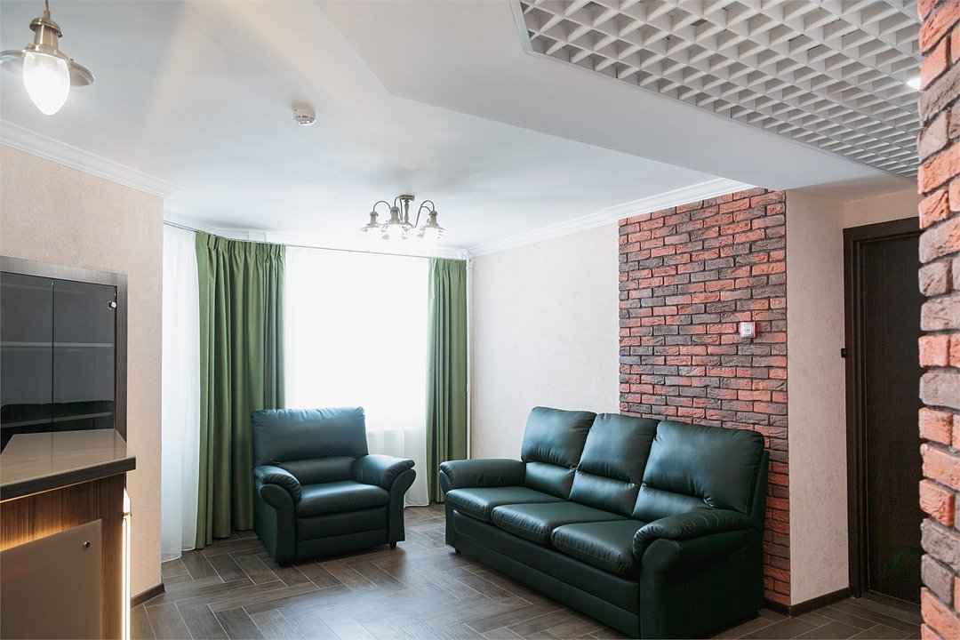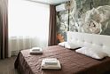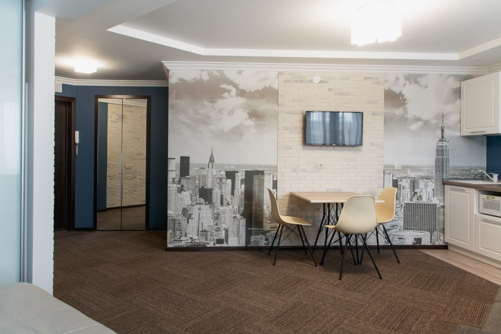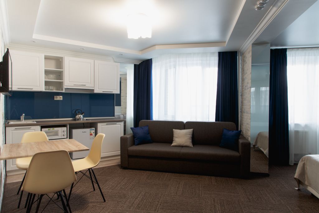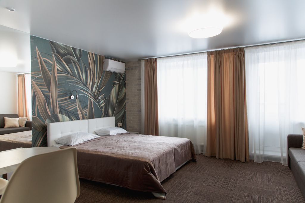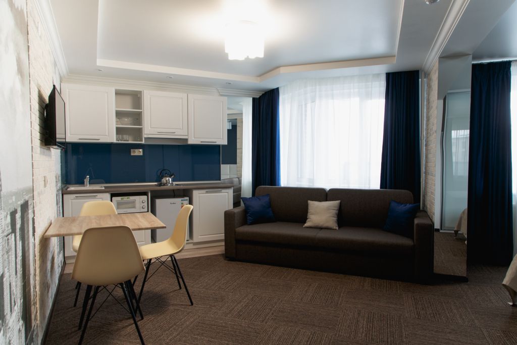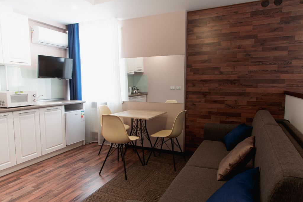Очень комфортабельный и уютный номер. Прекрасно подойдет для длительного проживания, ведь номер оборудован всем необходимым для этого. Большая кровать, двуспальный раскладной диван, миникухня с набором всей необходимой посуды. Всего в отеле 5 номеров данной категории и каждый выполнен в своем стиле, с неповторимым дизайном.Услуги и удобства