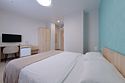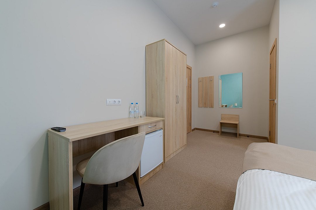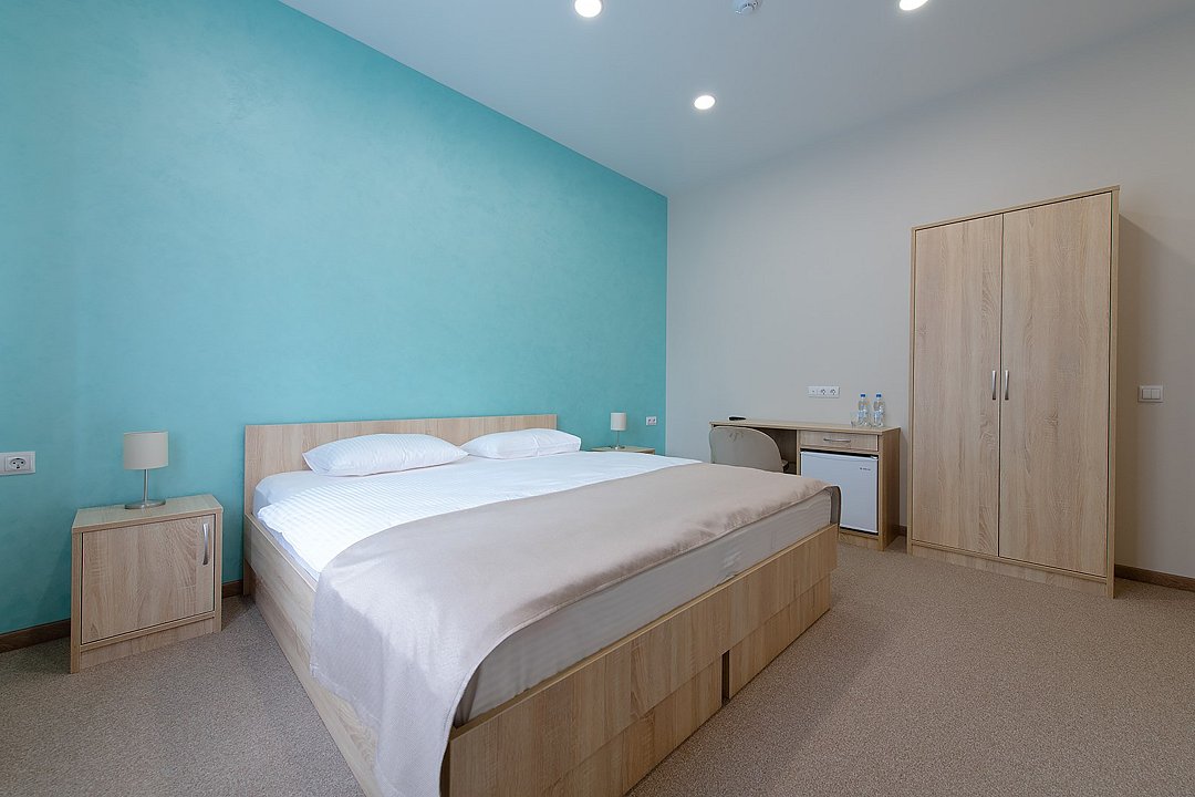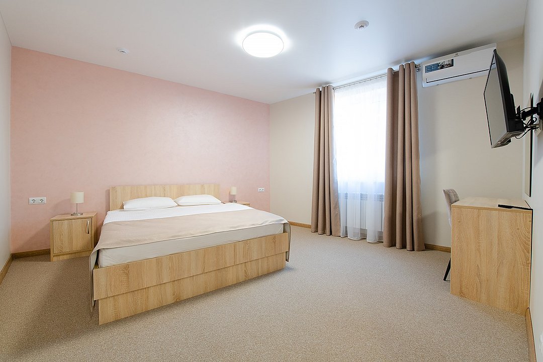 Уютные номера, которые отлично подойдут для одного или двух человек. В комнате одна большая кровать, рабочая зона, телевизор, шкаф с сейфом для ценных вещей и документов с индивидуальным кодовым замком, холодильник, кондиционер, прикроватные тумбочки со светильниками. В ванной комнате: душевая, туалет, фен, средства личной гигиены и полотенца.Услуги и удобства
