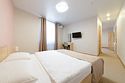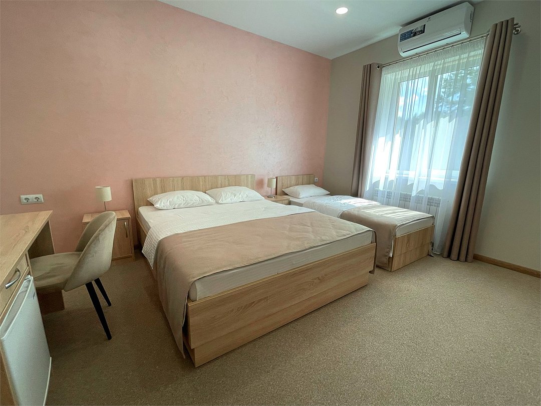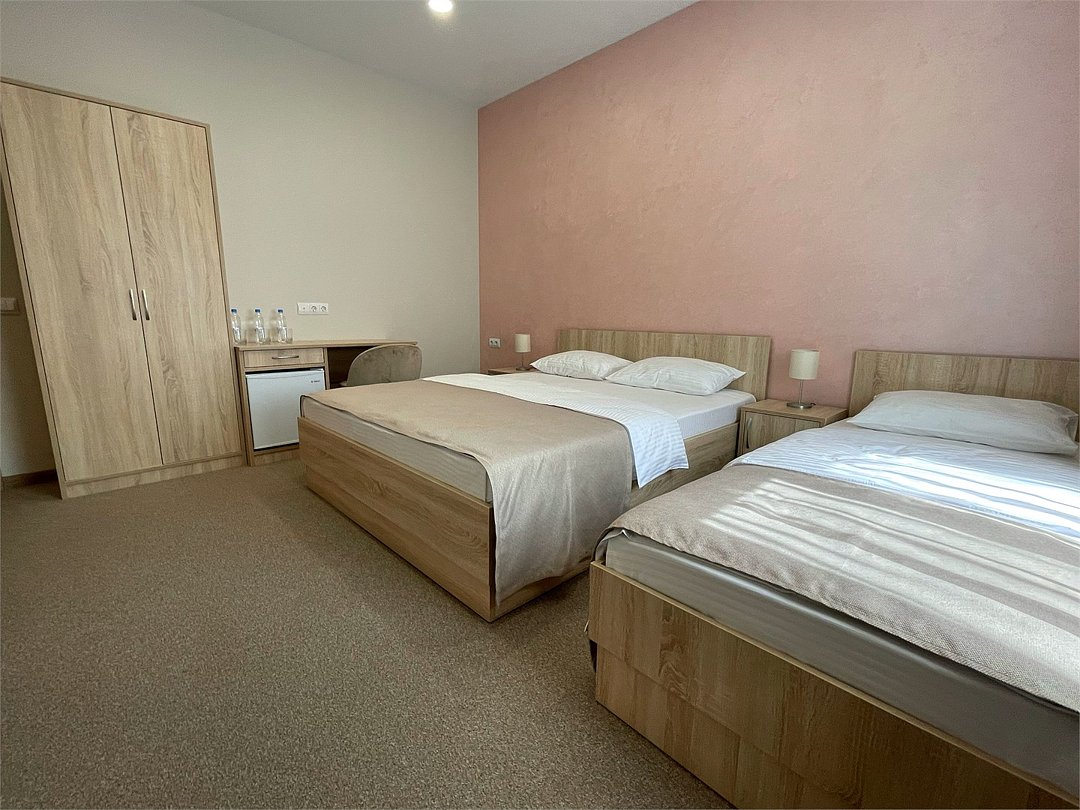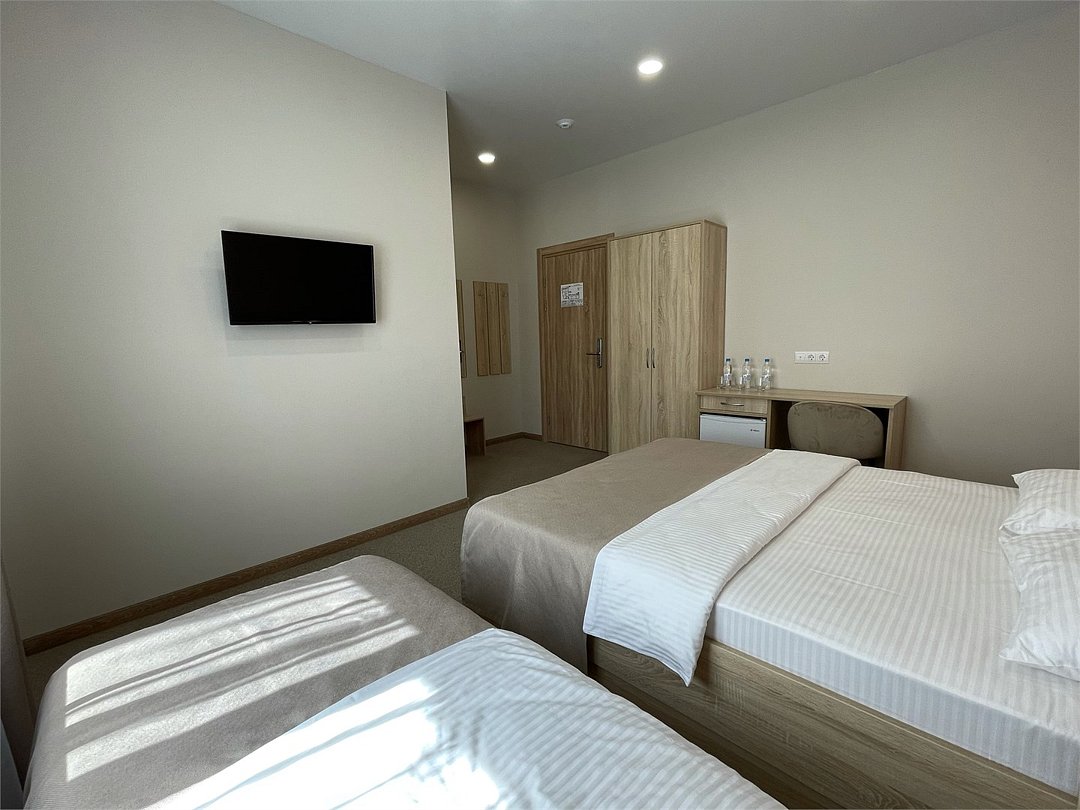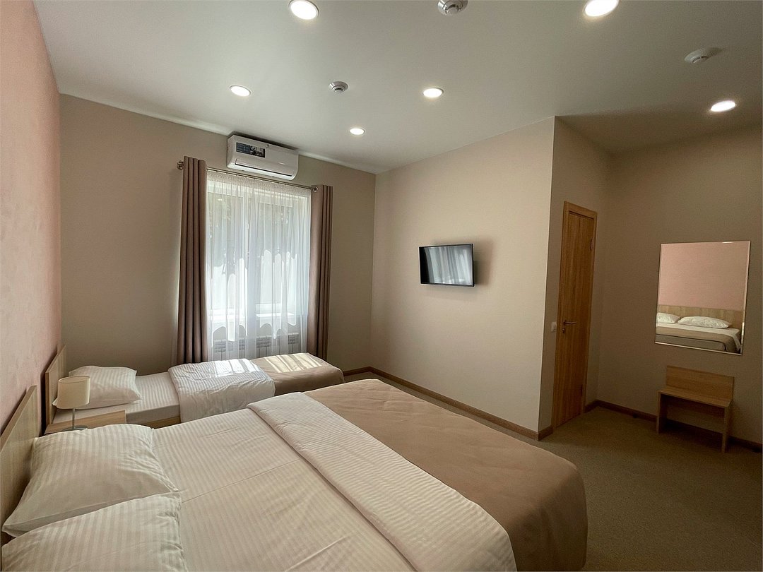 Уютный номер с большой двуспальной кроватью «King size» и односпальной кроватью. В данном номере есть телевизор, холодильник, стол, шкаф с сейфом для ценных вещей и документов с индивидуальным кодовым замком, холодильник, кондиционер, прикроватные тумбочки со светильниками. В ванной комнате: душевая, туалет, фен, средства личной гигиены и полотенца.Услуги и удобства
