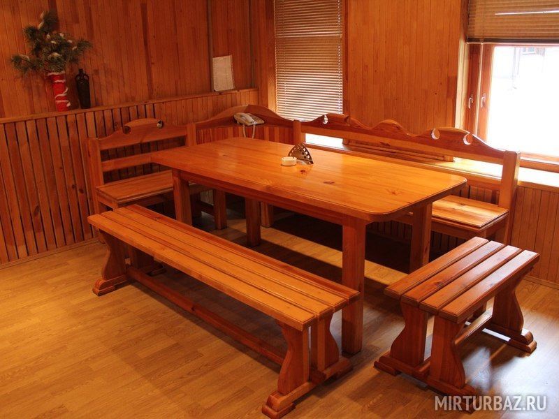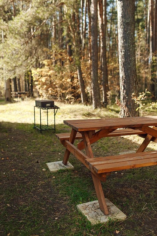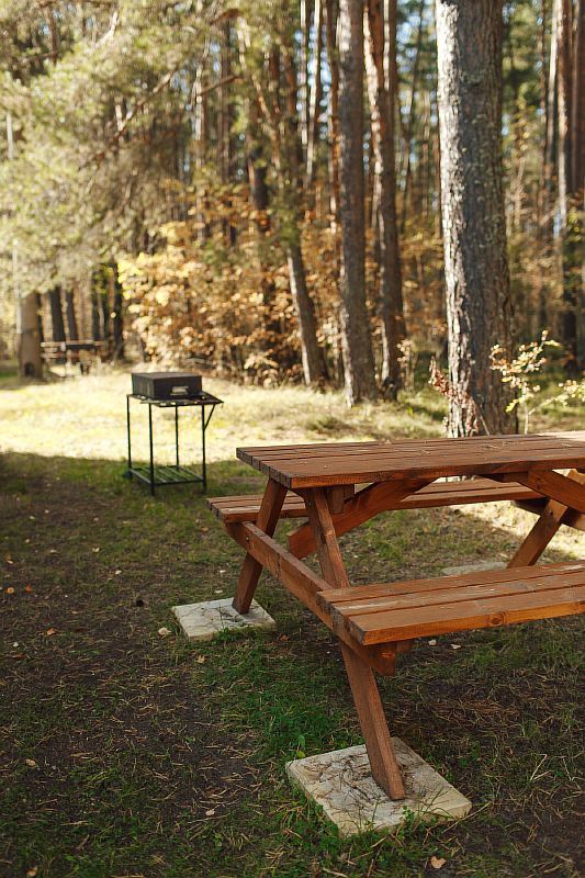 Обустройство: деревянная мебель, освещение, электричество, мангал рядом.