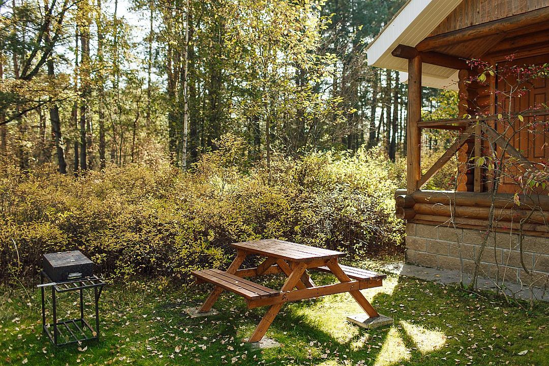 Обустройство: встроенный мангал, деревянная мебель, освещение, электричество.