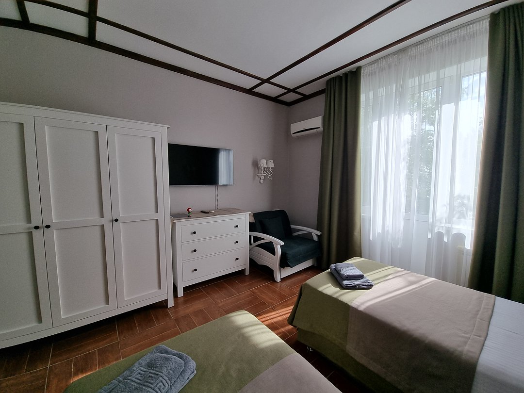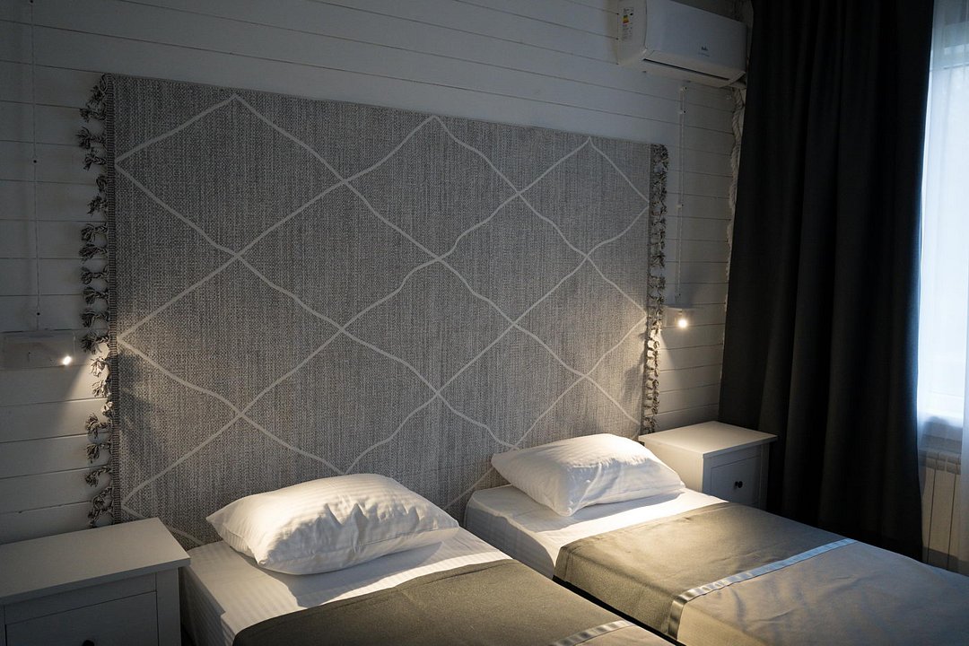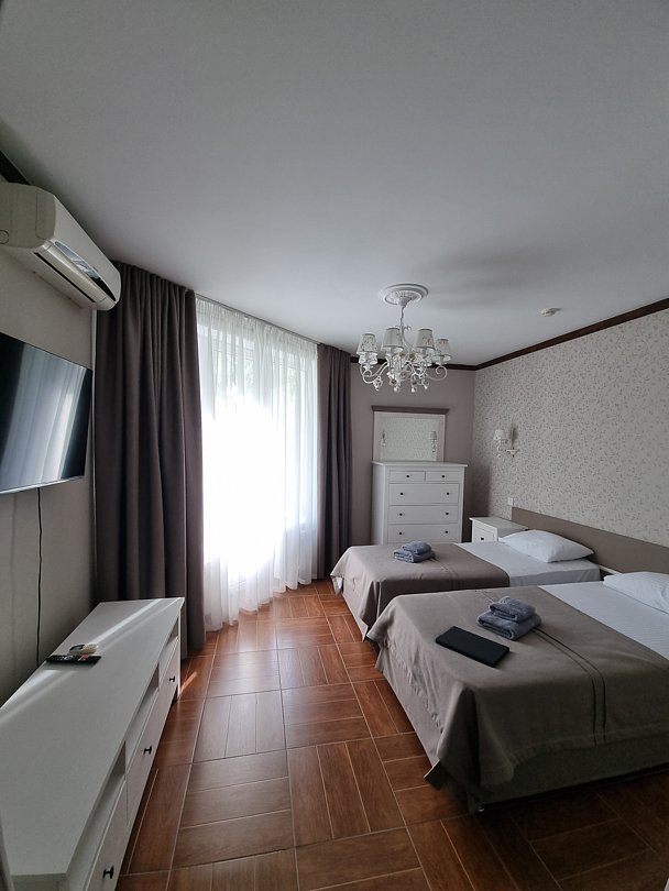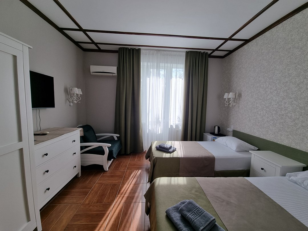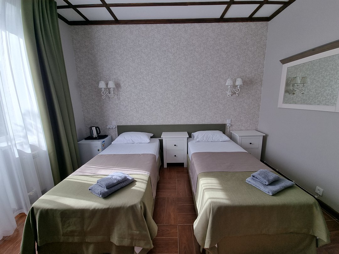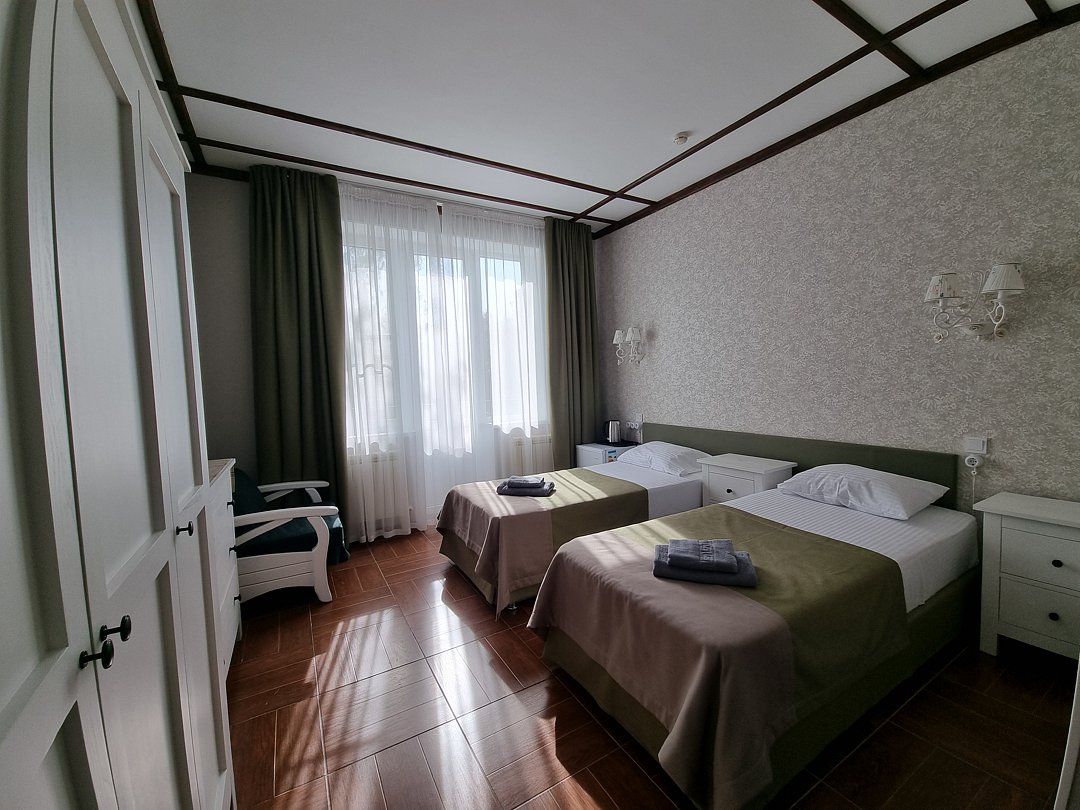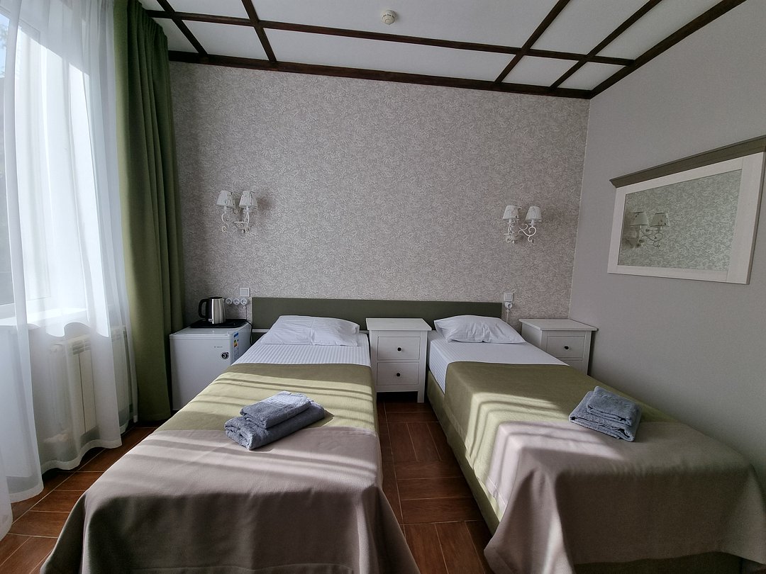 Комфортабельный номер, рассчитанный на размещение 2-х человек. В номере: 2 односпальные кровати, санузел, душ, туалетные принадлежности, халаты вафельные (при размещении более 3 суток), тапочки (при размещении более 3 суток), холодильник, чайник, набор посуды с комплектом столовых приборов, вместительный шкаф с комплектом вешалок, регулируемая система кондиционирования, номер телефона для связи с администратором, пожарная сигнализация, фен, утюг и гладильные принадлежности (по запросу), Wi-Fi. Уборка в номерах производится ежедневно, смена постельного белья и полотенец – каждые 3 дня. Имеется 1 доп.место кресло-кровать.