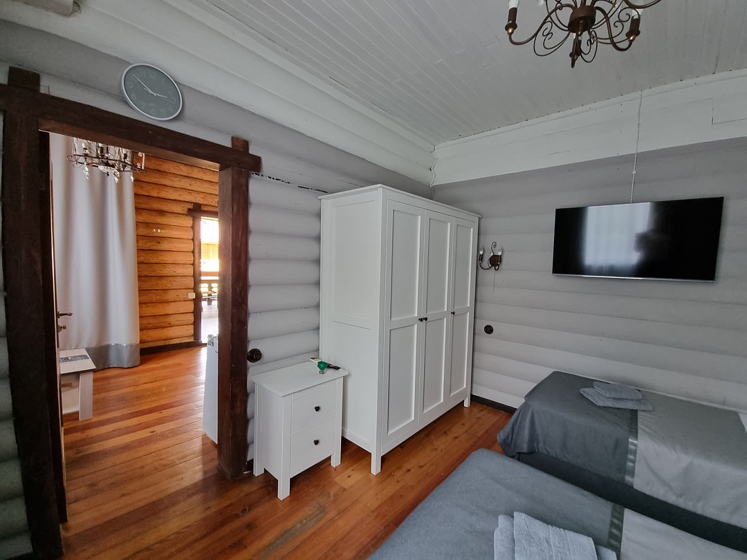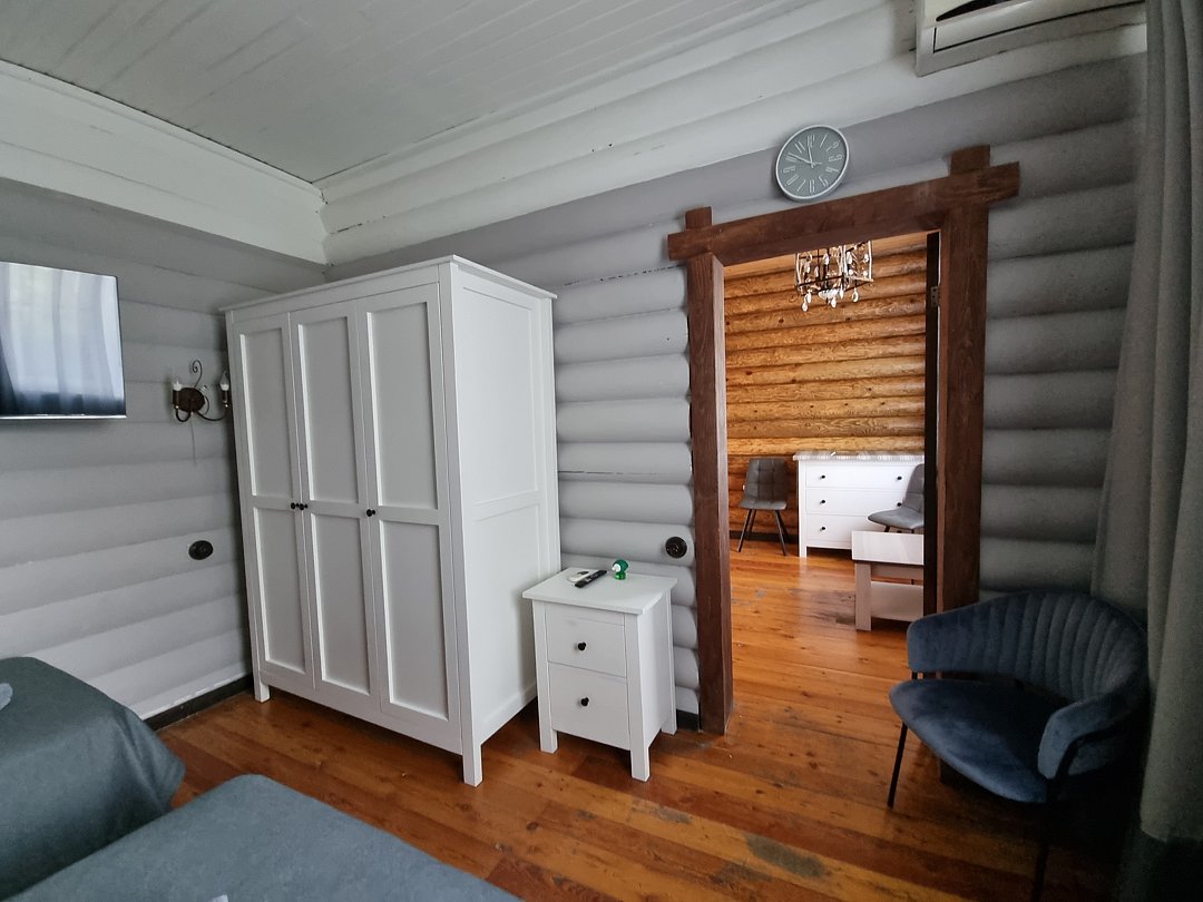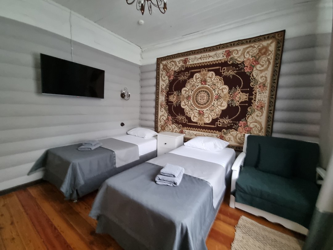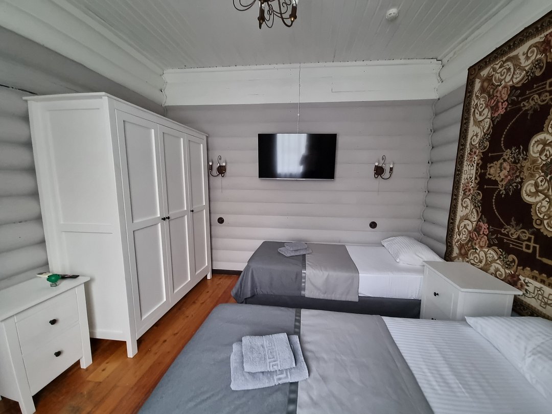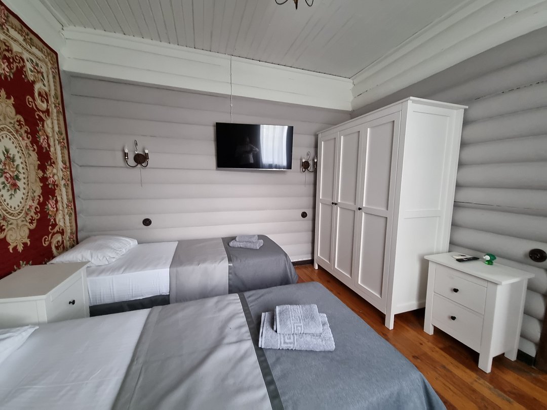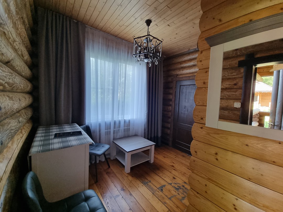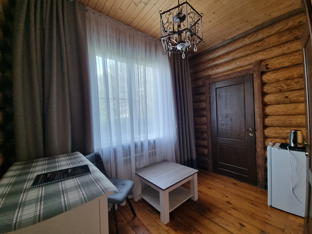 В номере сруба имеется: Санузел, душ, туалетные принадлежности, халаты вафельные (при размещении более 3 суток), тапочки (при размещении более 3 суток), холодильник, чайник, набор посуды с комплектом столовых приборов, вместительный шкаф с комплектом вешалок, регулируемая система кондиционирования, номер телефона для связи с администратором, кровати 2 односпальные, пожарная сигнализация, фен, утюг и гладильные принадлежности (по запросу), Wi-Fi. Уборка в номерах производится ежедневно, смена постельного белья и полотенец – каждые 3 дня. Имеется 1 доп. место кресло-кровать.