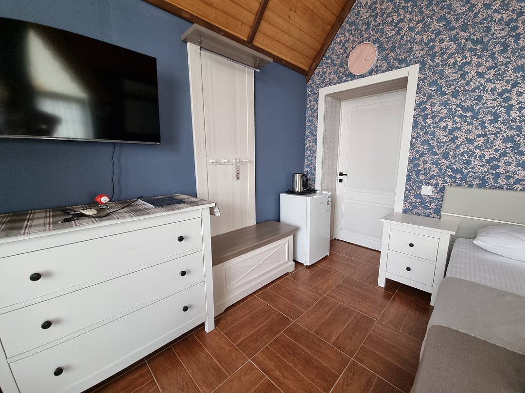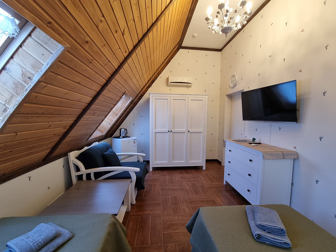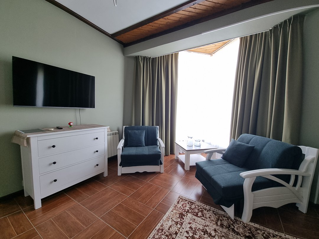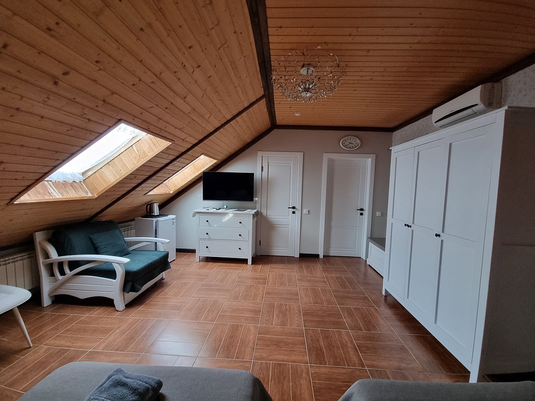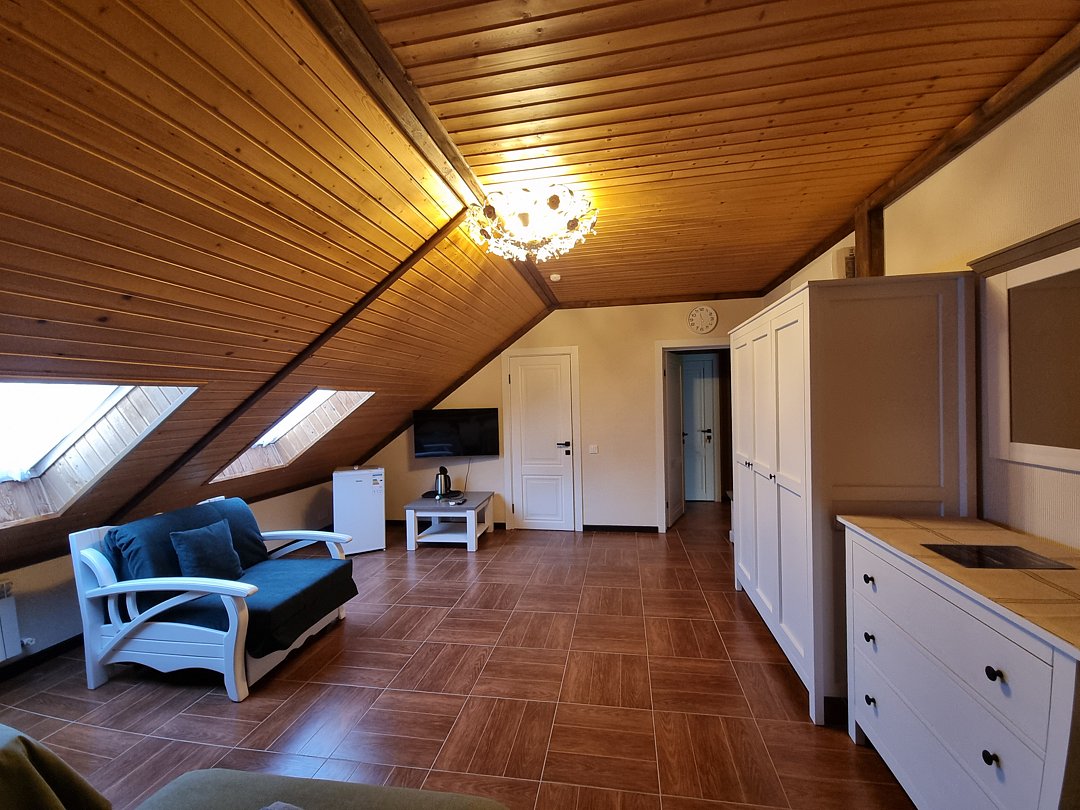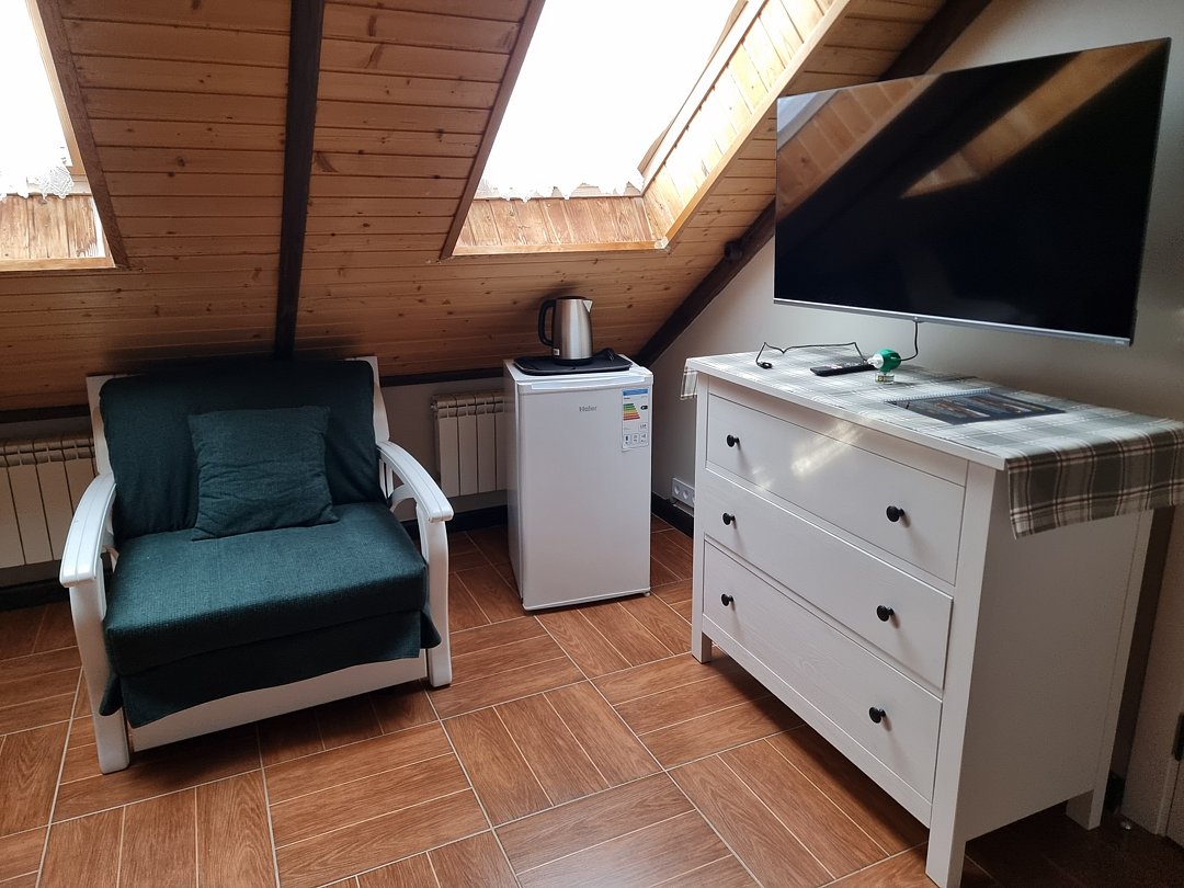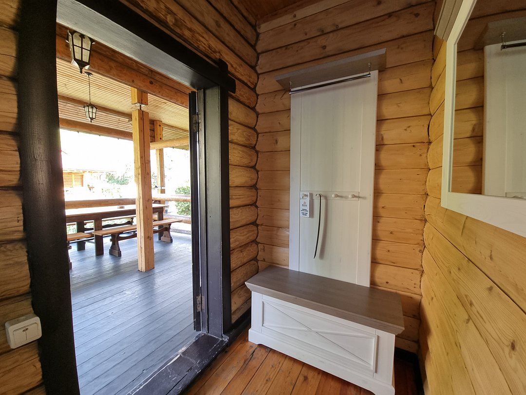 В номере сруба имеется: Санузел, душ, туалетные принадлежности, халаты вафельные (при размещении более 3 суток), тапочки (при размещении более 3 суток), холодильник, чайник, набор посуды с комплектом столовых приборов, вместительный шкаф с комплектом вешалок, регулируемая система кондиционирования, номер телефона для связи с администратором, кровати 2 односпальные, пожарная сигнализация, фен, утюг и гладильные принадлежности (по запросу), Wi-Fi. Уборка в номерах производится ежедневно, смена постельного белья и полотенец – каждые 3 дня. Имеется 1 доп. место кресло-кровать.