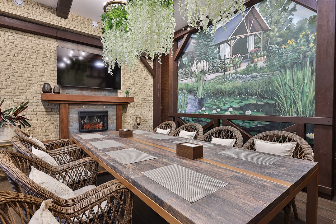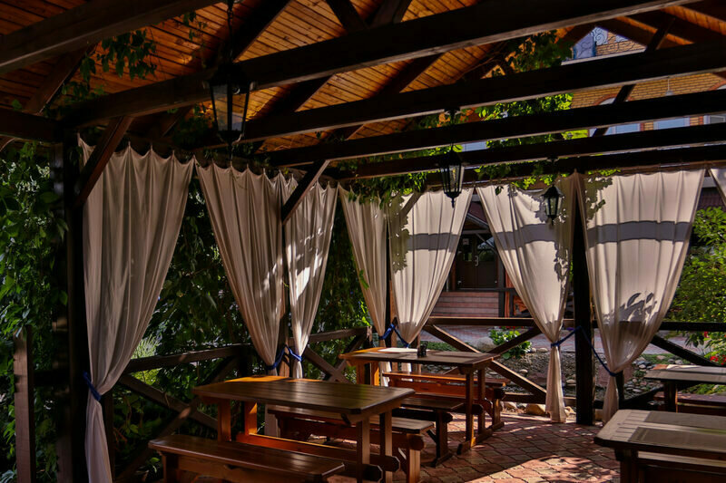 Имеются два зала: основной и банкетный, а также кафе-гриль на открытом воздухе. В ресторане представлены традиционная русская и европейская кухни. В баре ресторана имеется большая коллекция вин, крепких алкогольных и прохладительных напитков.