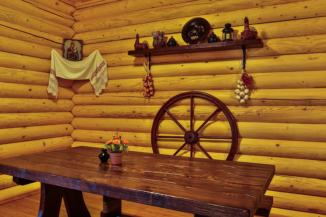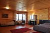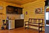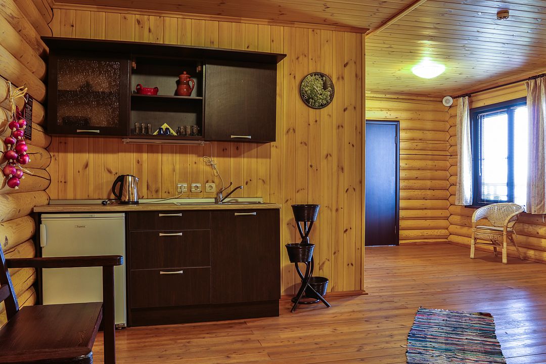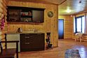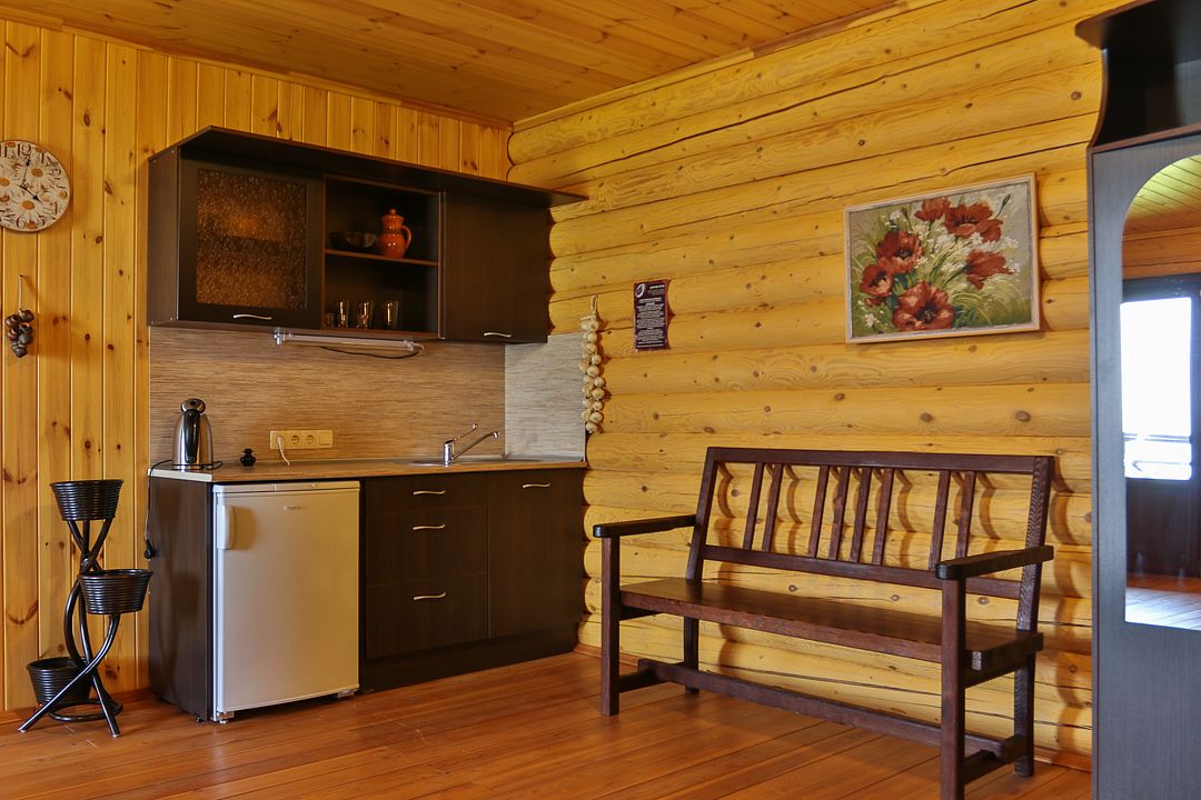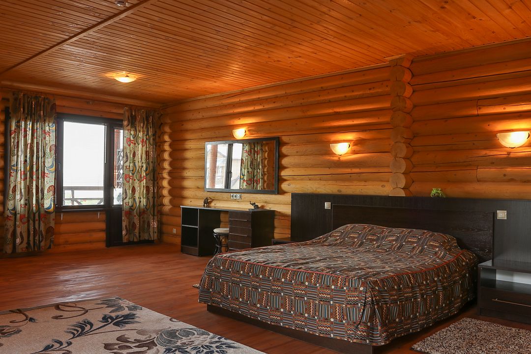 Это трехэтажное здание из экологически чистого круглого бруса, имеющее холодное и горячее водоснабжение, канализацию. На первом этаже находятся двухместные номера категории люкс: все номера имеют балконы, c которых открывается живописный вид на озеро Шира и прекрасный сад.