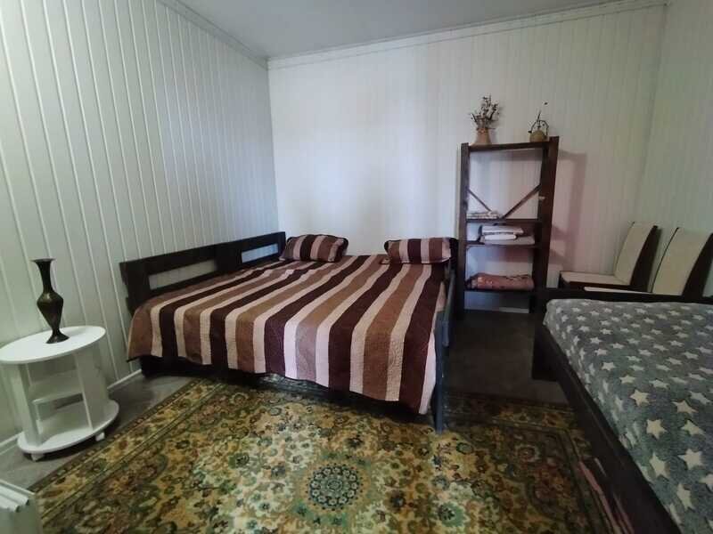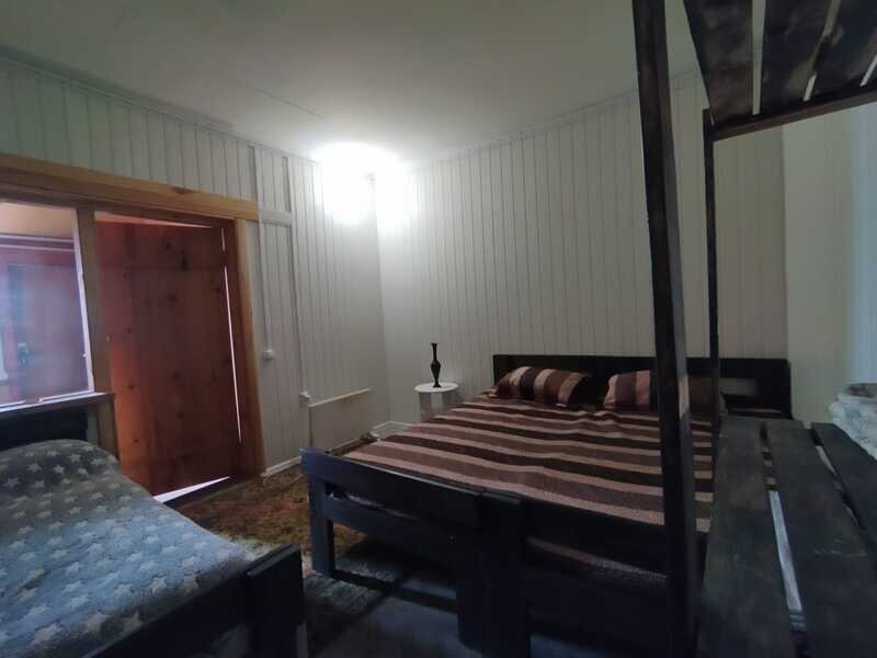 Номер на 1 м этаже из трёх комнат, 2 изолированные по 3 односпальных кровати в каждой, 1 проходная - с 2 диван-кроватями. Вместимость до 10 человек. Санузел, душ, кухня на территории
