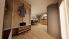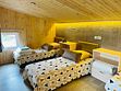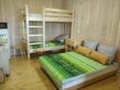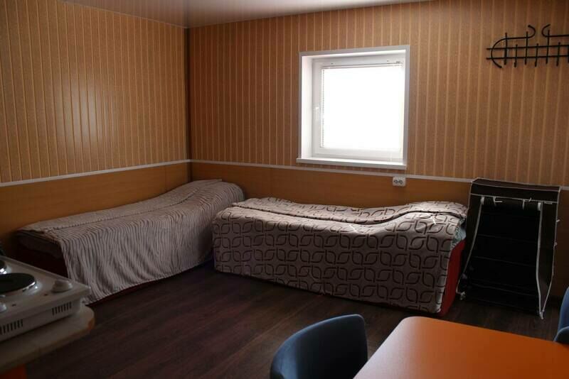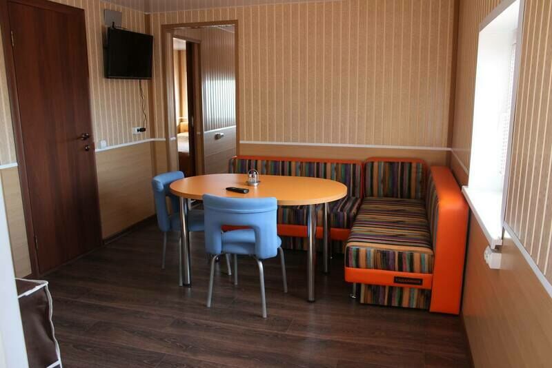 В спальне — две односпальные кровати и одна двухъярусная (полноценные спальные места), столик, стулья, тумбочки, полки для одежды, телевизор. Односпальные кровати комфортно соединяются в одну двуспальную. На кухне — гарнитур, холодильник, плита, СВЧ, посуда для приготовления и сервировки, кухонная утварь. Душ и туалет раздельные, в туалете есть раковина, входы их кухонной зоны.