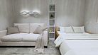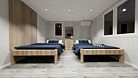 В спальне — две односпальных кровати (комфортно сдвигаются в одну), односпальная софа (раскладывается в полноценное спальное место, в сложенном виде 110*80 см.), комод, телевизор. Индивидуальная кухня с обеденной зоной, оборудованной гарнитуром, холодильником, плитой, СВЧ, посудой для приготовления и сервировки, кухонной утварью и двумя диванами находится в общей для двух номеров гостиной (кухня у каждого номера своя). Окна кухни выходят на две стороны – зону для загара, кафе и барбекю. Ванна и туалет совмещены, есть раковина, вход из спальни.