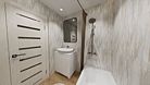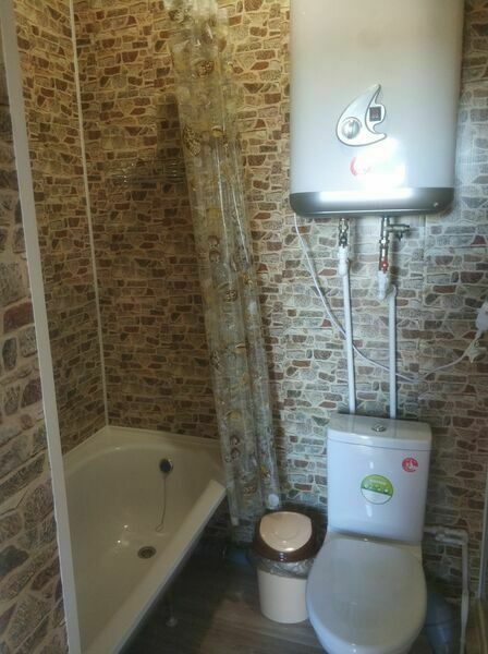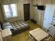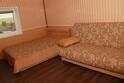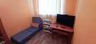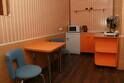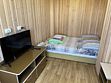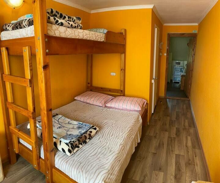 В спальне — добротная двухъярусная кровать (внизу 2 места, вверху одно), модульное кресло, столик, стулья, тумбочка, полки для одежды, телевизор. На кухне — гарнитур, холодильник, плита, СВЧ, посуда для приготовления и сервировки, кухонная утварь. Ванна и туалет совмещены, вход из спальни.
