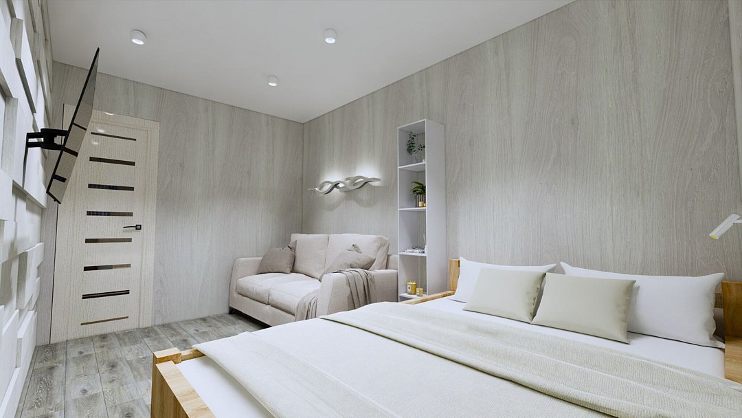 Площадь: 14 м2 — спальня, с/узел; 11 м2 — кухонная зона.