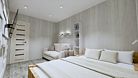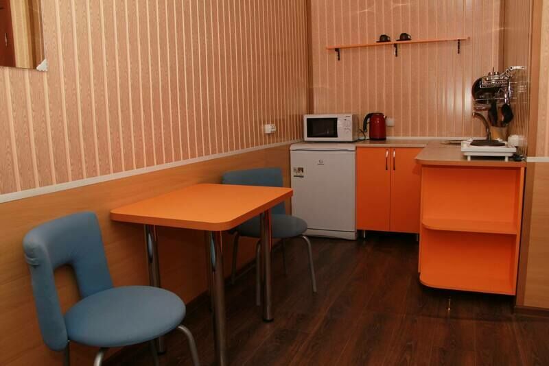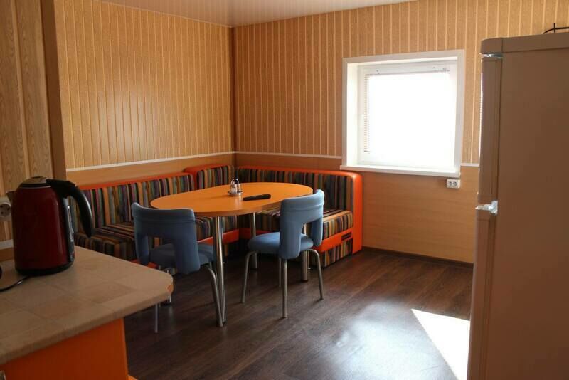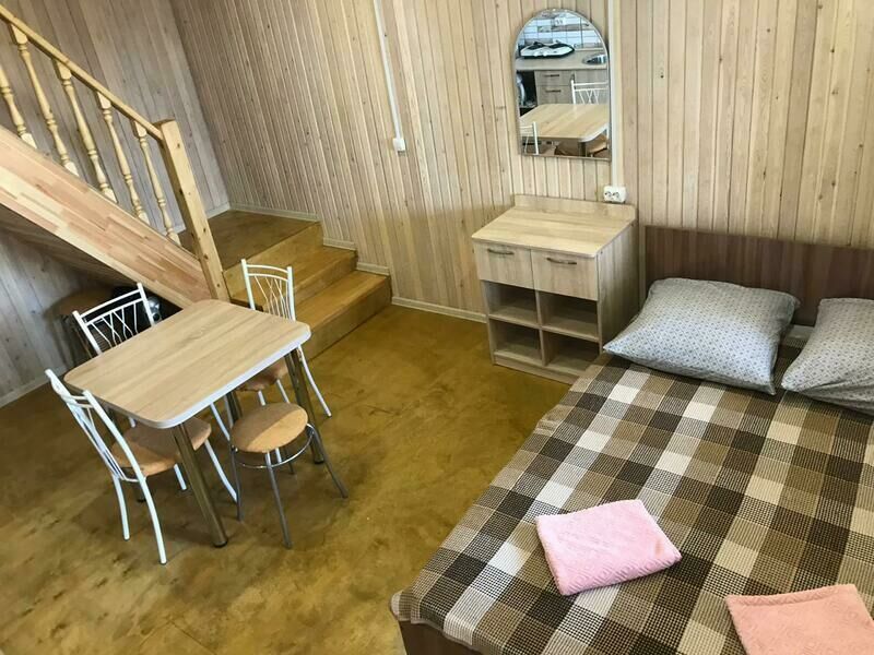 Двухуровневый номер повышенной комфортности с кондиционером, дизайнерской отделкой, подсветкой лестницы и стен. Первый уровень — кухонный гарнитур, холодильник, плита, СВЧ, посуда для приготовления и сервировки, кухонная утварь, обеденная зона, ванна и туалет (совмещены), двуспальная кровать.