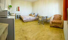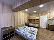 Студия оборудована кондиционером. В комнате: две односпальных кровати с мягкими изголовьями (комфортно сдвигаются в одну), комод, обувница, телевизор, обеденная зона, кухонный гарнитур, холодильник, плита, СВЧ, посуда для приготовления и сервировки, кухонная утварь. Ванная и туалет совмещены, есть раковина.