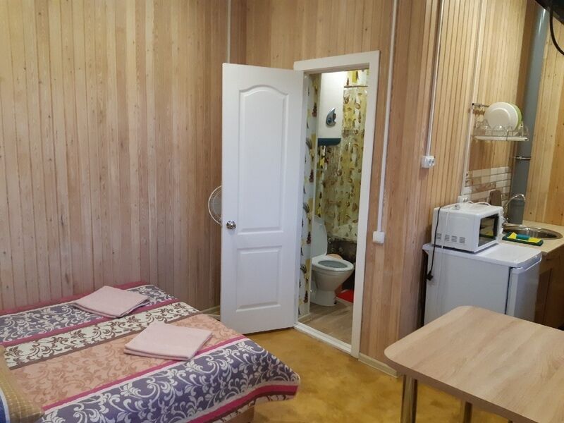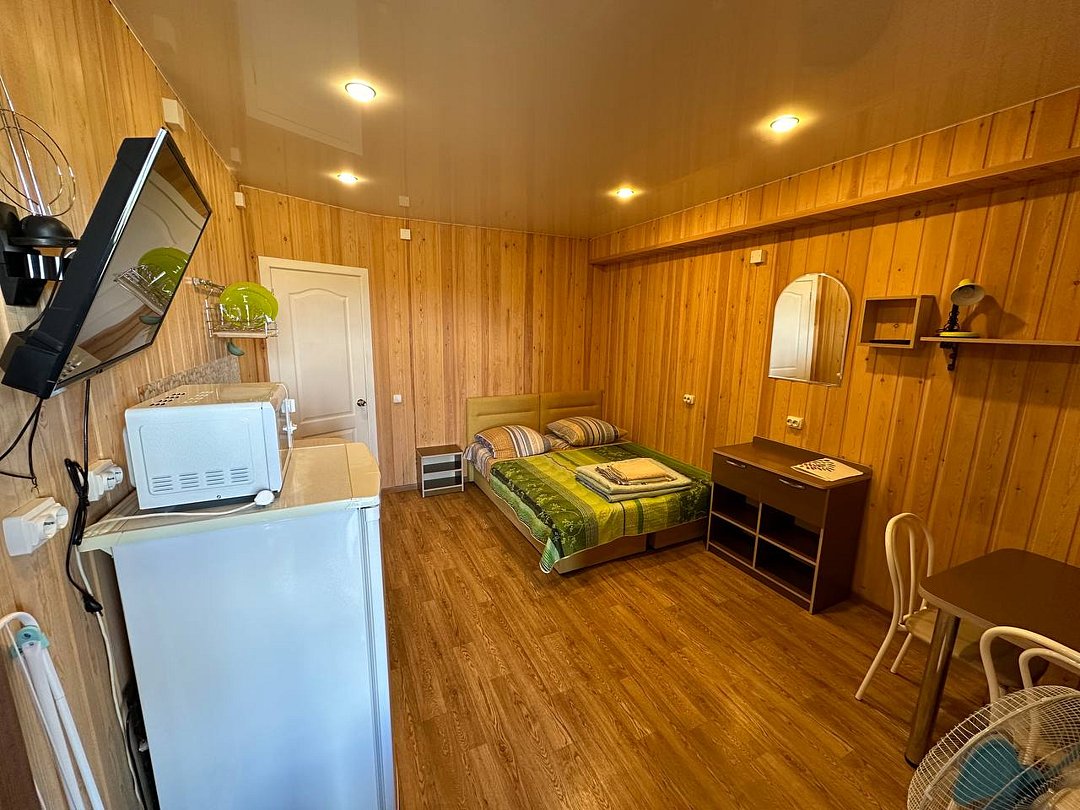 Студия оборудована кондиционером. В комнате — двуспальная кровать с мягкими изголовьем, тумбочка, обувница, телевизор, обеденная зона, кухонный гарнитур, холодильник, плита, СВЧ, посуда для приготовления и сервировки, кухонная утварь. Вид на территорию. Ванная и туалет совмещены.