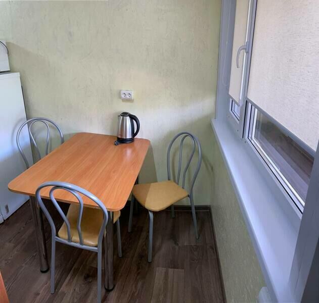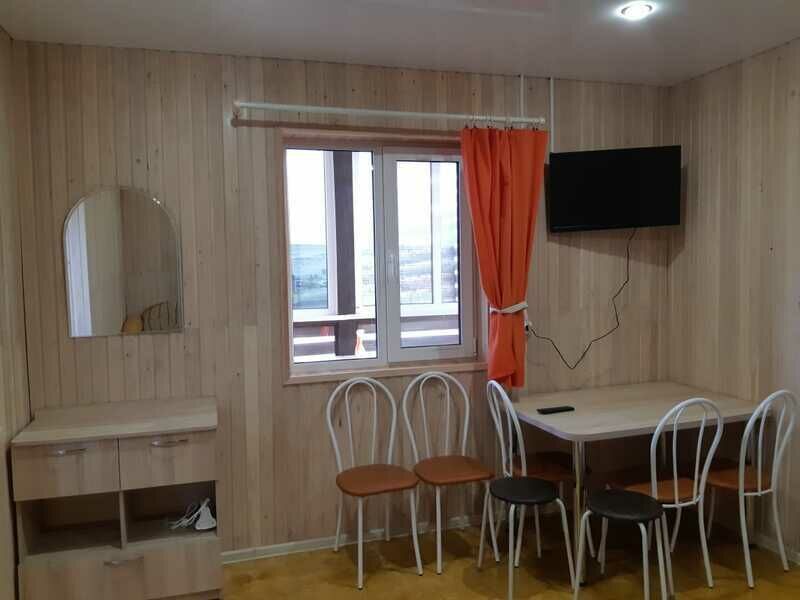 В комнате — две односпальные кровати с мягкими изголовьем (комфортно сдвигаются в одну), комод, тумбочка, обувница, телевизор, обеденная зона, кухонный гарнитур, холодильник, плита, СВЧ, посуда для приготовления и сервировки, кухонная утварь. Вид на парковку в сторону озера. Ванная и туалет раздельные, есть раковина.