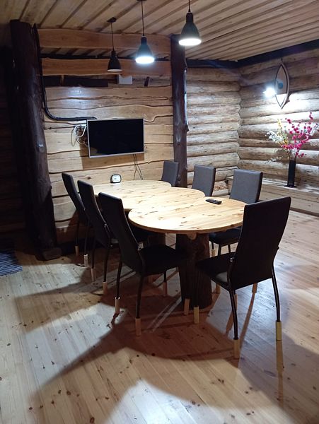 В доме 3 комнаты - спальня, комната отдыха, кухня-гостиная. Удобства: душевая кабина, туалет, кондиционер, телевизор, холодильник, чайник, индукционная плита, посуда, микроволновая печь. Баня на дровах внутри домика, можно заказать отдельно. Постели застелены, есть полотенца, мыло, шампунь, гель для душа.