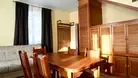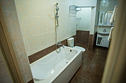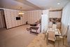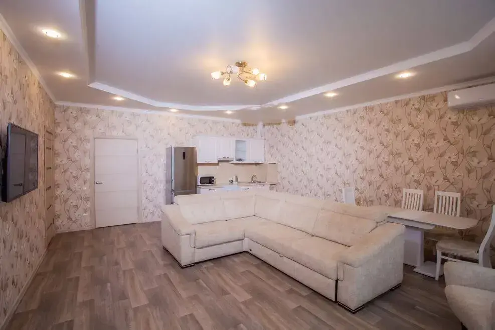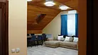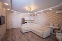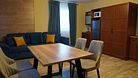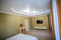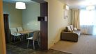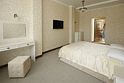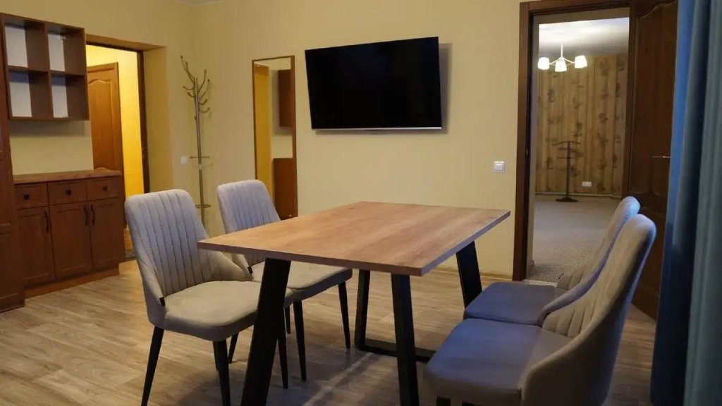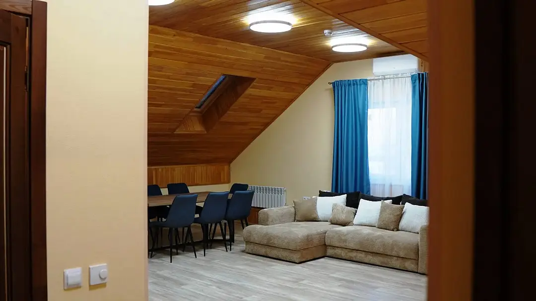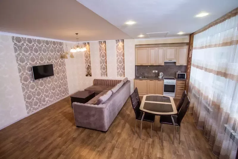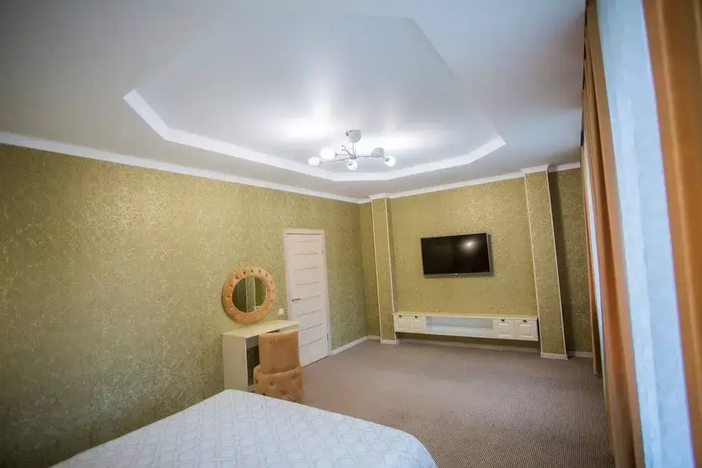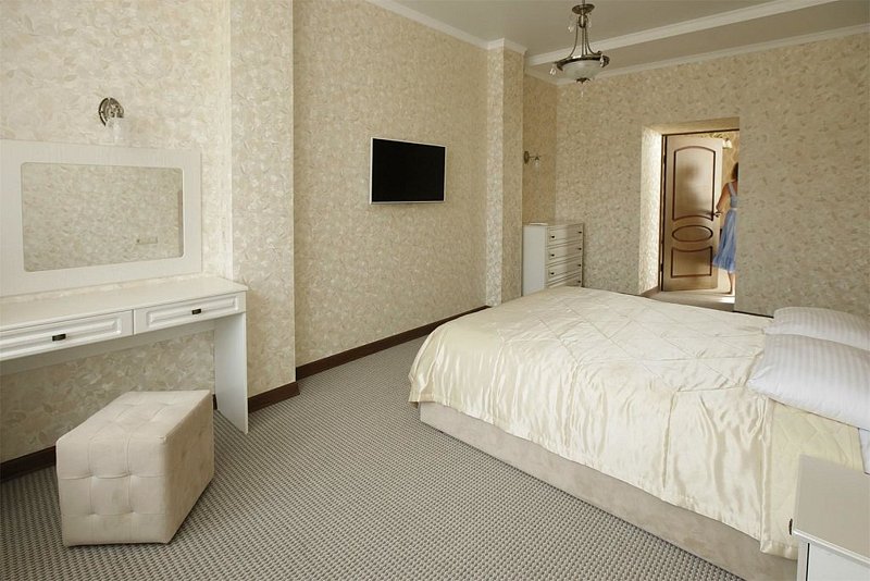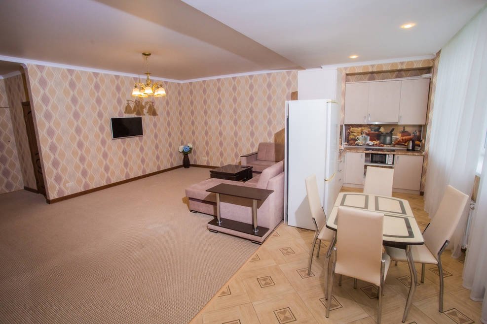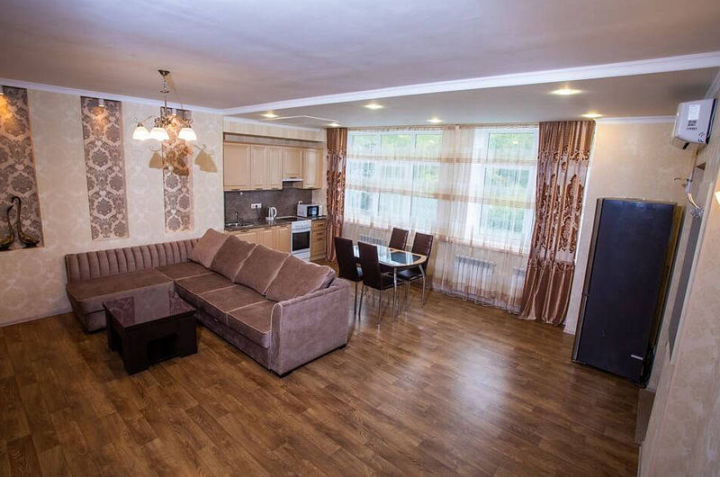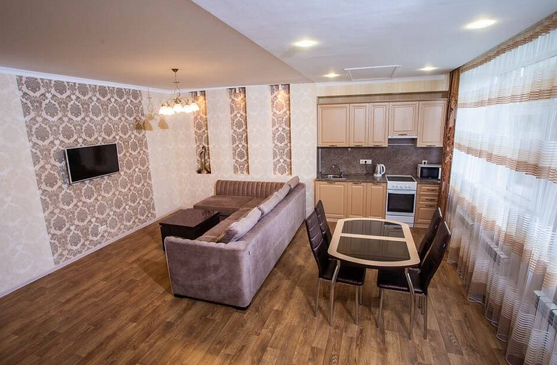 Номер вмещает до 7-ми человек. Пять спальных мест и диван. Трехкомнатный номер – две спальные комнаты, гостиная с выходом на балкон и кухонная зона. С удобствами (туалет, душ). В первой спальной комнате – три 1.5 кровати (Spring Box), две из которых при желании гостя можно объединить в двуспальную, прикроватные тумбочки. Телевизор. Во второй спальной комнате – две 1,5 кровати (Spring Box), которые при желании гостя можно объединить в двуспальную, прикроватные тумбочки. Телевизор. Туалетный столик с зеркалом и мягким креслом В гостевой комнате – большой диван, телевизор. В кухонной зоне - обеденный стол с удобными мягкими стульями, холодильник, чайник, МК-печь. Из посуды – чайный набор, фужеры, тарелки, ложки, вилки. Полотенце банное, лицевое и ножное. Фен. Гигиенические средства, тапочки - на количество гостей номера.