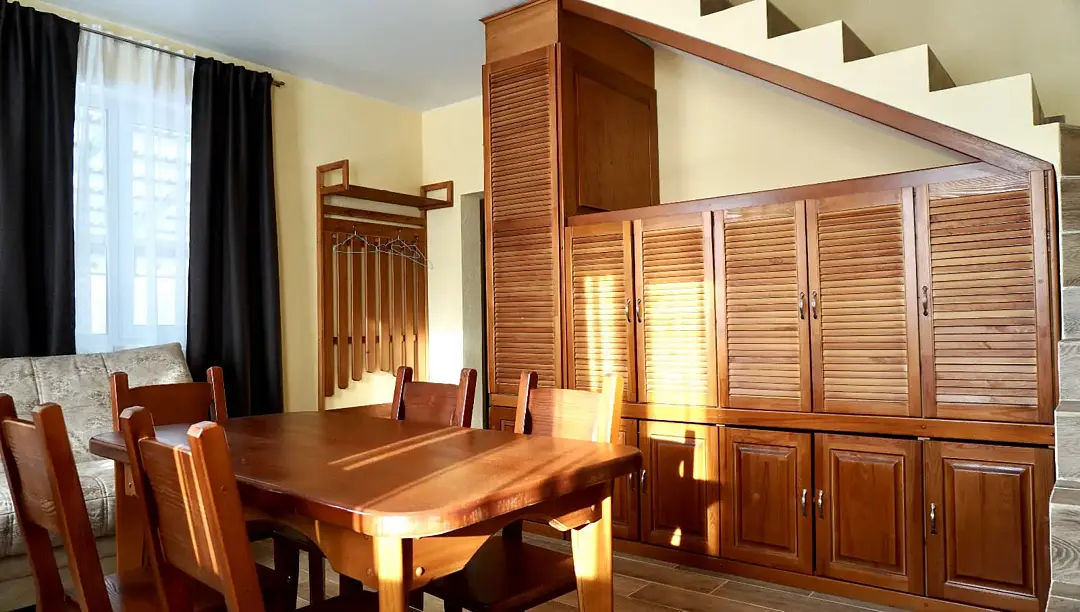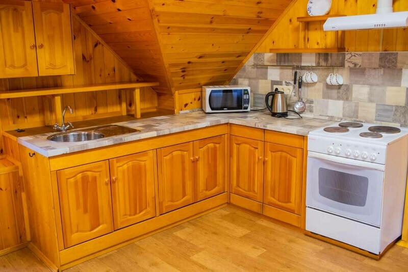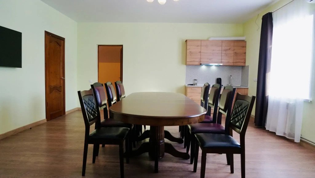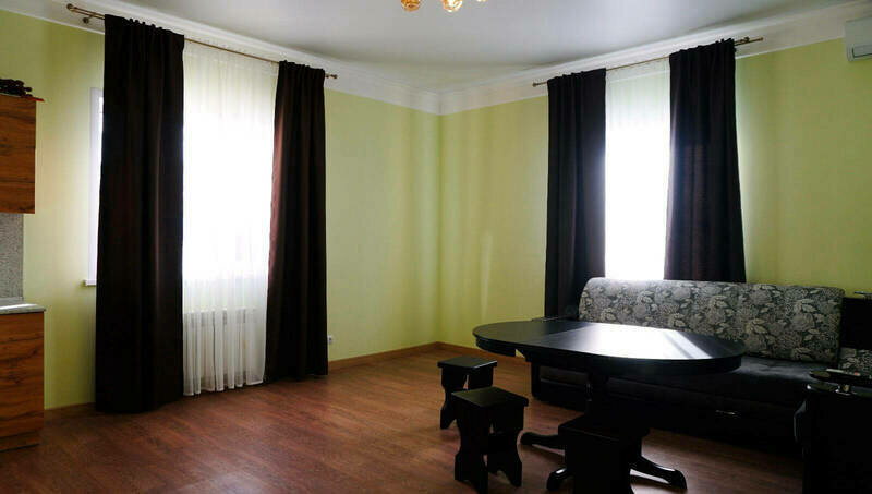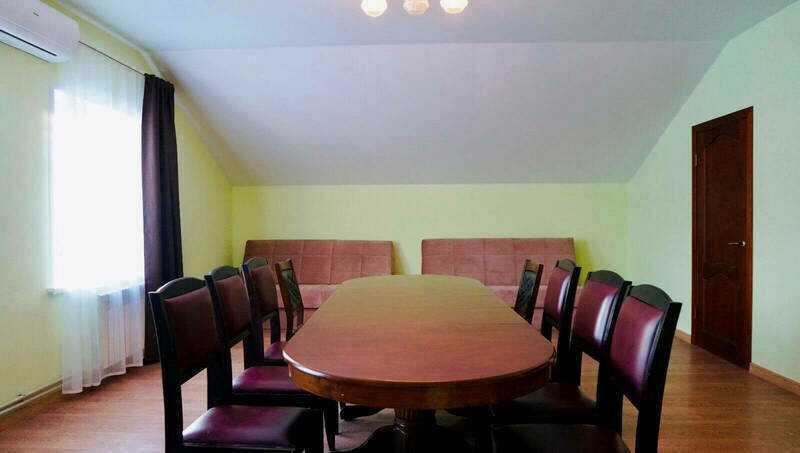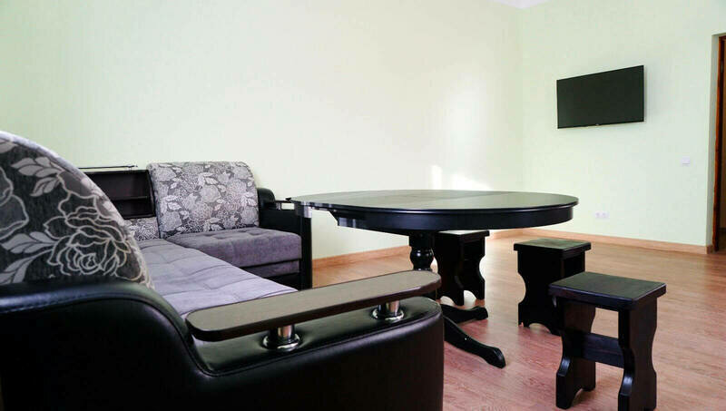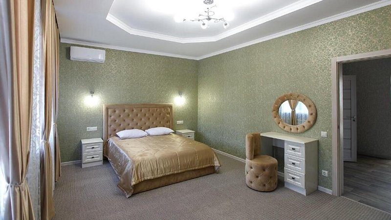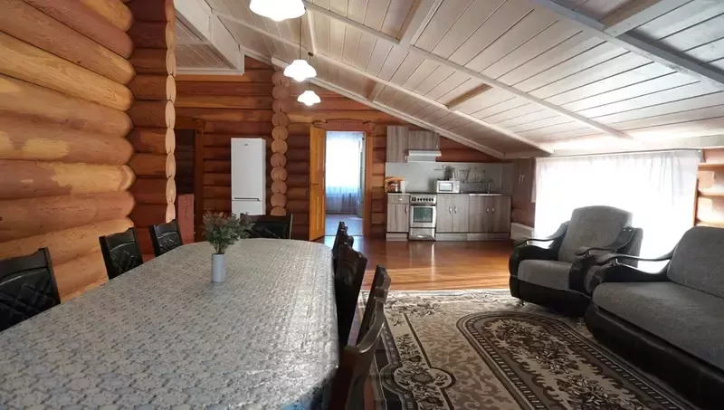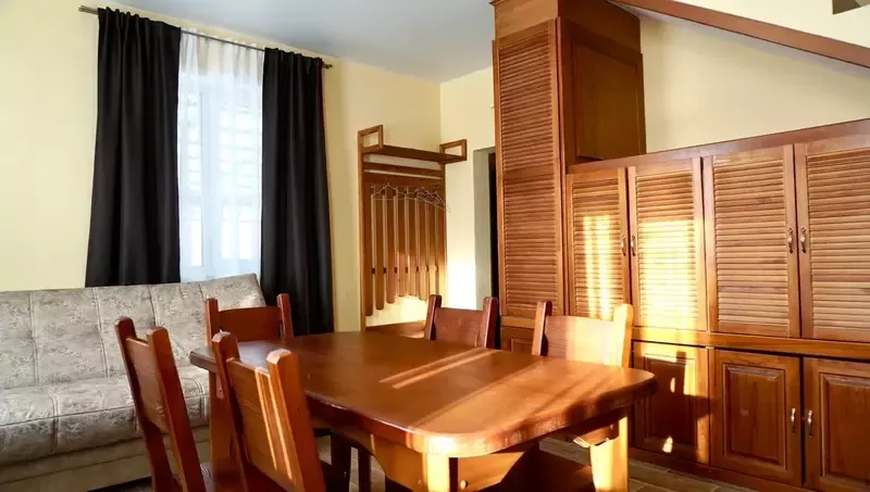 В доме большая гостиная, оборудованная кухонной зоной, микроволновая печь, электроплита, холодильник, посуда для приготовления и сервировки стола, большой диван, стол на 15 посадочных мест, три уютные спальни, в которых имеются 2-сп и 1, 5-сп кровати, телевизоры в каждой комнате, комоды. Есть шкаф для одежды. Две душевые комнаты и санузела. Рядом с домом мангальная зона.