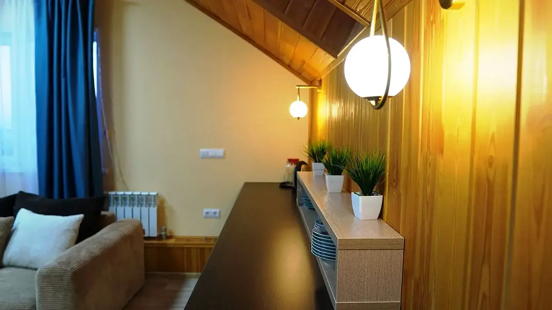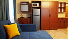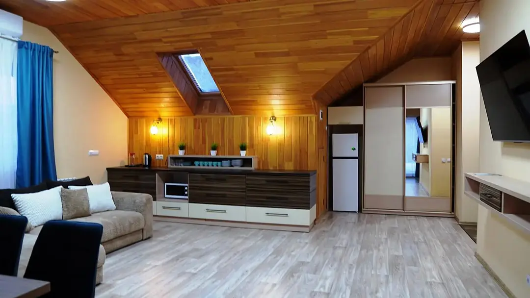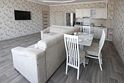Уютный номер в спокойных, пастельных тонах, создает атмосферу домашнего комфорта в лучших традициях. Здесь можно отдохнуть семьей или компанией из 2-4 человек или провести медовый месяц вдвоем. Кухонная зона организована таким образом, что здесь приятно готовить вместе.