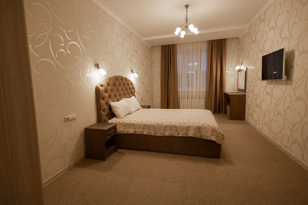 Двухкомнатные аппартоменты. Комната отдыха с двуспальной кроватью. Гостевая с кухонной зоной. Для комфортного проживания в номере есть все необходимое: ТВ, чайник, варочная панель, холодильник, мк-печь, посуда, стиральная машинка, санузел.